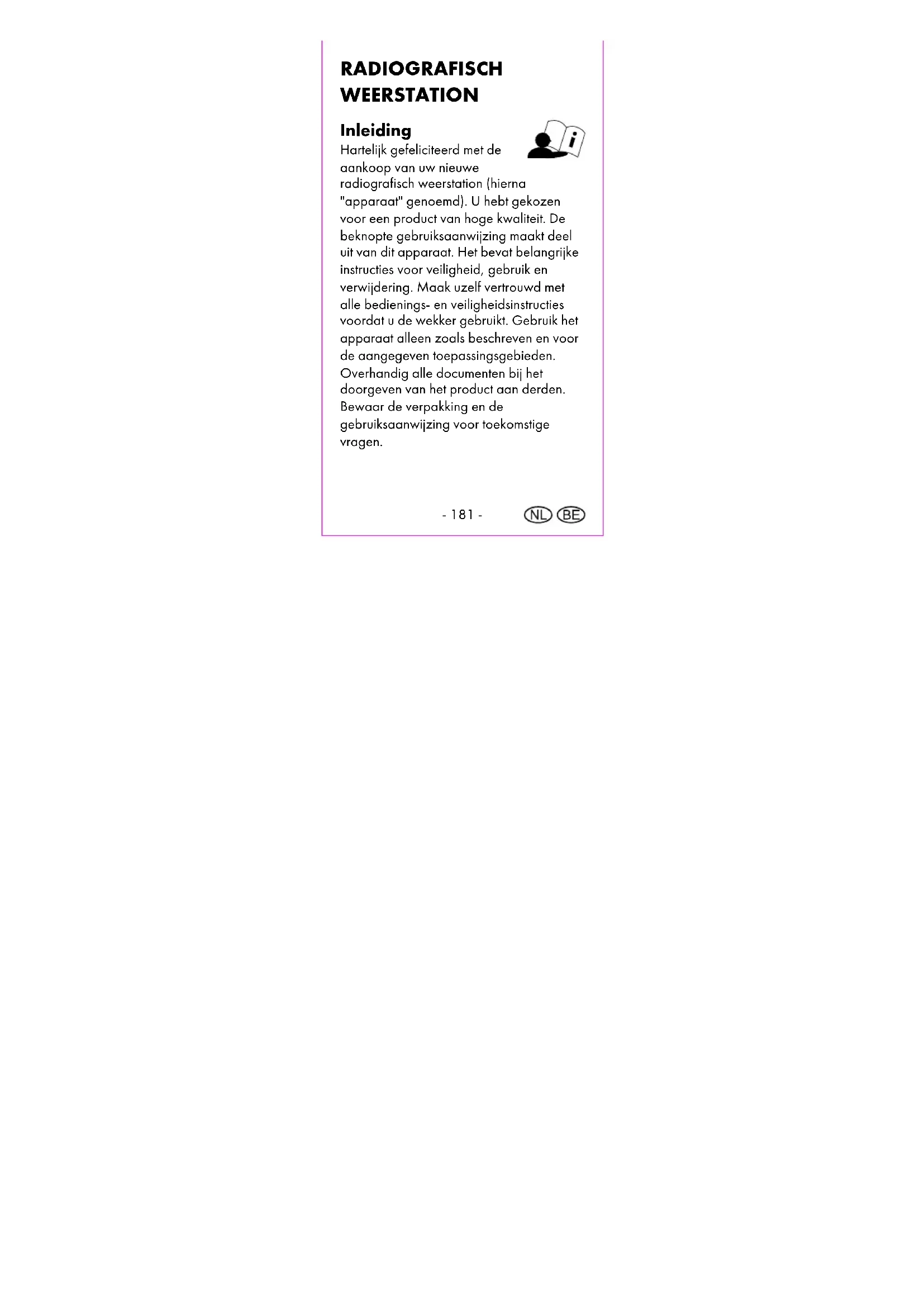 Beschermingsgraad (IP- Klasse) van de omkasting (buitensensor): IPX4 (spatwaterbeveiliging volgens Norm IEC 60529) Tijd Radio kloktijd DCF77 Radiogolven/Radiosymb ool Wekker- 188 - Belangrijke Veiligheidsinformatie Veiligheidsinformatie voor gebruiker
