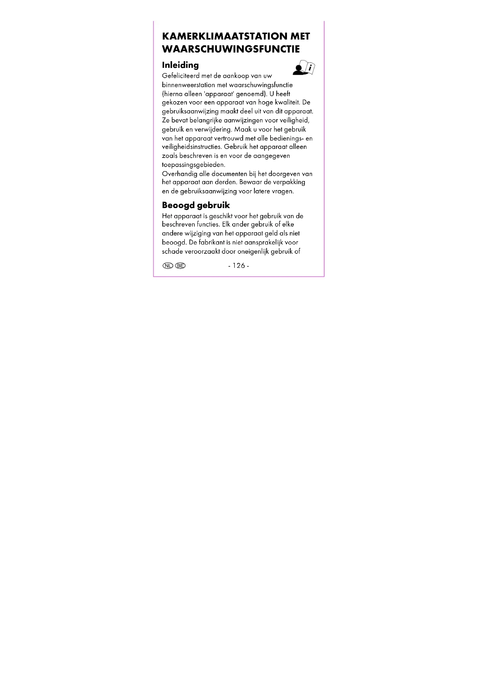 Dauwpunttemperatuur ................................- 140 - Luchtvochtigheidsgrenswaarden instellen .......- 143 - Luchtvochtigheidsalarm activeren of deactiveren ........................................................- 144 -- 125 - Comfortindex ...............................................- 144 - Kamertemperatuurweergave ...........................- 145 - Schimmelwaarschuwing instellen .....................- 146 - Griep- en hittefuncties .......................................- 147 - Griepwaarschuwingsweergave .......................- 147 - Hittewaarschuwingsweergave .........................- 148 - MAX.MIN-opname weergeven .......................- 148 - MAX.MIN-opname wissen ...............................- 149 - Batterijniveauweergave ....................................- 149 - Reinigingsinstructies ...........................................- 149 - Opslag ...............................................................- 150 - Vereenvoudigde EU-conformiteitsverklaring ..- 150 - Verwijdering ......................................................- 151 - Weggooien van het elektrische apparaat - 151 - Verwijderen van batterijen .........................- 154 - Recyclen .......................................................- 158 - Huisvuilafvoer ..............................................- 158 - Garantie van digi-tech gmbh ...........................- 159 - Garantievoorwaarden................................- 159 - Garantietermijn en wettelijke claims voor gebreken .............................................- 160 - Garantiedekking .........................................- 160 - Afhandeling van een garantiegeval ..........- 161 - Service ................................................................- 162 - Leverancier .........................................................- 164 -- 126 - KAMERKLIMAATSTATION MET WAARSCHUWINGSFUNCTIE Inleiding Gefeliciteerd met de aankoop van uw binnenweerstation met waarschuwingsfunctie (hierna alleen 'apparaat' genoemd). U heeft gekozen voor een apparaat van hoge kwaliteit. De gebruiksaanwijzing maakt deel uit van dit apparaat. Ze bevat belangrijke aanwijzingen voor veiligheid, gebruik en verwijdering. Maak u voor het gebruik van het apparaat vertrouwd met alle bedienings- en veiligheidsinstructies. Gebruik het apparaat alleen zoals beschreven is en voor de aangegeven toepassingsgebieden. Overhandig alle documenten bij het doorgeven van het apparaat aan derden. Bewaar de verpakking en de gebruiksaanwijzing voor latere vragen. Beoogd gebruik Het apparaat is geschikt voor het gebruik van de beschreven functies. Elk ander gebruik of elke andere wijziging van het apparaat geld als niet beoogd. De fabrikant is niet aansprakelijk voor schade veroorzaakt door oneigenlijk gebruik of- 127 - onjuist gebruik. Het apparaat is niet bedoeld voor commercieel gebruik. Inbegrepen in de levering Opmerking: controleer na de aankoop of alles aanwezig is. Zorg ervoor dat alle onderdelen aanwezig zijn en niet defect zijn. Als de levering onvolledig en/of onderdelen beschadigd zijn, gebruik het apparaat dan niet. Neem contact op met de serviceafdeling (zie "Beroep doen op garantie"). 1 x binnenweerstation 2 x batterijen 1,5 V AAA LR03 1 x gebruiksaanwijzing Technische gegevens Meetbereik/temperatuur: 0 °C - 50 °C Meetbereik/luchtvochtigheid: 20 % - 95 % Temperatuurweergave/tolerantie in het kernmeetbereik: +/- 1 °C Luchtvochtigheidsweergave/tolerantie in het kernmeetbereik: 41% - 80% - ±3%; overig meetbereik: ±5% Afmetingen: ca. 115 x 74 x 24 mm- 128 - Gewicht: model 1: ca. 97 g (excl. batterijen) model 2: ca. 93 g (excl. batterijen) Batterijen: 2 x 1,5 V AAA R03/LR03 - symbool voor gelijkspanning Tekenverklaring WAARSCHUWING! Dit signaalsymbool/-woord wijst op een gevaar met een gemiddeld risico, dat, wanneer het niet vermeden wordt, de dood of een ernstig letsel tot gevolg kan hebben. Opmerking: Dit signaalwoord wordt gebruikt voor aanvullende informatie.