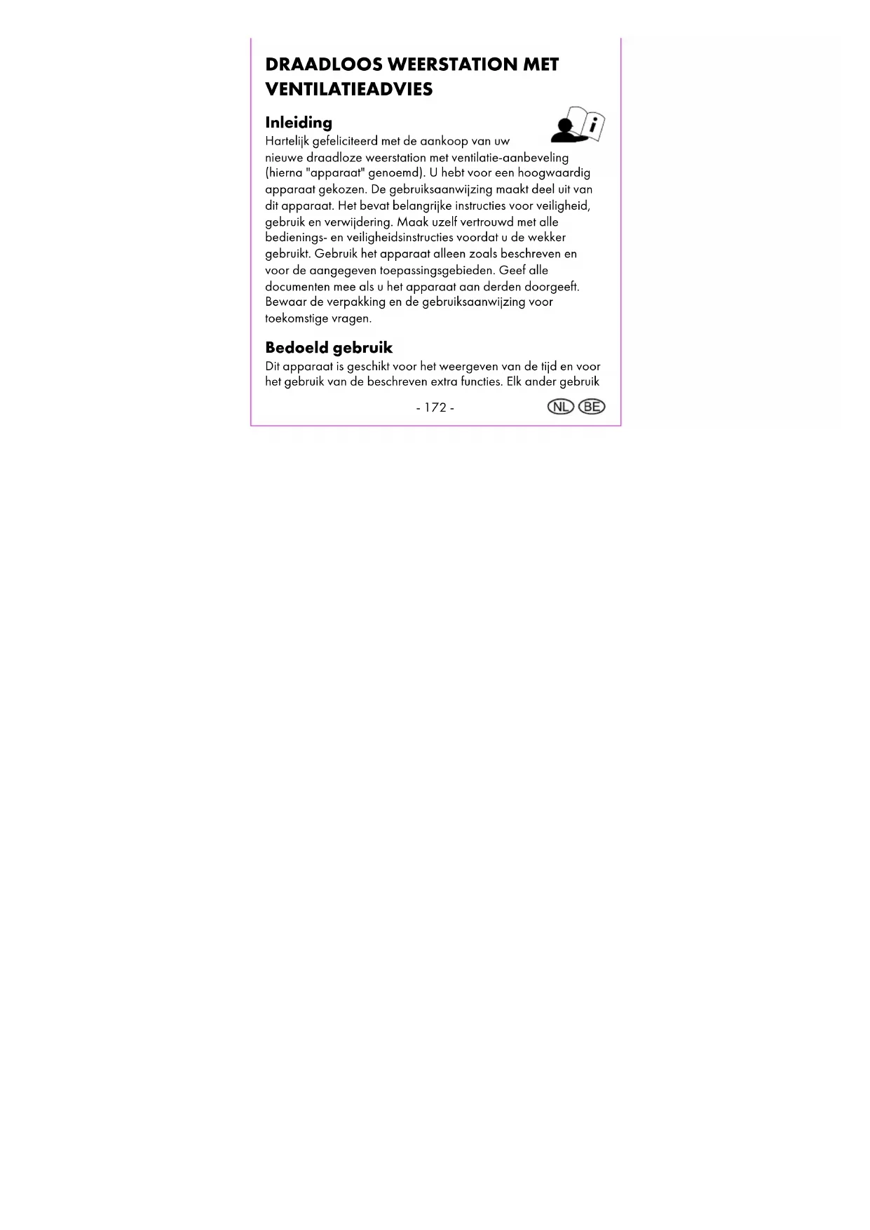 VENTILATIEADVIES Inleiding Hartelijk gefeliciteerd met de aankoop van uw nieuwe draadloze weerstation met ventilatie-aanbeveling (hierna "apparaat" genoemd). U hebt voor een hoogwaardig apparaat gekozen. De gebruiksaanwijzing maakt deel uit van dit apparaat. Het bevat belangrijke instructies voor veiligheid, gebruik en verwijdering. Maak uzelf vertrouwd met alle bedienings- en veiligheidsinstructies voordat u de wekker gebruikt. Gebruik het apparaat alleen zoals beschreven en voor de aangegeven toepassingsgebieden. Geef alle documenten mee als u het apparaat aan derden doorgeeft. Bewaar de verpakking en de gebruiksaanwijzing voor toekomstige vragen. Bedoeld gebruik Dit apparaat is geschikt voor het weergeven van de tijd en voor het gebruik van de beschreven extra functies. Elk ander gebruik- 173 - of wijziging van het apparaat geldt als oneigenlijk. De fabrikant is niet aansprakelijk voor schade veroorzaakt door onbeoogd of onjuist gebruik. Het apparaat is niet bedoeld voor commercieel gebruik. Inhoud van de verpakking Opmerking: Controleer na aankoop of de levering compleet is. Zorg ervoor dat alle onderdelen aanwezig en niet defect zijn. Gebruik het apparaat niet als de levering niet compleet is en/of onderdelen beschadigd zijn. Neem contact op met de serviceafdeling (zie 'Procedure bij een garantiegeval').
