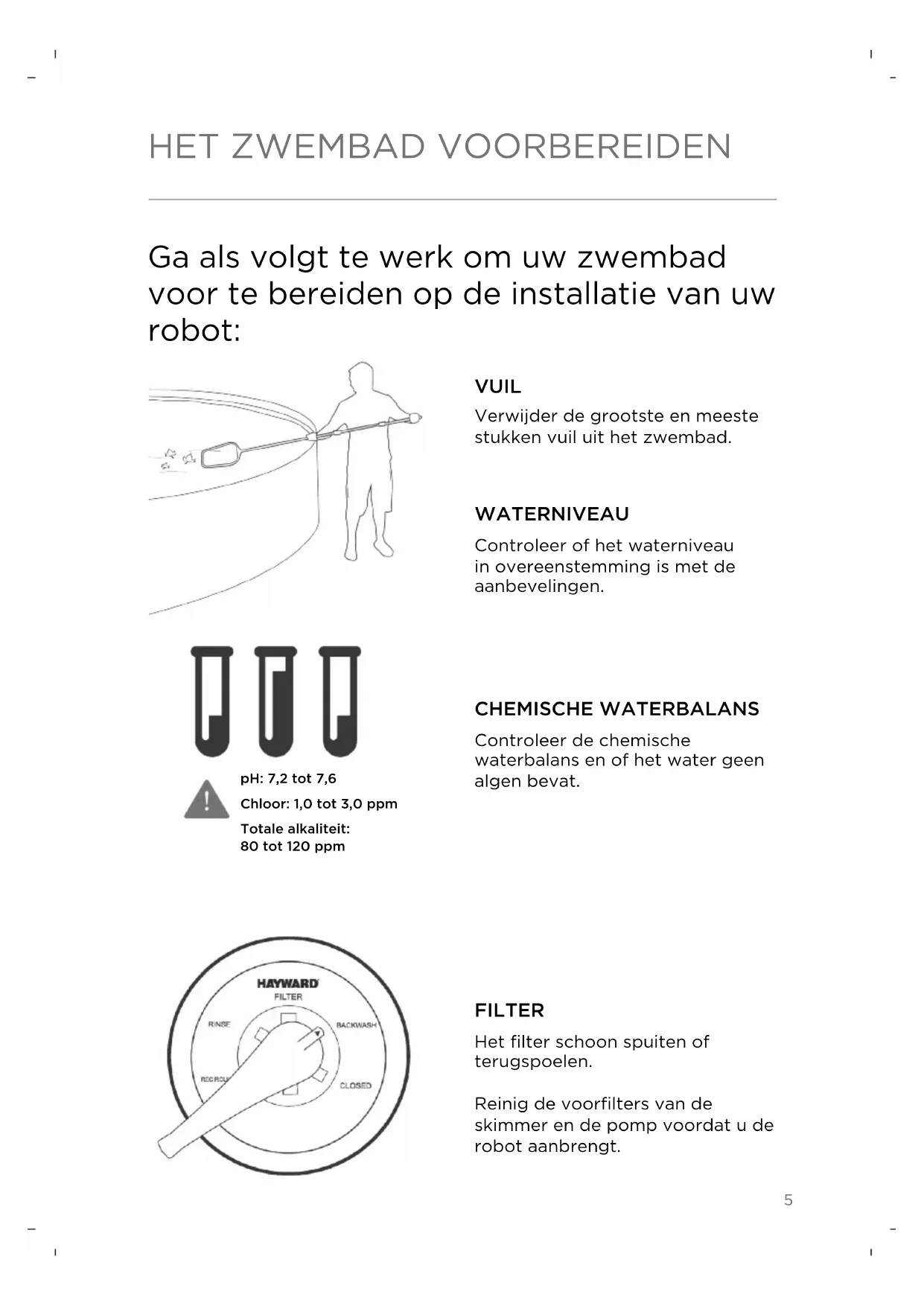 Gebruikshandleiding Wij feliciteren u met de aankoop van deze Hayward zuigrobot en bedanken u hiervoor. Uw robot is de meest eciënte en intelligente manier om uw bovengrondse zwembad te reinigen. Hayward turbinerobotten worden rechtstreeks aangesloten op het filtercircuit van het zwembad en zijn ontworpen om compatibel te zijn met de meeste systemen. De prestaties van uw robot zijn gedeeltelijk afhankelijk van deze weteraanvoer. Bovendien zijn de goede werking en de prestaties van de robot afhankelijk van een deugdelijke installatie van het systeem. Het kan zijn dat u de hulp moet inroepen van een onderhoudstechnicus om de installatie van uw zuigrobot af te ronden. Deze service zal voor uw eigen rekening zijn. Tot slot kunnen er voor uw type installatie één of meerdere speciaal voor deze robot ontworpen accessoires nodig zijn (zoals extra slanglengtes bijvoorbeeld). Neem contact op met uw Hayward distributeur voor een lijst van beschikbare accessoires en prijzen. Aankoopdatum: Serienummer:3 VEILIGHEIDSVOORSCHRIFTEN NIET gebruiken om een grote hoeveelheid afval te verwijderen uit een nieuw zwembad of na de overwintering. VERWIJDER de robot en de slang uit het zwembad, voordat u chemische producten toevoegt, ONGEACHT WELKE. NIET zwemmen, zolang de robot zich in het zwembad bevindt. De robot op een veilige plek opbergen uit het zonlicht. De slangen moeten rechtop worden opgeborgen. De slangen NIET oprollen. DEZE ZWEMBADREINIGER IS GEEN SPEELGOED. Niet gebruiken in aanwezig van kinderen. BUITEN BEREIK van kinderen en huisdieren bewaren. VERWIJDER de robot uit het zwembad, voordat het filter wordt gespoeld. VERGEET NOOIT: veiligheid komt voor alles. ONDERSCHRIFT Let op Tip Drukregeling Pomp4