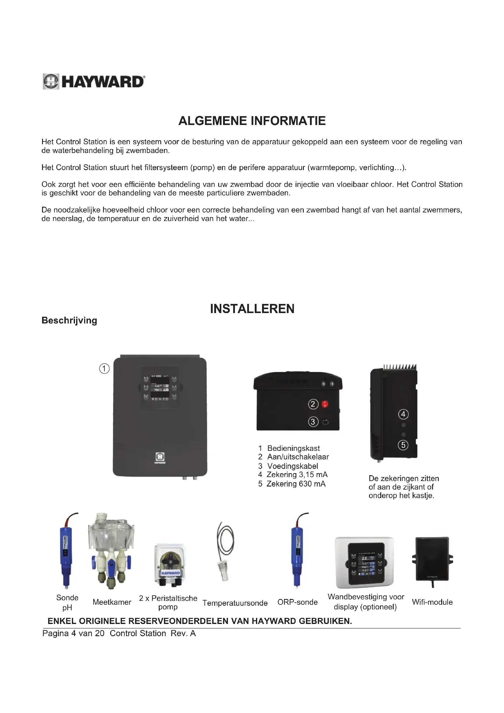 Voor uw administratie Opmerking REGISTRATIEENKEL ORIGINELE RESERVEONDERDELEN VAN HAYWARD GEBRUIKEN. Pagina 4 van 20 Control Station Rev. A ALGEMENE INFORMATIE Het Control Station is een systeem voor de besturing van de apparatuur gekoppeld aan een systeem voor de regeling van de waterbehandeling bij zwembaden. Het Control Station stuurt het filtersysteem (pomp) en de perifere apparatuur (warmtepomp, verlichting…). Ook zorgt het voor een efficiënte behandeling van uw zwembad door de injectie van vloeibaar chloor. Het Control Station is geschikt voor de behandeling van de meeste particuliere zwembaden. De noodzakelijke hoeveelheid chloor voor een correcte behandeling van een zwembad hangt af van het aantal zwemmers, de neerslag, de temperatuur en de zuiverheid van het water... INSTALLEREN Beschrijving