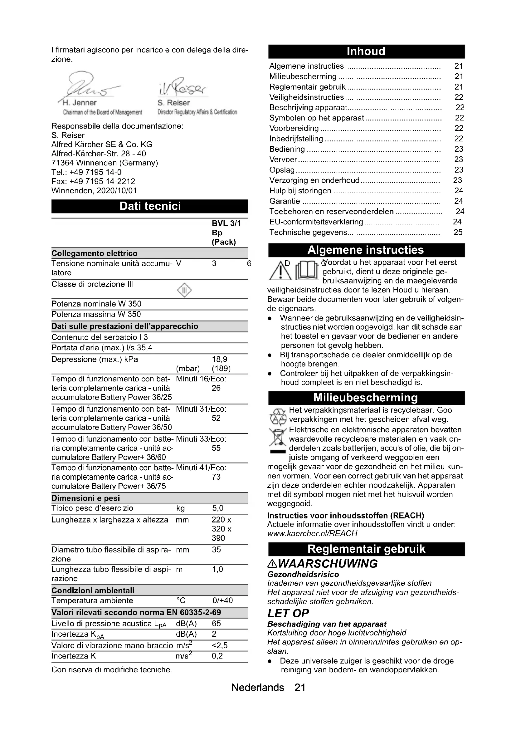 Denominazione Numero di ordinazio- ne, pezzo di ricambio Codice arti- colo, non imballato Unità accumulatore Bat- tery Power+ 36/75 2.445-043.0 6.445-059.0 Unità accumulatore Bat- tery Power+ 36/60 2.042-022.0 6.445-085.0 Unità accumulatore Bat- tery Power 36/50 2.445-031.0 6.445-039.0 Unità accumulatore Bat- tery Power 36/25 2.445-030.0 6.445-038.0 Caricabatterie rapido Bat- tery Power+ 36/60 (EU) 2.445-045.0 6.445-063.0 Caricabatterie rapido Bat- tery Power+ 36/60 (GB) 2.445-047.0 6.445-065.0 Caricabatterie rapido Bat- tery Power+ 36/60 (AU) 2.445-051.0 6.445-069.0Nederlands 21 I firmatari agiscono per incarico e con delega della dire- zione. Responsabile della documentazione: S. Reiser Alfred Kärcher SE & Co. KG Alfred-Kärcher-Str. 28 - 40 71364 Winnenden (Germany) Tel.: +49 7195 14-0 Fax: +49 7195 14-2212 Winnenden, 2020/10/01 Dati tecnici Con riserva di modifiche tecniche. Inhoud Algemene instructies Voordat u het apparaat voor het eerst gebruikt, dient u deze originele ge- bruiksaanwijzing en de meegeleverde veiligheidsinstructies door te lezen Houd u hieraan. Bewaar beide documenten voor later gebruik of volgen- de eigenaars. ● Wanneer de gebruiksaanwijzing en de veiligheidsin- structies niet worden opgevolgd, kan dit schade aan het toestel en gevaar voor de bediener en andere personen tot gevolg hebben. ● Bij transportschade de dealer onmiddellijk op de hoogte brengen. ● Controleer bij het uitpakken of de verpakkingsin- houd compleet is en niet beschadigd is. Milieubescherming Het verpakkingsmateriaal is recyclebaar. Gooi verpakkingen met het gescheiden afval weg. Elektrische en elektronische apparaten bevatten waardevolle recyclebare materialen en vaak on- derdelen zoals batterijen, accu's of olie, die bij on- juiste omgang of verkeerd weggooien een mogelijk gevaar voor de gezondheid en het milieu kun- nen vormen. Voor een correct gebruik van het apparaat zijn deze onderdelen echter noodzakelijk. Apparaten met dit symbool mogen niet met het huisvuil worden weggegooid. Instructies voor inhoudsstoffen (REACH) Actuele informatie over inhoudsstoffen vindt u onder: www.kaercher.nl/REACH Reglementair gebruik 몇 WAARSCHUWING Gezondheidsrisico Inademen van gezondheidsgevaarlijke stoffen Het apparaat niet voor de afzuiging van gezondheids- schadelijke stoffen gebruiken. LET OP Beschadiging van het apparaat Kortsluiting door hoge luchtvochtigheid Het apparaat alleen in binnenruimtes gebruiken en op- slaan. ● Deze universele zuiger is geschikt voor de droge reiniging van bodem- en wandoppervlakken. BVL 3/1