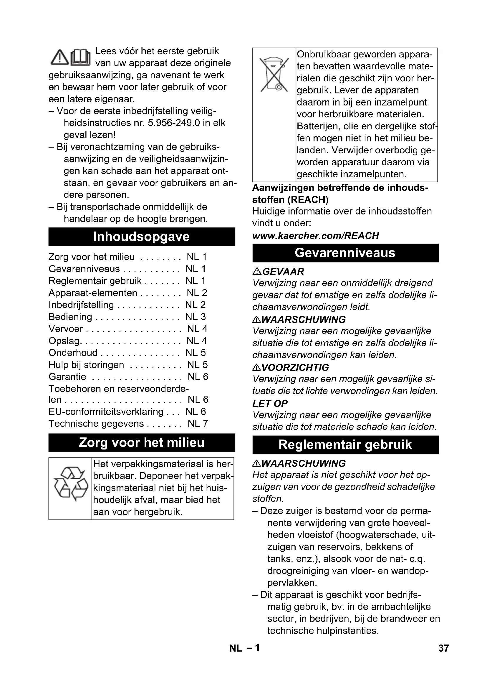 Codice com- ponente Lunghezza cavo EU 6.649-875.0 10 m 36 IT– 1 Lees vóór het eerste gebruik van uw apparaat deze originele gebruiksaanwijzing, ga navenant te werk en bewaar hem voor later gebruik of voor een latere eigenaar. – Voor de eerste inbedrijfstelling veilig- heidsinstructies nr. 5.956-249.0 in elk geval lezen! – Bij veronachtzaming van de gebruiks- aanwijzing en de veiligheidsaanwijzin- gen kan schade aan het apparaat ont- staan, en gevaar voor gebruikers en an- dere personen. – Bij transportschade onmiddellijk de handelaar op de hoogte brengen. Aanwijzingen betreffende de inhouds- stoffen (REACH) Huidige informatie over de inhoudsstoffen vindt u onder: www.kaercher.com/REACH GEVAAR Verwijzing naar een onmiddellijk dreigend gevaar dat tot ernstige en zelfs dodelijke li- chaamsverwondingen leidt. 몇 WAARSCHUWING Verwijzing naar een mogelijke gevaarlijke situatie die tot ernstige en zelfs dodelijke li- chaamsverwondingen kan leiden. 몇 VOORZICHTIG Verwijzing naar een mogelijk gevaarlijke si- tuatie die tot lichte verwondingen kan leiden. LET OP Verwijzing naar een mogelijke gevaarlijke situatie die tot materiele schade kan leiden. 몇 WAARSCHUWING Het apparaat is niet geschikt voor het op- zuigen van voor de gezondheid schadelijke stoffen. – Deze zuiger is bestemd voor de perma- nente verwijdering van grote hoeveel- heden vloeistof (hoogwaterschade, uit- zuigen van reservoirs, bekkens of tanks, enz.), alsook voor de nat- c.q. droogreiniging van vloer- en wandop- pervlakken. – Dit apparaat is geschikt voor bedrijfs- matig gebruik, bv. in de ambachtelijke sector, in bedrijven, bij de brandweer en technische hulpinstanties. Inhoudsopgave Zorg voor het milieu . . . . . . . . NL 1 Gevarenniveaus . . . . . . . . . . . NL 1 Reglementair gebruik . . . . . . . NL 1 Apparaat-elementen . . . . . . . . NL 2 Inbedrijfstelling . . . . . . . . . . . . NL 2 Bediening . . . . . . . . . . . . . . . . NL 3 Vervoer . . . . . . . . . . . . . . . . . . NL 4 Opslag. . . . . . . . . . . . . . . . . . . NL 4 Onderhoud . . . . . . . . . . . . . . . NL 5 Hulp bij storingen . . . . . . . . . . NL 5 Garantie . . . . . . . . . . . . . . . . . NL 6 Toebehoren en reserveonderde- len . . . . . . . . . . . . . . . . . . . . . . NL 6 EU-conformiteitsverklaring . . . NL 6 Technische gegevens . . . . . . . NL 7 Zorg voor het milieu Het verpakkingsmateriaal is her- bruikbaar. Deponeer het verpak- kingsmateriaal niet bij het huis- houdelijk afval, maar bied het aan voor hergebruik. Onbruikbaar geworden appara- ten bevatten waardevolle mate- rialen die geschikt zijn voor her- gebruik. Lever de apparaten daarom in bij een inzamelpunt voor herbruikbare materialen. Batterijen, olie en dergelijke stof- fen mogen niet in het milieu be- landen. Verwijder overbodig ge- worden apparatuur daarom via geschikte inzamelpunten. Gevarenniveaus Reglementair gebruik 37NL– 2 1Vlotter 2 Netkabel 3 Netstekker van het apparaat 4 Zuigslang 5 Vergrendeling van de zuigkop 6 Vuilreservoir 7 Kabelhouder van de afvoerpomp 8 Afsluitplaat 9 Stuurwielhouder 10 Zwenkwiel 11 Vloersproeier 12 Hoogteverstelling van de vloerspuitkop 13 Zuigbuis 14 Luchtinlaatleidingen 15 Zuigkop 16 Afvoerpomp 17 Wartelmoer van de afvoerpomp 18 Handgreep 19 Filterafdekking 20 Duwbeugel 21 Elleboog 22 Vlotterschakelaar van de afvoerpomp 23 Voorfilter 24 Netstekker van de afvoerpomp 25 Schakelaar „Afvoerpomp UIT“ 26 Contactdoos 27 Schakelaar „Afvoerpomp IN“ 28 Hoofdschakelaar 29 Afzuigfilter 30 Filter voor grof vuil/vlakvouwfilter 31 Aftapslang 32 Afsluitdop (GEKA-C verbinding) 33 Kabelhaak 34 Typeplaatje Het apparaat kan op 3 manieren gebruikt worden: 1 Natzuigen met afvoerpomp 2 Natzuigen zonder afvoerpomp 3 Droogzuigen Instructie: Natzuigen is ook mogelijk bij een uitgeschakelde of gedemonteerde af- voerpomp. Afvoerpomp demonteren, zie Droogzuigen. Afbeelding Borstelstrook demonteren. Rubber strippen inbouwen. Aanwijzing: De gestructueerde kant van de rubber strippen moet naar buiten wijzen. Afbeelding Zuigkop ontgrendelen en wegnemen. Papieren filterzak/vliesfilterzak naar achteren eruit trekken. Zuigkop eropzetten en vergrendelen. – Bij het opzuigen van nat vuil moet altijd het filter van papier of vlieseline verwij- derd worden. Afbeelding Zuigkop ontgrendelen en wegnemen. Membraanfilter verwijderen. Zuigkop eropzetten en vergrendelen. – Bij het opzuigen van nat vuil moet de membraanfilter altijd verwijderd worden. Filterafdekking openen. Vlakvouwfilter eruitnemen. Filter voor grof vuil inbouwen. Filterafdekking sluiten, moet hoorbaar in elkaar sluiten. Afbeelding Afsluitdop (GEKA-C verbinding) verwij- deren. Afvoerslang aansluiten (nominale wijd- te 3/4“ of groter). Afbeelding Afvalwater aflaten via de aftapslang. LET OP Tijdens het zuigen mag de filter voor grof vuil nooit verwijderd worden. – Natzuigen zonder afvoerpomp: Wij ra- den u aan een speciale filterzak (nat) te gebruiken (zie filtersystemen). Apparaat-elementen Inbedrijfstelling Natzuigen Inbouw rubber lippen Papieren filterzak/vliesfilterzak verwijderen Membraanfilter verwijderen Filter voor grof vuil inbouwen Afvoerslang aansluiten Vuil water aflaten Algemeen 38 NL– 3 – Bij het bereiken van de max. vulstand schakelt het apparaat automatisch uit. – Na het beïindigen van het natzuigen: Vlotter, schakelaar en eventueel af- voerpomp met een vochtige doek reini- gen en afdrogen. LET OP Voor het droogzuigen: afvoerpomp demon- teren en vlakvouwfilter inbouwen. Instructie: Bij het droogzuigen moet alge- meen een vlakvouwfilter gebruikt worden. LET OP Bij het zuigen mag de vlakvouwfilter nooit verwijderd worden. – Bij het opzuigen van fijn stof kan ook nog een papieren filterzak, een vliesfil- terzak of een membraanfilter gebruikt worden. Netstekker van de afvoerpomp uittrek- ken. Zuigkop ontgrendelen en wegnemen. Afbeelding Kabelhouder van de afvoerpomp ver- wijderen en vervangen door de afsluit- plaat. Voorfilter over de zuigopening trekken en verwijderen. Wartelmoer