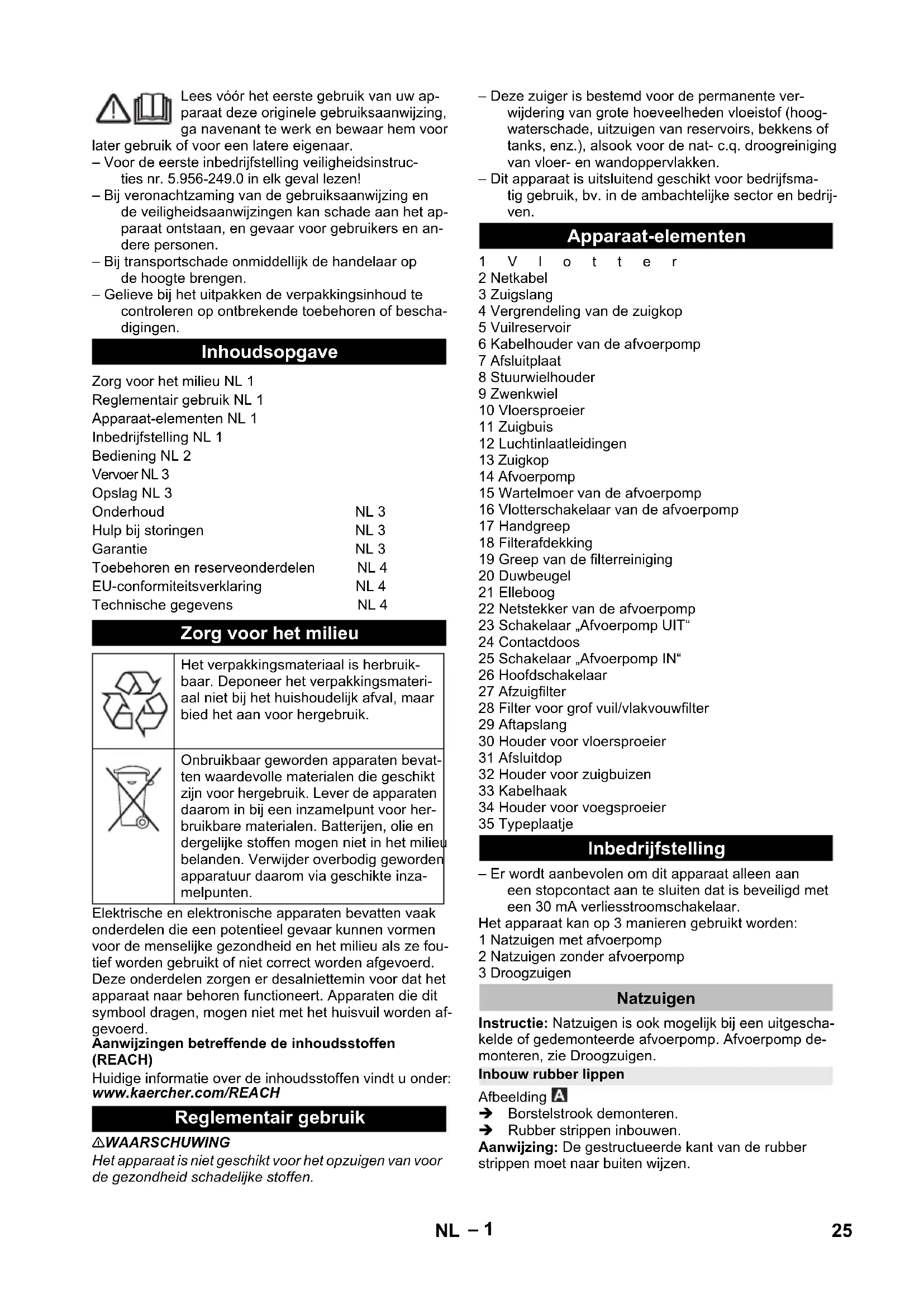 Codice compo- nente Lunghezza cavo EU 6.649-413.0 10 m CH 6.649-254.0 10 m 24 IT– 1 Lees vóór het eerste gebruik van uw ap- paraat deze originele gebruiksaanwijzing, ga navenant te werk en bewaar hem voor later gebruik of voor een latere eigenaar. – Voor de eerste inbedrijfstelling veiligheidsinstruc- ties nr. 5.956-249.0 in elk geval lezen! – Bij veronachtzaming van de gebruiksaanwijzing en de veiligheidsaanwijzingen kan schade aan het ap- paraat ontstaan, en gevaar voor gebruikers en an- dere personen. – Bij transportschade onmiddellijk de handelaar op de hoogte brengen. – Gelieve bij het uitpakken de verpakkingsinhoud te controleren op ontbrekende toebehoren of bescha- digingen. Elektrische en elektronische apparaten bevatten vaak onderdelen die een potentieel gevaar kunnen vormen voor de menselijke gezondheid en het milieu als ze fou- tief worden gebruikt of niet correct worden afgevoerd. Deze onderdelen zorgen er desalniettemin voor dat het apparaat naar behoren functioneert. Apparaten die dit symbool dragen, mogen niet met het huisvuil worden af- gevoerd. Aanwijzingen betreffende de inhoudsstoffen (REACH) Huidige informatie over de inhoudsstoffen vindt u onder: www.kaercher.com/REACH 몇 WAARSCHUWING Het apparaat is niet geschikt voor het opzuigen van voor de gezondheid schadelijke stoffen. – Deze zuiger is bestemd voor de permanente ver- wijdering van grote hoeveelheden vloeistof (hoog- waterschade, uitzuigen van reservoirs, bekkens of tanks, enz.), alsook voor de nat- c.q. droogreiniging van vloer- en wandoppervlakken. – Dit apparaat is uitsluitend geschikt voor bedrijfsma- tig gebruik, bv. in de ambachtelijke sector en bedrij- ven. 1Vlotter 2 Netkabel 3 Zuigslang 4 Vergrendeling van de zuigkop 5 Vuilreservoir 6 Kabelhouder van de afvoerpomp 7 Afsluitplaat 8 Stuurwielhouder 9 Zwenkwiel 10 Vloersproeier 11 Zuigbuis 12 Luchtinlaatleidingen 13 Zuigkop 14 Afvoerpomp 15 Wartelmoer van de afvoerpomp 16 Vlotterschakelaar van de afvoerpomp 17 Handgreep 18 Filterafdekking 19 Greep van de filterreiniging 20 Duwbeugel 21 Elleboog 22 Netstekker van de afvoerpomp 23 Schakelaar „Afvoerpomp UIT“ 24 Contactdoos 25 Schakelaar „Afvoerpomp IN“ 26 Hoofdschakelaar 27 Afzuigfilter 28 Filter voor grof vuil/vlakvouwfilter 29 Aftapslang 30 Houder voor vloersproeier 31 Afsluitdop 32 Houder voor zuigbuizen 33 Kabelhaak 34 Houder voor voegsproeier 35 Typeplaatje – Er wordt aanbevolen om dit apparaat alleen aan een stopcontact aan te sluiten dat is beveiligd met een 30 mA verliesstroomschakelaar. Het apparaat kan op 3 manieren gebruikt worden: 1 Natzuigen met afvoerpomp 2 Natzuigen zonder afvoerpomp 3 Droogzuigen Instructie: Natzuigen is ook mogelijk bij een uitgescha- kelde of gedemonteerde afvoerpomp. Afvoerpomp de- monteren, zie Droogzuigen. Afbeelding Borstelstrook demonteren. Rubber strippen inbouwen. Aanwijzing: De gestructueerde kant van de rubber strippen moet naar buiten wijzen. Inhoudsopgave Zorg voor het milieu NL 1 Reglementair gebruik NL 1 Apparaat-elementen NL 1 Inbedrijfstelling NL 1 Bediening NL 2 Vervoer NL 3 Opslag NL 3 Onderhoud NL 3 Hulp bij storingen NL 3 Garantie NL 3 Toebehoren en reserveonderdelen NL 4 EU-conformiteitsverklaring NL 4 Technische gegevens NL 4 Zorg voor het milieu Het verpakkingsmateriaal is herbruik- baar. Deponeer het verpakkingsmateri- aal niet bij het huishoudelijk afval, maar bied het aan voor hergebruik. Onbruikbaar geworden apparaten bevat- ten waardevolle materialen die geschikt zijn voor hergebruik. Lever de apparaten daarom in bij een inzamelpunt voor her- bruikbare materialen. Batterijen, olie en dergelijke stoffen mogen niet in het milieu belanden. Verwijder overbodig geworden apparatuur daarom via geschikte inza- melpunten. Reglementair gebruik Apparaat-elementen Inbedrijfstelling Natzuigen Inbouw rubber lippen 25NL– 2 Afbeelding Zuigkop ontgrendelen en wegnemen. Papieren filterzak/vliesfilterzak naar achteren eruit trekken. Zuigkop eropzetten en vergrendelen. – Bij het opzuigen van nat vuil moet altijd het filter van papier of vlieseline verwijderd worden. Afbeelding Zuigkop ontgrendelen en wegnemen. Membraanfilter verwijderen. Zuigkop eropzetten en vergrendelen. – Bij het opzuigen van nat vuil moet de membraanfil- ter altijd verwijderd worden. Filterafdekking openen. Vlakvouwfilter eruitnemen. Filter voor grof vuil inbouwen. Filterafdekking sluiten, moet hoorbaar in elkaar sluiten. Afbeelding Afsluitdop verwijderen. Afvoerslang aansluiten (nominale wijdte 3/4“ of groter). 몇 VOORZICHTIG Lokale voorschriften inzake de behandeling van afval- water in acht nemen. Afbeelding Afvalwater aflaten via de aftapslang. LET OP Tijdens het zuigen mag de filter voor grof vuil nooit ver- wijderd worden. – Natzuigen zonder afvoerpomp: Wij raden u aan een speciale filterzak (nat) te gebruiken (zie filter- systemen). – Bij het bereiken van de max. vulstand schakelt het apparaat automatisch uit. – Na het beïindigen van het natzuigen: Vlotter, scha- kelaar en eventueel afvoerpomp met een vochtige doek reinigen en afdrogen. LET OP Voor het droogzuigen: afvoerpomp demonteren en vlakvouwfilter inbouwen. Instructie: Bij het droogzuigen moet algemeen een vlakvouwfilter gebruikt worden. LET OP Bij het zuigen mag de vlakvouwfilter nooit verwijderd worden. – Bij het opzuigen van fijn stof kan ook nog een pa- pieren filterzak, een vliesfilterzak of een mem- braanfilter gebruikt worden. Netstekker van de afvoerpomp uittrekken. Zuigkop ontgrendelen en wegnemen. Afbeelding Wartelmoer van de afvoerpomp losschroeven. Kabelhouder van de afvoerpomp verwijderen en vervangen door de afsluitplaat. Afvoerpomp en kunststof inzetstuk tegelijk uit het reservoir halen aangezien de vlotterschakelaar van de afvoerpomp aan het kunststof inzetstuk is be- vestigd en anders beschadigd kan raken. Afbeelding Afsluitdop in de plaats van de afvoerslang aanbren- gen. Zuigkop eropzetten en vergrendelen. Instructie: Een vlakvouwfilter behoort niet tot het leve- ringsp