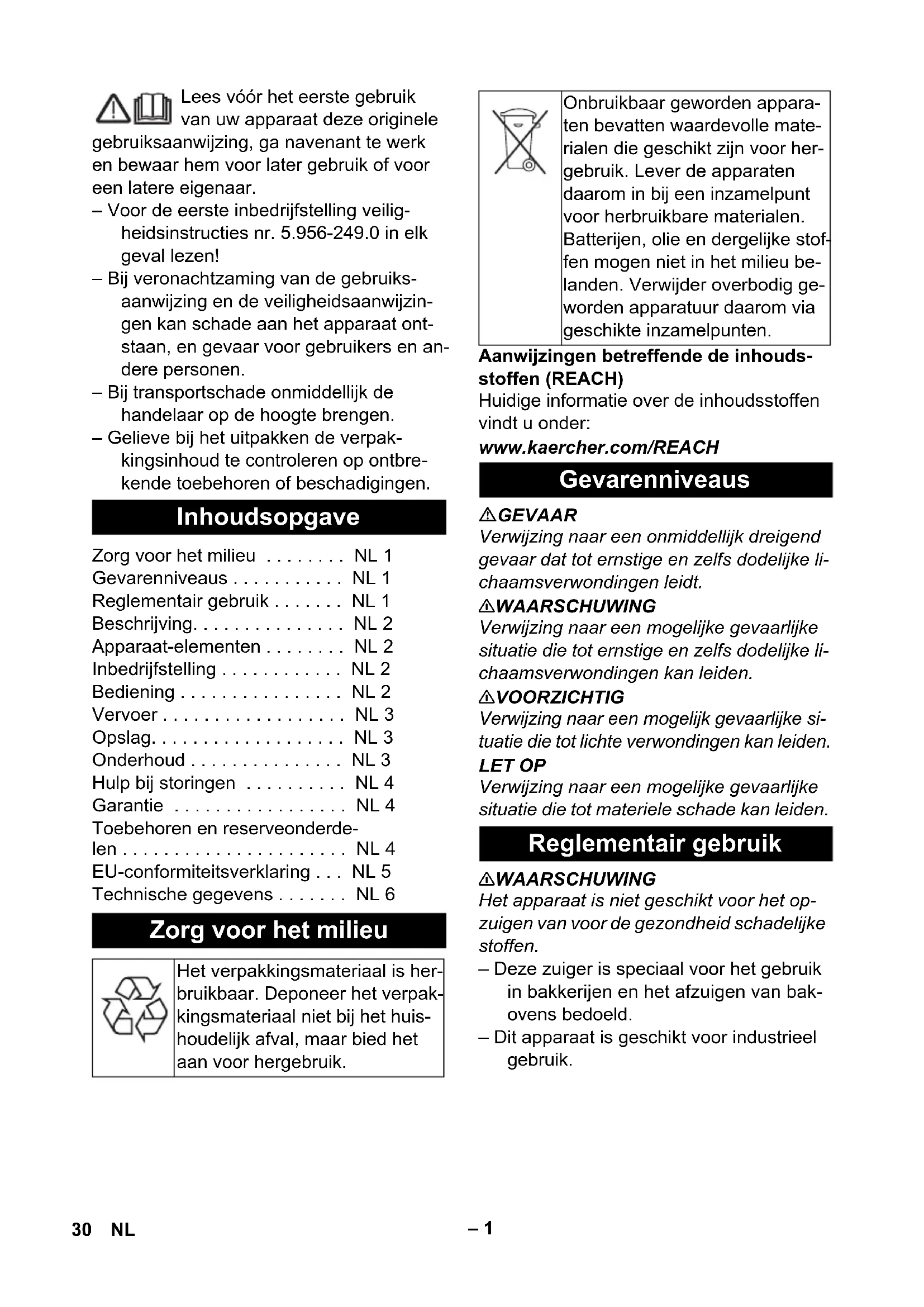 Codice com- ponente Lunghezza cavo EU 6.650-591.0 7,5 m 29IT– 1 Lees vóór het eerste gebruik van uw apparaat deze originele gebruiksaanwijzing, ga navenant te werk en bewaar hem voor later gebruik of voor een latere eigenaar. – Voor de eerste inbedrijfstelling veilig- heidsinstructies nr. 5.956-249.0 in elk geval lezen! – Bij veronachtzaming van de gebruiks- aanwijzing en de veiligheidsaanwijzin- gen kan schade aan het apparaat ont- staan, en gevaar voor gebruikers en an- dere personen. – Bij transportschade onmiddellijk de handelaar op de hoogte brengen. – Gelieve bij het uitpakken de verpak- kingsinhoud te controleren op ontbre- kende toebehoren of beschadigingen. Aanwijzingen betreffende de inhouds- stoffen (REACH) Huidige informatie over de inhoudsstoffen vindt u onder: www.kaercher.com/REACH GEVAAR Verwijzing naar een onmiddellijk dreigend gevaar dat tot ernstige en zelfs dodelijke li- chaamsverwondingen leidt. 몇 WAARSCHUWING Verwijzing naar een mogelijke gevaarlijke situatie die tot ernstige en zelfs dodelijke li- chaamsverwondingen kan leiden. 몇 VOORZICHTIG Verwijzing naar een mogelijk gevaarlijke si- tuatie die tot lichte verwondingen kan leiden. LET OP Verwijzing naar een mogelijke gevaarlijke situatie die tot materiele schade kan leiden. 몇 WAARSCHUWING Het apparaat is niet geschikt voor het op- zuigen van voor de gezondheid schadelijke stoffen. – Deze zuiger is speciaal voor het gebruik in bakkerijen en het afzuigen van bak- ovens bedoeld. – Dit apparaat is geschikt voor industrieel gebruik. Inhoudsopgave Zorg voor het milieu . . . . . . . . NL 1 Gevarenniveaus . . . . . . . . . . . NL 1 Reglementair gebruik . . . . . . . NL 1 Beschrijving. . . . . . . . . . . . . . . NL 2 Apparaat-elementen . . . . . . . . NL 2 Inbedrijfstelling . . . . . . . . . . . . NL 2 Bediening . . . . . . . . . . . . . . . . NL 2 Vervoer . . . . . . . . . . . . . . . . . . NL 3 Opslag. . . . . . . . . . . . . . . . . . . NL 3 Onderhoud . . . . . . . . . . . . . . . NL 3 Hulp bij storingen . . . . . . . . . . NL 4 Garantie . . . . . . . . . . . . . . . . . NL 4 Toebehoren en reserveonderde- len . . . . . . . . . . . . . . . . . . . . . . NL 4 EU-conformiteitsverklaring . . . NL 5 Technische gegevens . . . . . . . NL 6 Zorg voor het milieu Het verpakkingsmateriaal is her- bruikbaar. Deponeer het verpak- kingsmateriaal niet bij het huis- houdelijk afval, maar bied het aan voor hergebruik. Onbruikbaar geworden appara- ten bevatten waardevolle mate- rialen die geschikt zijn voor her- gebruik. Lever de apparaten daarom in bij een inzamelpunt voor herbruikbare materialen. Batterijen, olie en dergelijke stof- fen mogen niet in het milieu be- landen. Verwijder overbodig ge- worden apparatuur daarom via geschikte inzamelpunten. Gevarenniveaus Reglementair gebruik 30 NL– 2 – Het apparaat wordt zonder toebehoren geleverd. – De als optie beschikbare toebehoren- sets zijn speciaal ontwikkeld voor het gebruik in bakkerijen, zie toebehoren en reserveonderdelen. 1 Elektroden 2 Houder voor zuigbuis 3 Duwbeugel 4 Slanghaak 5 Luchtuitstroming, werklucht 6 Zuigkop 7 Vergrendeling van de zuigkop 8Greep 9 Vuilreservoir 10 Zwenkwiel 11 Handgreep 12 Luchttoevoer, motor-koellucht 13 Luchtinlaatleidingen 14 Aanslag voor gereedschapskist 15 Bevestigingsoog 16 Filterafdekking 17 Handgreep 18 Draaischakelaar 19 Houder voor vloerspuitkop of oven- mondstuk 20 Bevestigingsschroef van de duwbeugel 21 Netkabel 22 Filterframe 23 Vlakke harmonicafilter (PES) 24 Filterreiniging 25 Typeplaatje LET OP Bij het zuigen mag de vlakvouwfilter nooit verwijderd worden. Door de geaarde aansluitmof worden stati- sche opladingen afgeleid. Daardoor wor- den vonkvorming en stroomstoten met elektrisch geleidende toebehoren (optie) verhinderd. – Bij het opzuigen van nat vuil met de stof- of voegkop, resp. indien er over- wegend water uit een container opge- zogen wordt, raden wij u aan om de functie 'Automatische filterreiniging' uit te zetten. – Bij het bereiken van de max. vulstand schakelt het apparaat automatisch uit. – Bij niet geleidende vloeistoffen (b.v. booremulsie, oliën en vetten) wordt het toestel bij een volle container niet uitschakeld. De vulstand moet voortdurend gecontroleerd worden en de container moet tijdig geleegd worden. – Na het stoppen met natzuigen: Vlak- vouwfilter samen met de filterreiniging schoonmaken. Elektrodes met een bor- stel schoonmaken. Reservoir met een vochtige doek schoonmaken en afdro- gen. Afbeelding De zuigslang (bijzonder toebehoren) is uit- gerust met een clipsysteem. Alle onderde- len van het toebehoren met nominale wijd- te 35 mm kunnen worden aangesloten. LET OP Na max. 50 bakovenreinigingen moet de vlakvouwfilter vervangen worden. LET OP Om te garanderen dat de zuiger veilig wordt gebruikt, mag in geen enkel geval langer dan 5 minuten zonder onderbreking hete lucht (max. temperatuur 200 °C) wor- den aangezogen. Beschrijving Apparaat-elementen Inbedrijfstelling Antistatisch systeem Natzuigen Clipverbinding Bediening 31NL– 3 Steek de netstekker in de contactdoos. Draaischakelaar op gewenst program- ma zetten. Het apparaat beschikt over een speciale fil- terreiniging, vooral werkzaam bij fijn stof. Hierbij wordt de vlakke harmonicafilter elke 15 seconden (TACT MAX) of elke 60 se- conden (TACT MIN) door een luchtstroom automatisch gereinigd (pulserend geluid). Draaischakelaar op gewenst program- ma zetten (TACT MIN-TACT MAX). Afbeelding Power-reiniging (bij bijzonder sterke vervuiling van de vlakke harmonicafil- ter): Draaischakelaar op programma 2 zetten, zuigbuis of bocht met de hand sluiten en wachten op automatische fil- terreiniging (elke 15 seconden). Apparaat met de draaischakelaar uit- schakelen. Netstekker uittrekken. Reservoir leegmaken. Apparaat aan de binnen- en buitenkant reinigen door afzuigen en afvegen met een vochtige doek. Afbeelding Zuigslang (bijzonder toebehoren) en net- kabel volgens de afbeelding opbergen. Apparaat in een droge ruimte plaatsen en bev