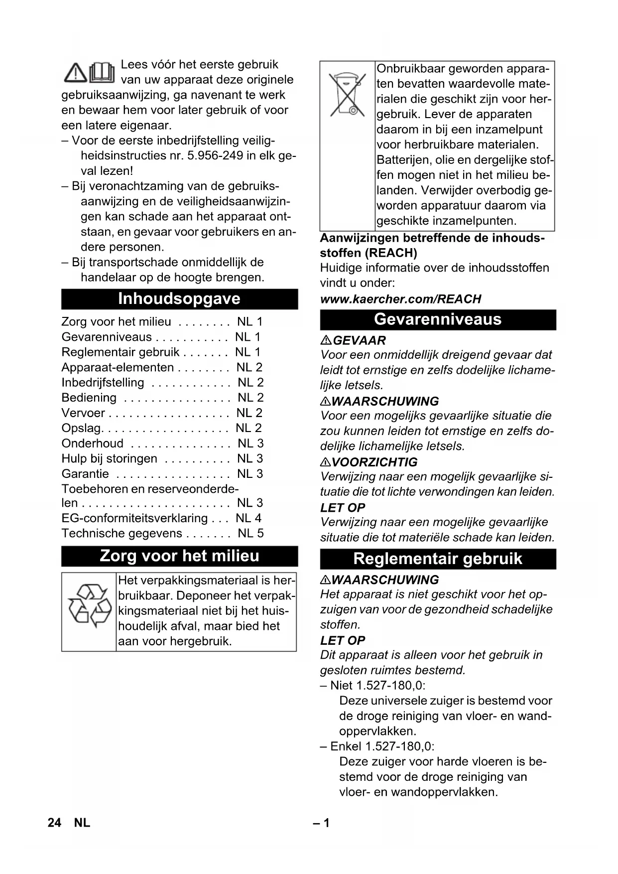 Codice com- ponente Lunghezza cavo EU 6.650-389.0 7,5 m GB 6.650-429.0 7,5 m 23IT– 1 Lees vóór het eerste gebruik van uw apparaat deze originele gebruiksaanwijzing, ga navenant te werk en bewaar hem voor later gebruik of voor een latere eigenaar. – Voor de eerste inbedrijfstelling veilig- heidsinstructies nr. 5.956-249 in elk ge- val lezen! – Bij veronachtzaming van de gebruiks- aanwijzing en de veiligheidsaanwijzin- gen kan schade aan het apparaat ont- staan, en gevaar voor gebruikers en an- dere personen. – Bij transportschade onmiddellijk de handelaar op de hoogte brengen. Aanwijzingen betreffende de inhouds- stoffen (REACH) Huidige informatie over de inhoudsstoffen vindt u onder: www.kaercher.com/REACH GEVAAR Voor een onmiddellijk dreigend gevaar dat leidt tot ernstige en zelfs dodelijke lichame- lijke letsels. 몇 WAARSCHUWING Voor een mogelijks gevaarlijke situatie die zou kunnen leiden tot ernstige en zelfs do- delijke lichamelijke letsels. 몇 VOORZICHTIG Verwijzing naar een mogelijk gevaarlijke si- tuatie die tot lichte verwondingen kan leiden. LET OP Verwijzing naar een mogelijke gevaarlijke situatie die tot materiële schade kan leiden. 몇 WAARSCHUWING Het apparaat is niet geschikt voor het op- zuigen van voor de gezondheid schadelijke stoffen. LET OP Dit apparaat is alleen voor het gebruik in gesloten ruimtes bestemd. – Niet 1.527-180,0: Deze universele zuiger is bestemd voor de droge reiniging van vloer- en wand- oppervlakken. – Enkel 1.527-180,0: Deze zuiger voor harde vloeren is be- stemd voor de droge reiniging van vloer- en wandoppervlakken. Inhoudsopgave Zorg voor het milieu . . . . . . . . NL 1 Gevarenniveaus . . . . . . . . . . . NL 1 Reglementair gebruik . . . . . . . NL 1 Apparaat-elementen . . . . . . . . NL 2 Inbedrijfstelling . . . . . . . . . . . . NL 2 Bediening . . . . . . . . . . . . . . . . NL 2 Vervoer . . . . . . . . . . . . . . . . . . NL 2 Opslag. . . . . . . . . . . . . . . . . . . NL 2 Onderhoud . . . . . . . . . . . . . . . NL 3 Hulp bij storingen . . . . . . . . . . NL 3 Garantie . . . . . . . . . . . . . . . . . NL 3 Toebehoren en reserveonderde- len . . . . . . . . . . . . . . . . . . . . . . NL 3 EG-conformiteitsverklaring . . . NL 4 Technische gegevens . . . . . . . NL 5 Zorg voor het milieu Het verpakkingsmateriaal is her- bruikbaar. Deponeer het verpak- kingsmateriaal niet bij het huis- houdelijk afval, maar bied het aan voor hergebruik. Onbruikbaar geworden appara- ten bevatten waardevolle mate- rialen die geschikt zijn voor her- gebruik. Lever de apparaten daarom in bij een inzamelpunt voor herbruikbare materialen. Batterijen, olie en dergelijke stof- fen mogen niet in het milieu be- landen. Verwijder overbodig ge- worden apparatuur daarom via geschikte inzamelpunten. Gevarenniveaus Reglementair gebruik 24 NL– 2 – Enkel 1.527-180,0: De meegeleverde vloersproeier is niet geschikt voor gebruik op tapijten. – Dit apparaat is geschikt voor bedrijfsge- bruik, bijv. voor reiniging van gebouwen (bureaus, hotels etc.), handwerkslieden op bouwwerven, voor schrijnwerkers en in de afbouw. 1 Filterzak van vlies 2 Luchtinlaatleidingen 3 Zuigslang 4 Typeplaatje 5 Handgreep 6 Slanghouder 7 Kabelhouder 8 Netkabel 9 Zuigkop 10 Vergrendeling van de zuigkop 11 Zwenkwiel 12 Vuilreservoir 13 Hoofdschakelaar 14 Omschakelaar harde oppervlakken/ vaste vloerbekleding (afhankelijk van de uitvoering) 15 Vloersproeier 16 Zuigbuis 17 Zuigkrachtregelaar (traploos) (afhankelijk van de uitvoering) 18 Elleboog 19 Hoofdfilterkorf 20 Filter voor bescherming van de motor 1 Werking met filterzak 2 Gebruik zonder filterzak Controleren, of hoofdfilterkorf in het ap- paraat aangebracht is. Zuigkop ontgrendelen en wegnemen. Hoofdfilterkorf eraf nemen. Filterzak erop steken. Hoofdfilterkorf erin zetten. Zuigkop eropzetten en vergrendelen. Steek de netstekker in de contactdoos. Schakel het apparaat aan de hoofd- schakelaar in. Niet 1.527-180,0: Omschakelaar van de vloersproeier op harde oppervlakken of vaste vloerbe- kleding zetten. Enkel ProT 200: Zuigkracht met de zuigkrachtregelaar regelen (traploos). Reiniging uitvoeren. Schakel het apparaat aan de hoofd- schakelaar uit. Netstekker uittrekken. Reservoir leegmaken. Apparaat aan de binnen- en buitenkant reinigen door afzuigen en afvegen met een vochtige doek. 몇 VOORZICHTIG Gevaar voor letsels en beschadigingen! Houd bij het transport rekening met het ge- wicht van het apparaat. Bij het transport in voertuigen moet het apparaat conform de geldige richtlijnen beveiligd worden tegen verschuiven en kantelen. 몇 VOORZICHTIG Gevaar voor letsel en beschadiging! Het gewicht van het apparaat bij opbergen in acht nemen. Het apparaat mag alleen binnen worden opgeborgen. Apparaat-elementen Inbedrijfstelling Bedrijfsmodi Montage van de filterzak Bediening Apparaat inschakelen Reinigingswerking Apparaat uitschakelen Na elk bedrijf Vervoer Opslag 25NL– 3 GEVAAR Bij alle werkzaamheden aan het apparaat, het apparaat uitschakelen en de netstekker uittrekken. Hoofdfiltermand (wasbaar) indien nodig onder stromend water reinigen. LET OP Gevaar voor beschadiging! Hoofdfilterkorf nooit nat erin zetten. Zuigkop ontgrendelen en wegnemen. Motorbeschermingsfilter eraf nemen. Plaats een nieuwe filter voor motorbe- scherming. Zuigkop eropzetten en vergrendelen. GEVAAR Bij alle werkzaamheden aan het apparaat, het apparaat uitschakelen en de netstekker uittrekken. – Motor-thermoprotector heeft gerea- geerd. Vervang de vliesfilterzak. Motorbeschermingsfilter vervangen. Alle delen op verstopping controleren. Weer inschakelen na afkoeling van de mo- torturbine na ca. 30--40 minuten. Stekker en zekering van de stroom- voorziening controleren. Stroomkabel en stekker van het appa- raat controleren. Apparaat inschakelen. Verstoppingen uit zuigkop, zuigbuis of zuigslang verwijderen. Vervang de vliesfilterzak. Hoofdfiltermand onder stromend water reinigen. Zuigkop juist erop zetten/vergrendelen. Kapotte zuigslang vervangen. Motorbeschermingsfil