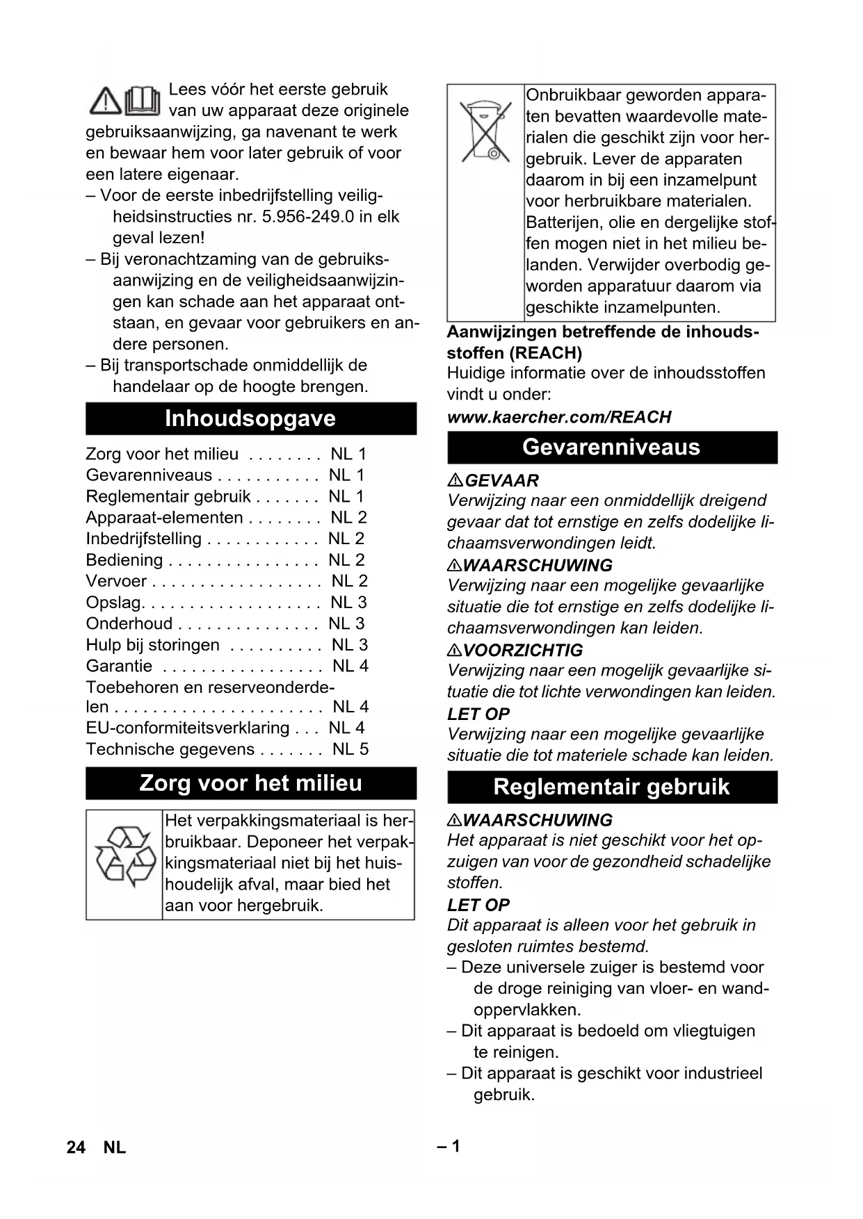 dB(A) 78 Potenza nominale assorbita W 900 Cavo di ali- mentazione SJT 2x16 AWG (105 °C) Codice com- ponente Lunghezza cavo 6.650-589.0 25 m 23IT– 1 Lees vóór het eerste gebruik van uw apparaat deze originele gebruiksaanwijzing, ga navenant te werk en bewaar hem voor later gebruik of voor een latere eigenaar. – Voor de eerste inbedrijfstelling veilig- heidsinstructies nr. 5.956-249.0 in elk geval lezen! – Bij veronachtzaming van de gebruiks- aanwijzing en de veiligheidsaanwijzin- gen kan schade aan het apparaat ont- staan, en gevaar voor gebruikers en an- dere personen. – Bij transportschade onmiddellijk de handelaar op de hoogte brengen. Aanwijzingen betreffende de inhouds- stoffen (REACH) Huidige informatie over de inhoudsstoffen vindt u onder: www.kaercher.com/REACH GEVAAR Verwijzing naar een onmiddellijk dreigend gevaar dat tot ernstige en zelfs dodelijke li- chaamsverwondingen leidt. 몇 WAARSCHUWING Verwijzing naar een mogelijke gevaarlijke situatie die tot ernstige en zelfs dodelijke li- chaamsverwondingen kan leiden. 몇 VOORZICHTIG Verwijzing naar een mogelijk gevaarlijke si- tuatie die tot lichte verwondingen kan leiden. LET OP Verwijzing naar een mogelijke gevaarlijke situatie die tot materiele schade kan leiden. 몇 WAARSCHUWING Het apparaat is niet geschikt voor het op- zuigen van voor de gezondheid schadelijke stoffen. LET OP Dit apparaat is alleen voor het gebruik in gesloten ruimtes bestemd. – Deze universele zuiger is bestemd voor de droge reiniging van vloer- en wand- oppervlakken. – Dit apparaat is bedoeld om vliegtuigen te reinigen. – Dit apparaat is geschikt voor industrieel gebruik. Inhoudsopgave Zorg voor het milieu . . . . . . . . NL 1 Gevarenniveaus . . . . . . . . . . . NL 1 Reglementair gebruik . . . . . . . NL 1 Apparaat-elementen . . . . . . . . NL 2 Inbedrijfstelling . . . . . . . . . . . . NL 2 Bediening . . . . . . . . . . . . . . . . NL 2 Vervoer . . . . . . . . . . . . . . . . . . NL 2 Opslag. . . . . . . . . . . . . . . . . . . NL 3 Onderhoud . . . . . . . . . . . . . . . NL 3 Hulp bij storingen . . . . . . . . . . NL 3 Garantie . . . . . . . . . . . . . . . . . NL 4 Toebehoren en reserveonderde- len . . . . . . . . . . . . . . . . . . . . . . NL 4 EU-conformiteitsverklaring . . . NL 4 Technische gegevens . . . . . . . NL 5 Zorg voor het milieu Het verpakkingsmateriaal is her- bruikbaar. Deponeer het verpak- kingsmateriaal niet bij het huis- houdelijk afval, maar bied het aan voor hergebruik. Onbruikbaar geworden appara- ten bevatten waardevolle mate- rialen die geschikt zijn voor her- gebruik. Lever de apparaten daarom in bij een inzamelpunt voor herbruikbare materialen. Batterijen, olie en dergelijke stof- fen mogen niet in het milieu be- landen. Verwijder overbodig ge- worden apparatuur daarom via geschikte inzamelpunten. Gevarenniveaus Reglementair gebruik 24 NL– 2 1 Filterzak van vlies 2 Luchtinlaatleidingen 3 Zuigslang 4Typeplaatje 5 Kabelhaak 6 Handgreep 7 Netkabel 8 Zuigkop 9 Vergrendeling van de zuigkop 10 Zwenkwiel 11 Vuilreservoir 12 Hoofdschakelaar 13 Omschakelaar harde oppervlakken/ vaste vloerbekleding 14 Vloersproeier 15 Zuigbuis 16 Netsnoerfixering 17 Opname voor vloerspuitkop 18 Vergrendeling van de afdekking 19 Afdekking 20 Zuigkrachtregelaar (traploos) 21 Elleboog 22 Filterhuis 23 Afzuigfilter 24 Hoofdfilterkorf 25 Filter voor bescherming van de motor 26 Rooster van het motorbeschermingsfil- ter – Bedieningselementen voor het reini- gingsproces zijn geel. – Bedieningselementen voor het onder- houd en de service zijn lichtgrijs. Controleren, of hoofdfilterkorf in het ap- paraat aangebracht is. 1 Gebruik met filterzak van vlies of filter- zak van papier (extra accessoire) 2 Gebruik zonder filterzak Zuigkop ontgrendelen en wegnemen. Hoofdfilterkorf eraf nemen. Vliesfilterzak of papieren filterzak (extra toebehoren) aanbrengen. Hoofdfilterkorf erin zetten. Zuigkop eropzetten en vergrendelen. Steek de netstekker in de contactdoos. Schakel het apparaat aan de hoofd- schakelaar in. Omschakelaar van de vloersproeier op harde oppervlakken of vaste vloerbe- kleding zetten. Zuigkracht met de zuigkrachtregelaar regelen (traploos). Reiniging uitvoeren. Schakel het apparaat aan de hoofd- schakelaar uit. Netstekker uittrekken. Reservoir leegmaken. Apparaat aan de binnen- en buitenkant reinigen door afzuigen en afvegen met een vochtige doek. 몇 VOORZICHTIG Gevaar voor letsels en beschadigingen! Houd bij het transport rekening met het ge- wicht van het apparaat. Bij het transport in voertuigen moet het apparaat conform de geldige richtlijnen beveiligd worden tegen verschuiven en kantelen. Apparaat-elementen Kleurmarkering Inbedrijfstelling Bedrijfsmodi Montage van de filterzak Bediening Apparaat inschakelen Reinigingswerking Apparaat uitschakelen Na elk bedrijf Vervoer 25NL– 3 몇 VOORZICHTIG Gevaar voor letsel en beschadiging! Het gewicht van het apparaat bij opbergen in acht nemen. Het apparaat mag alleen binnen worden opgeborgen. GEVAAR Bij alle werkzaamheden aan het apparaat, het apparaat uitschakelen en de netstekker uittrekken. Hoofdfiltermand (wasbaar) indien nodig onder stromend water reinigen. LET OP Gevaar voor beschadiging! Hoofdfilterkorf nooit nat erin zetten. Afzuigfilter: 1x per jaar vervangen Afdekking ontgrendelen en afnemen. Filterbehuizing eruit nemen. Afzuigfilter uit het filterhuis nemen. Nieuwe afzuigfilter in filterhuis plaatsen. Filterbehuizing erin zetten. Afdekking aanbrengen en vergrendelen. Zuigkop ontgrendelen en wegnemen. Rooster van motorbeschermingsfilter naar beneden drukken, draaien en eruit nemen. Motorbeschermingsfilter eraf nemen. Nieuw motorbeschermingsfilter plaatsen. Rooster van motorbeschermingsfilter erin zetten en vastklikken. Zuigkop eropzetten en vergrendelen. GEVAAR Bij alle werkzaamheden aan het apparaat, het apparaat uitschakelen en de netstekker uittrekken. – Motor-thermoprotector heeft gerea- geerd. Filterzak van vlies of filterzak van papier (extra accessoire) vervangen. Mot