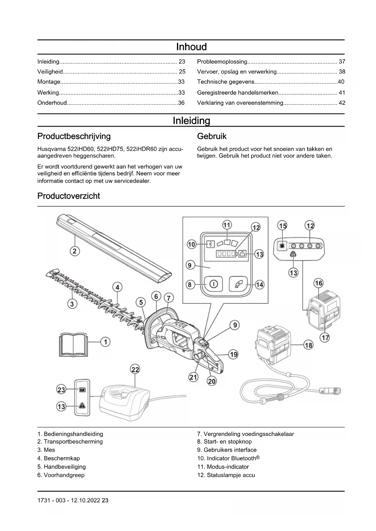 -woordmerk en de logo's zijn geregistreerde handelsmerken die eigendom zijn van Bluetooth SIG, inc. en het gebruik van deze merken door Husqvarna vindt plaats onder licentie. 1731 - 003 - 12.10.2022 41Verklaring van overeenstemming EU-verklaring van overeenstemming Wij, Husqvarna AB, SE-561 82 Huskvarna, Zweden, tel: +46-36-146500, verklaren onder onze alleenverantwoordelijkheid dat het product: Beschrijving Taille-haies sur batterie Merk Husqvarna Type / model 522iHD60, 522iHD75, 522iHDR60 Identificatie Serienummers vanaf 2022 en verder volledig voldoet aan de volgende EU-richtlijnen en -regelgeving: Verordening Beschrijving 2006/42/EG "betreffende machines" 2014/30/EU "betreffende elektromagnetische compatibiliteit" 2000/14/EG "betreffende de geluidsemissies in het milieu" 2011/65/EU "inzake beperking van het gebruik van bepaalde gevaarlijke stoffen in elektrische en elektro- nische apparatuur" en dat de volgende normen en/of technische specificaties zijn toegepast: EN 62841-1:2015, EN 62841-4-2:2019, EN 61000-6-3:2007/A1:2011, EN 55014-1:2017/A11:2020, EN 61000-6-1:2007, EN 55014-2:2015, CEI/EN 61000:2018. *Voor producten die zijn uitgerust met Bluetooth