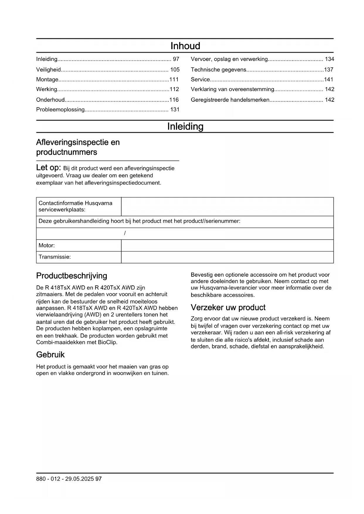Motor: Transmissie: Productbeschrijving De R 418TsX AWD en R 420TsX AWD zijn zitmaaiers. Met de pedalen voor vooruit en achteruit rijden kan de bestuurder de snelheid moeiteloos aanpassen. R 418TsX AWD en R 420TsX AWD hebben vierwielaandrijving (AWD) en 2 urentellers tonen het aantal uren dat de gebruiker het product heeft gebruikt. De producten hebben koplampen, een opslagruimte en een trekhaak. De producten worden gebruikt met Combi-maaidekken met BioClip. Gebruik Het product is gemaakt voor het maaien van gras op open en vlakke ondergrond in woonwijken en tuinen. Bevestig een optionele accessoire om het product voor andere doeleinden te gebruiken. Neem contact op met uw Husqvarna-leverancier voor meer informatie over de beschikbare accessoires. Verzeker uw product Zorg ervoor dat uw nieuwe product verzekerd is. Neem bij twijfel of vragen over verzekering contact op met uw verzekeraar. Wij raden u aan een all-risk verzekering af te sluiten die alle risico's afdekt, inclusief schade aan derden, brand, schade, diefstal en aansprakelijkheid.