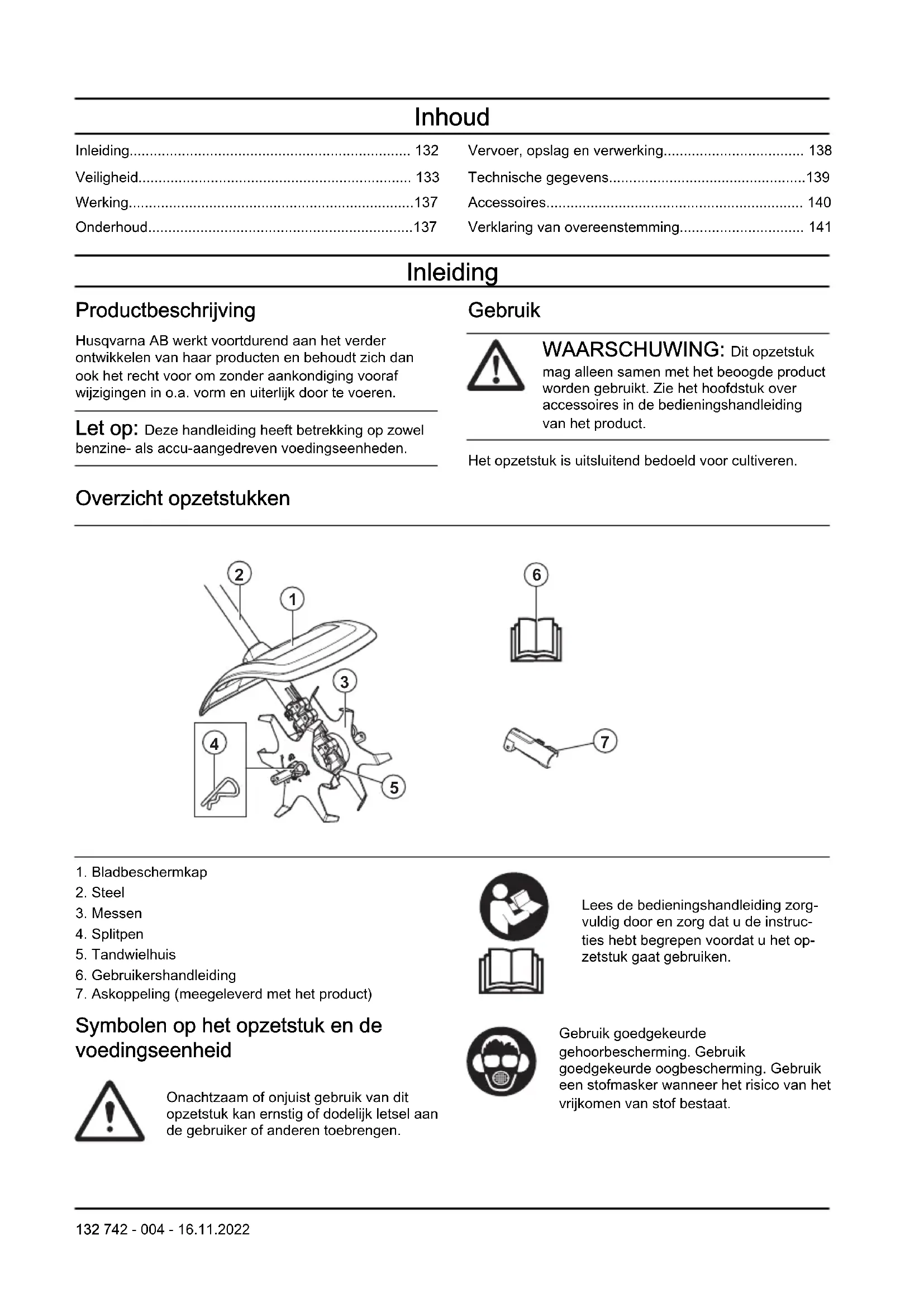 - Verklaring van overeenstemming Inleiding Productbeschrijving Husqvarna AB werkt voortdurend aan het verder ontwikkelen van haar producten en behoudt zich dan ook het recht voor om zonder aankondiging vooraf wijzigingen in o.a. vorm en uiterlijk door te voeren. Let op: Deze handleiding heeft betrekking op zowel benzine- als accu-aangedreven voedingseenheden. Gebruik WAARSCHUWING: Dit opzetstuk mag alleen samen met het beoogde product worden gebruikt. Zie het hoofdstuk over accessoires in de bedieningshandleiding van het product. Het opzetstuk is uitsluitend bedoeld voor cultiveren. Overzicht opzetstukken p. 141