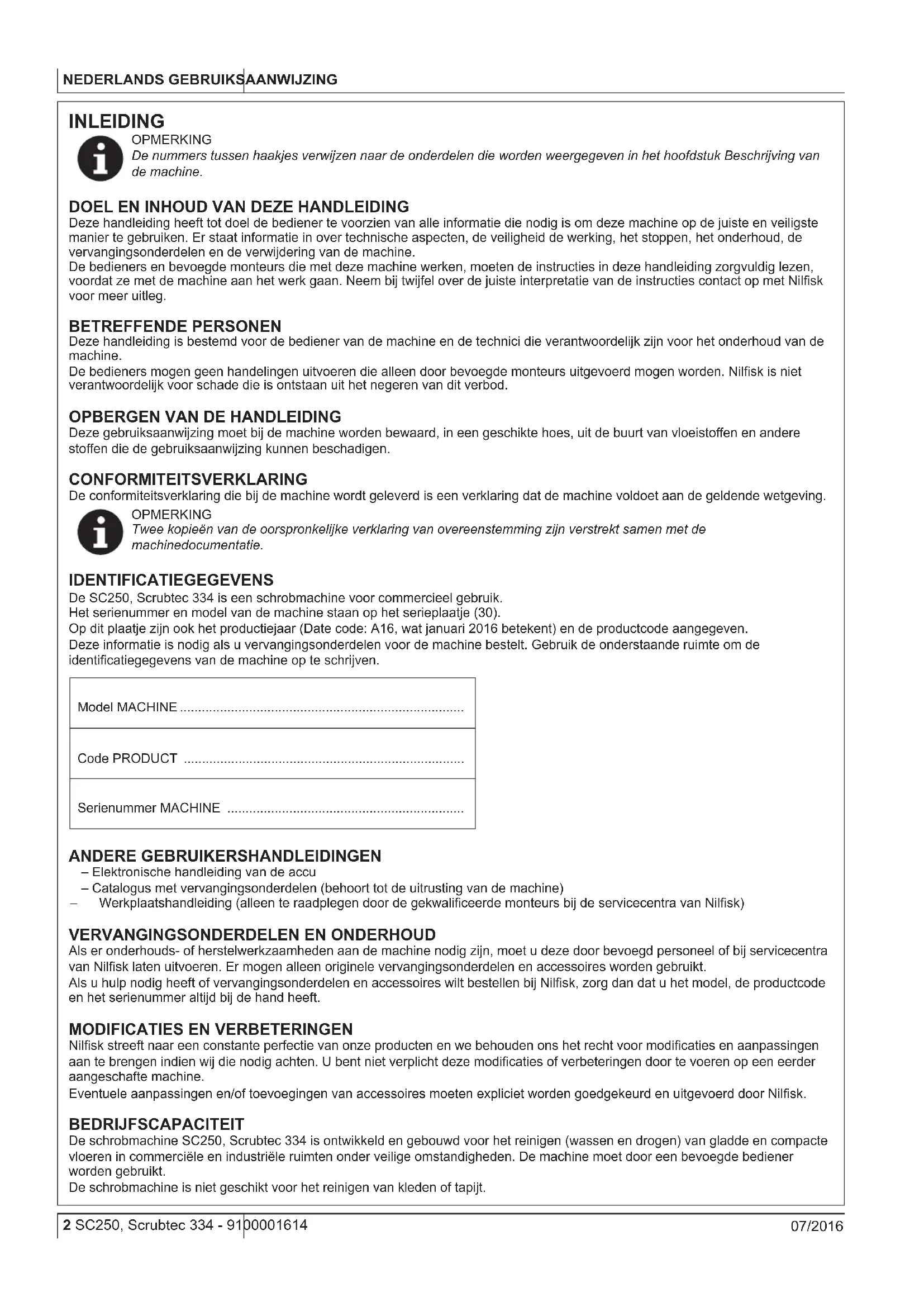 Deze gebruiksaanwijzing moet bij de machine worden bewaard, in een geschikte hoes, uit de buurt van vloeistoen en andere stoen die de gebruiksaanwijzing kunnen beschadigen. CONFORMITEITSVERKLARING De conformiteitsverklaring die bij de machine wordt geleverd is een verklaring dat de machine voldoet aan de geldende wetgeving. OPMERKING Twee kopieën van de oorspronkelijke verklaring van overeenstemming zijn verstrekt samen met de machinedocumentatie. IDENTIFICATIEGEGEVENS De SC250, Scrubtec 334 is een schrobmachine voor commercieel gebruik. Het serienummer en model van de machine staan op het serieplaatje (30). Op dit plaatje zijn ook het productiejaar (Date code: A16, wat januari 2016 betekent) en de productcode aangegeven. Deze informatie is nodig als u vervangingsonderdelen voor de machine bestelt. Gebruik de onderstaande ruimte om de identicatiegegevens van de machine op te schrijven. Model MACHINE .............................................................................. Code PRODUCT ............................................................................. Serienummer MACHINE ................................................................. ANDERE GEBRUIKERSHANDLEIDINGEN – Elektronische handleiding van de accu – Catalogus met vervangingsonderdelen (behoort tot de uitrusting van de machine) – Werkplaatshandleiding (alleen te raadplegen door de gekwaliceerde monteurs bij de servicecentra van Nilsk)