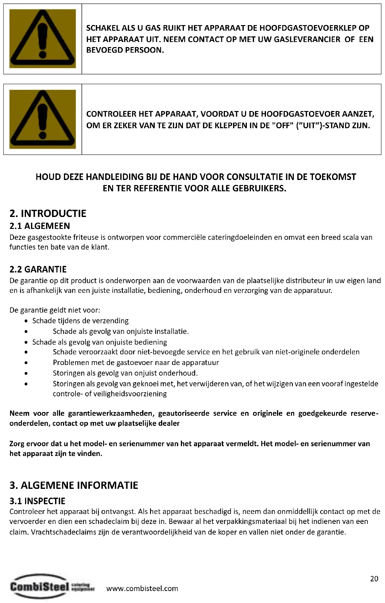Controleer het apparaat bij ontvangst. Als het apparaat beschadigd is, neem dan onmiddellijk contact op met de vervoerder en dien een schadeclaim bij deze in. Bewaar al het verpakkingsmateriaal bij het indienen van een claim. Vrachtschadeclaims zijn de verantwoordelijkheid van de koper en vallen niet onder de garantie.21 www.combisteel.com