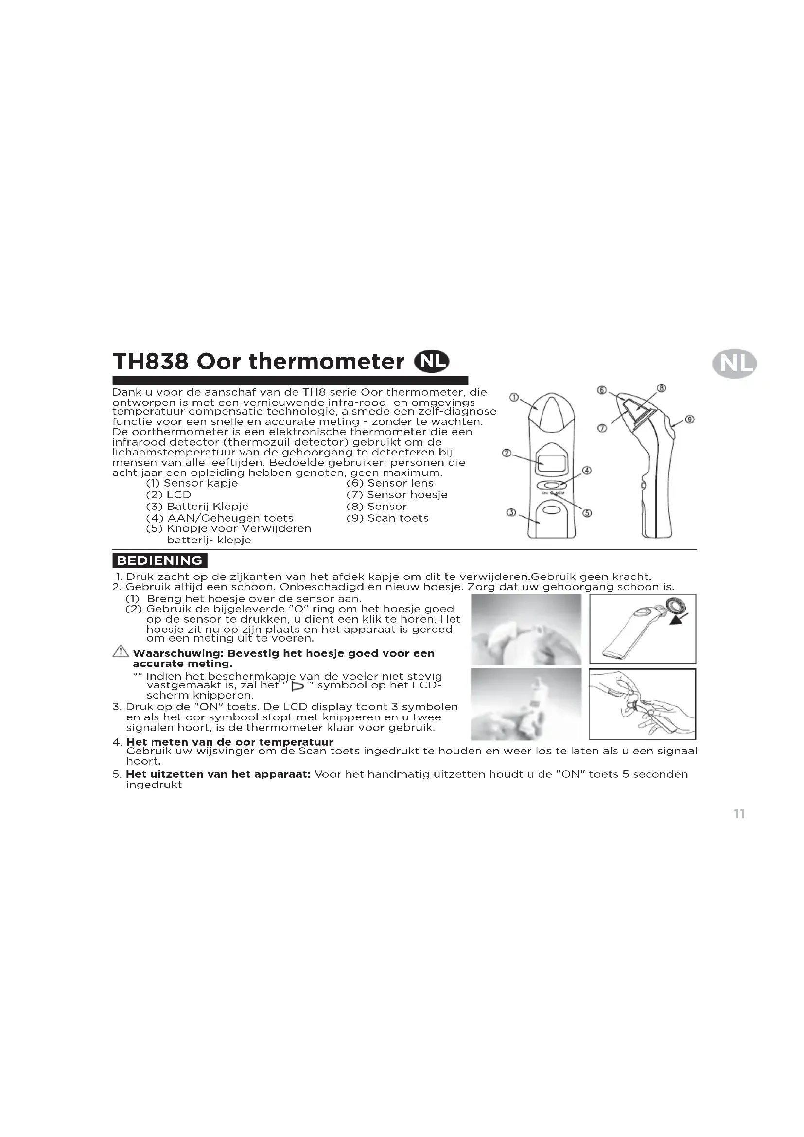 TH838 Oor thermometer Dank u voor de aanschaf van de TH8 serie Oor thermometer, die ontworpen is met een vernieuwende infra-rood en omgevings temperatuur compensatie technologie, alsmede een zelf-diagnose functie voor een snelle en accurate meting - zonder te wachten.De oorthermometer is een elektronische thermometer die een infrarood detector (thermozuil detector) gebruikt om de lichaamstemperatuur van de gehoorgang te detecteren bij mensen van alle leeftijden. Bedoelde gebruiker: personen die acht jaar een opleiding hebben genoten, geen maximum.(1) Sensor kapje (2) LCD(3) Batterij Klepje (4) AAN/Geheugen toets (5) Knopje voor Verwijderen batterij- klepje (6) Sensor lens (7) Sensor hoesje (8) Sensor (9) Scan toets 1. Druk zacht op de zijkanten van het afdek kapje om dit te verwijderen.Gebruik geen kracht.2. Gebruik altijd een schoon, Onbeschadigd en nieuw hoesje. Zorg dat uw gehoorgang schoon is.(1) Breng het hoesje over de sensor aan.(2) Gebruik de bijgeleverde "O" ring om het hoesje goed op de sensor te drukken, u dient een klik te horen. Het hoesje zit nu op zijn plaats en het apparaat is gereed om een meting uit te voeren.Waarschuwing: Bevestig het hoesje goed voor een accurate meting.** Indien het beschermkapje van de voeler niet stevig vastgemaakt is, zal het " " symbool op het LCD- scherm knipperen.3. Druk op de "ON" toets. De LCD display toont 3 symbolen en als het oor symbool stopt met knipperen en u twee signalen hoort, is de thermometer klaar voor gebruik.4. Het meten van de oor temperatuur Gebruik uw wijsvinger om de Scan toets ingedrukt te houden en weer los te laten als u een signaal hoort.