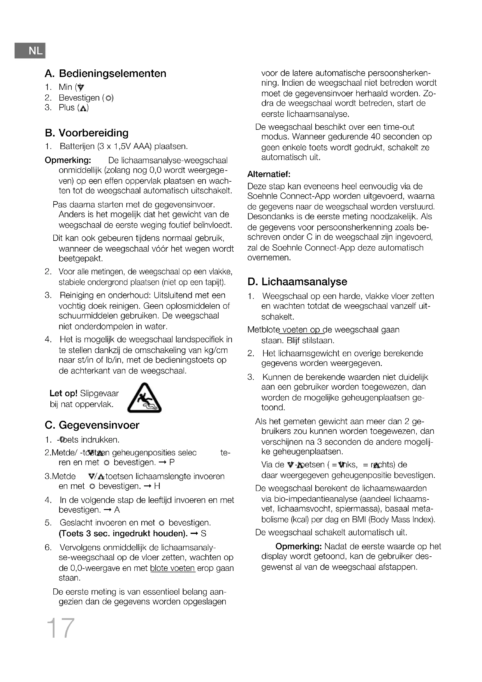 :4.1 Frequentieband: 2,4 GHz Maximaal zendvermogen: 10 mW Max. 180 kg/100 g Max. 396 lb/0,2 lb Max. 28 st/0,2 lb Leeftijd: 17-99 jaar Type batterij: 3 x 1,5 V AAA Garantie Op het onderhavige kwaliteitsproduct verleent Leifheit AG 3 jaar garantie vanaf aankoopdatum (of bij bestelling vanaf ontvangst van het toestel). Garantieclaims moeten onmiddellijk na het optre- den van het defect en binnen de garantieperiode worden ingediend. De garantie betreft de con- structie van de producten. Van garantie uitgesloten zijn: (1) aan gebruik gerelateerde of anderszins natuur- lijk optredende defecten door slijtage; (2) schade door ondeskundig gebruik of behan- deling (bijv. botsen, stoten, vallen); (3) schade als gevolg van niet-naleving van de ge- specificeerde gebruiksinstructies; (4) batterij of accu. Bij toekenning van de garantieclaim verzorgt Leif- heit naar eigen inzicht ofwel de reparatie van de- fecte onderdelen of vervanging van het product. Indien reparatie niet mogelijk is en geen identiek product voor vervanging in het assortiment be- schikbaar is, ontvangt u een zoveel mogelijk gelijk- waardig vervangend product. Terugbetaling van de aankoopprijs is onder de garantiebepalingen on- mogelijk. Deze garantie dekt ook geen aanspraak op schadevergoeding. Om voor garantie in aanmerking te komen, gaat u met het defecte product en het aankoopbewijs (kopie) naar de betreffende handelaar waarvan u het product heeft gekocht. Deze garantie geldt wereldwijd. Deze garantie beperkt op generlei wijze uw wette- lijke rechten, met name uw recht op garantie blijft onverlet. CE-conformiteitsverklaring Dit apparaat is in overeenstemming met de toepasselijke EU-richtlijn (www.soehnle.com). Verwijdering van batterijen EU-richtlijn Gooi batterijen nooit bij het huishoudelijk afval. U dient lege batterijen gratis bij de openbare inza- melpunten van uw gemeente af te geven of overal waar batterijen van het betreffende type verkocht worden. Batterijen die schadelijke stoffen bevatten, zijn voor- zien van de volgende symbolen: Pb = batterij bevat lood Cd = batterij bevat cadmium Hg = batterij bevat kwik Verwijdering van elektrische en elektronische apparatuur EU-richtlijn Dit product mag niet als gewoon huis- houdelijk afval behandeld worden, maar dient bij een inzamelpunt voor recycling van elektrische en elektronische appara- tuur te worden afgegeven. Voor meer informatie kunt u zich wenden tot uw gemeente, de gemeentelijke afvalbedrijven of de winkel waar u het product heeft gekocht. Klantenservice Voor vragen en opmerkingen staan wij graag voor u klaar met volgende contactpersonen: Duitsland Tel.: (08 00) 5 34 34 34 Internationaal Tel.: +49 26 04 97 70 Maandag tot donderdag 8.00 t/m 17.00 uur Vrijdag 8.00 t/m 16.00 uur Disclaimer Apple, iPhone, iPad, iOS, Apple Health en het Apple logo zijn handelsmerken van Apple Inc., gevestigd in de VS en andere landen. Apple Store is service- dienst van Apple Inc., gevestigd in de VS en an- dere landen. Android, Google Fit, Google Play en het Google Play logo zijn handelsmerken van Google Inc. Het Bluetooth