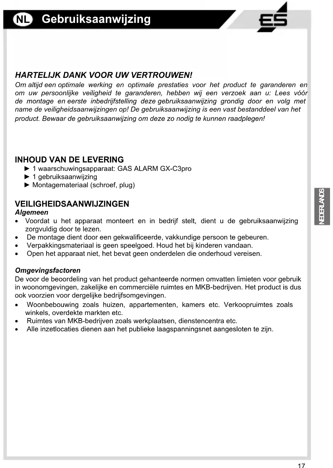 ► 1 waarschuwingsapparaat: GAS ALARM GX-C3pro ► 1 gebruiksaanwijzing ► Montagemateriaal (schroef, plug) Gebruiksaanwijzing NL18 NEDERLANDS