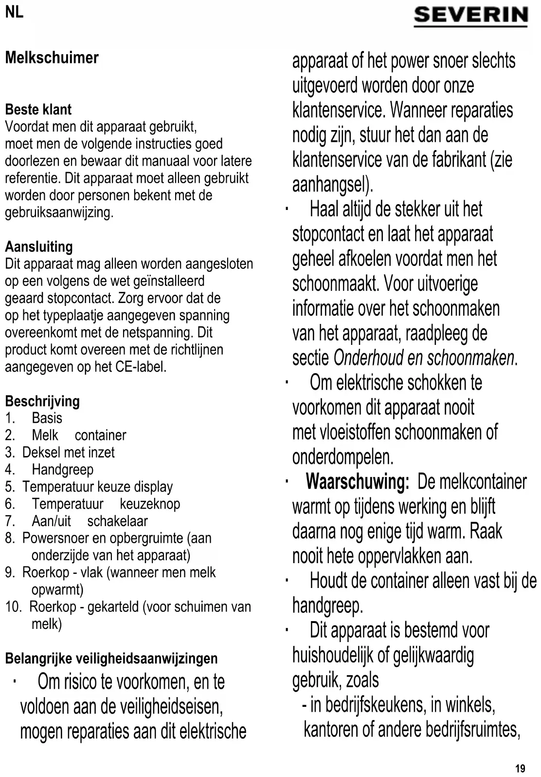 melk) Belangrijke veiligheidsaanwijzingen ∙ Om risico te voorkomen, en te voldoen aan de veiligheidseisen, mogen reparaties aan dit elektrische apparaat of het power snoer slechts uitgevoerd worden door onze klantenservice. Wanneer reparaties nodig zijn, stuur het dan aan de klantenservice van de fabrikant (zie aanhangsel). ∙ Haal altijd de stekker uit het stopcontact en laat het apparaat geheel afkoelen voordat men het schoonmaakt. Voor uitvoerige informatie over het schoonmaken van het apparaat, raadpleeg de sectie Onderhoud en schoonmaken. ∙ Om elektrische schokken te voorkomen dit apparaat nooit met vloeistoffen schoonmaken of onderdompelen. ∙ Waarschuwing: De melkcontainer warmt op tijdens werking en blijft daarna nog enige tijd warm. Raak nooit hete oppervlakken aan. ∙ Houdt de container alleen vast bij de handgreep. ∙ Dit apparaat is bestemd voor huishoudelijk of gelijkwaardig gebruik, zoals - in bedrijfskeukens, in winkels, kantoren of andere bedrijfsruimtes, NL20 - in agrarische instellingen, - door klanten in hotels, motels enz. en gelijkwaardige accommodaties, - in bed and breakfast gasthuizen. ∙ Dit apparaat mag gebruikt worden door kinderen (tenminste 8 jaar oud) en door personen met verminderde fysische, zintuiglijke of mentale bekwaamheden, of gebrek van ervaring en kennis, wanneer deze onder begeleiding zijn of instructies ontvangen hebben over het gebruik van dit apparaat en volledig de gevaren en veiligheidsvoorschriften begrijpen. ∙ Kinderen mogen niet met het apparaat spelen. ∙ Kinderen mogen in geen geval dit apparaat schoonmaken of onderhoudswerkzaamheden uitvoeren behalve wanneer onder toezicht van een volwassene en ze tenminste 8 jaar oud zijn. ∙ Het apparaat en het netsnoer moeten altijd goed weggehouden worden van kinderen jonger dan 8 jaar. ∙ Waarschuwing: Houdt kinderen weg van inpakmateriaal, daar deze een bron van gevaar zijn b.v. door verstikking. ∙ Voordat het apparaat wordt gebruikt moet zowel de hoofdeenheid inclusief het powersnoer als gelijk welk hulpstuk, dat wordt aangebracht, eerst zorgvuldig op eventuele defecten worden gecontroleerd. Ingeval het apparaat, bijvoorbeeld, op een hard oppervlak is gevallen, of wanneer men met overdadige kracht aan het power snoer getrokken heeft, mag men het niet meer gebruiken: zelfs onzichtbare beschadiging kan ongewenste effecten hebben op de gebruiksveiligheid van het apparaat. ∙ Dit apparaat is uitsluitend bestemd voor het opwarmen en opschuimen van melk. Plaats nooit andere soorten vloeistoffen of vast voedsel in de melkkan. ∙ Laat de melkschuimer nooit alleen terwijl het in gebruik is. ∙ Observeer altijd de minimum en maximum level markering in de container voor ieder gebruik. ∙ De uitsteeksels in de bodem van de container (min. level markering) moeten bedekt zijn met melk. Wanneer er niet genoeg melk is, kan het apparaat oververhitten. ∙ Om oververhitten te voorkomen, zal het apparaat automatisch uitschakelen wanneer men het leeg gebruikt. ∙ Waarschuwing: Overvullen van de container kan gevaar veroorzaken door het uitstoten van schuimende melk. ∙ Waarschuwing: De deksel moet geplaatst worden tijdens gebruik. Om tijdens gebruik ingrediënten toe te voegen moet men altijd de opening in de deksel gebruiken. ∙ Het apparaat mag alleen gebruikt worden met de originele onderdelen bijgeleverd door de fabrikant. ∙ Het apparaat moet altijd op een stevig,21 gelijk oppervlak geplaatst worden. ∙ Zorg ervoor dat het huizing en de snoer niet in contact komen met open vuur of andere hete oppervlaktes zoals kookplaten. ∙ Laat het snoer nooit los hangen: het snoer moet vrijgehouden worden van hete onderdelen van het apparaat. ∙ Verwijder altijd de stekker uit het stopcontact: - wanneer het apparaat niet werkt, - na gebruik, - wanneer men het apparaat schoonmaakt. ∙ Trek de stekker niet aan het snoer uit het stopcontact, trek aan de stekker zelf. ∙ Wordt dit apparaat op een verkeerde manier gebruikt of worden de veiligheidsregels niet gevolgd, dan kan de fabrikant niet aansprakelijk worden gesteld voor eventuele schades. Voor het eerste gebruik Verwijder al het pakmateriaal en controleer of alle onderdelen aanwezig zijn. Voordat men het apparaat voor het eerst gebruikt of wanneer men het apparaat voor lange periode niet gebruikt heeft, moet men deze eerst goed schoonmaken zoals staat beschreven in de sectie Onderhoud en schoonmaken. Gebruik Wij adviseren het gebruik van houdbare magere melk (1,5% vetgehalte). Voor de beste resultaten dient de melk vlak voor het opschuimen uit de koelkast gehaald te worden. De onderzijde van de container en het contact gedeelte aan de binnenkant van de basis moeten schoon en droog zijn. Kiezen van de roerkop ∙ Gebruik de vlakke roerkop om de melk op te warmen. ∙ Voor het tegelijkertijd schuimen en opwarmen van melk, gebruik de gekartelde kop. ∙ Voor schuimen van koude melk, moet men ook de gekartelde kop gebruiken. ∙ Tijdens lange ongebruikte periodes, moeten de koppen veilig opgeborgen worden aan de achterkant van de huizing. Vul hoeveelheden ∙ Observeer altijd de minimum vullevel markering en zorg ervoor dat de container met tenminste 120 ml melk gevuld is. ∙ Voor schuimen, vul de container met maximaal 350 ml melk (onderste max level markering