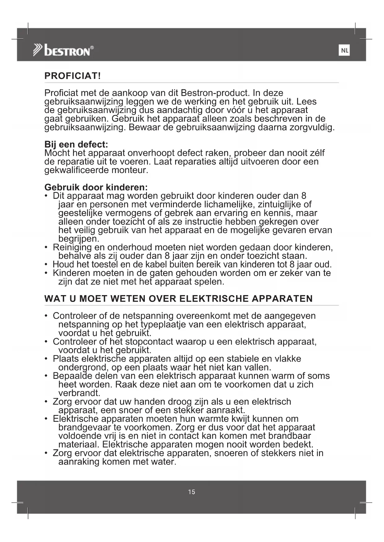 PROFICIAT! Proficiat met de aankoop van dit Bestron-product. In deze gebruiksaanwijzing leggen we de werking en het gebruik uit. Lees de gebruiksaanwijzing dus aandachtig door vóór u het apparaat gaat gebruiken. Gebruik het apparaat alleen zoals beschreven in de gebruiksaanwijzing. Bewaar de gebruiksaanwijzing daarna zorgvuldig. Bij een defect: Mocht het apparaat onverhoopt defect raken, probeer dan nooit zélf de reparatie uit te voeren. Laat reparaties altijd uitvoeren door een gekwalificeerde monteur. Gebruik door kinderen: