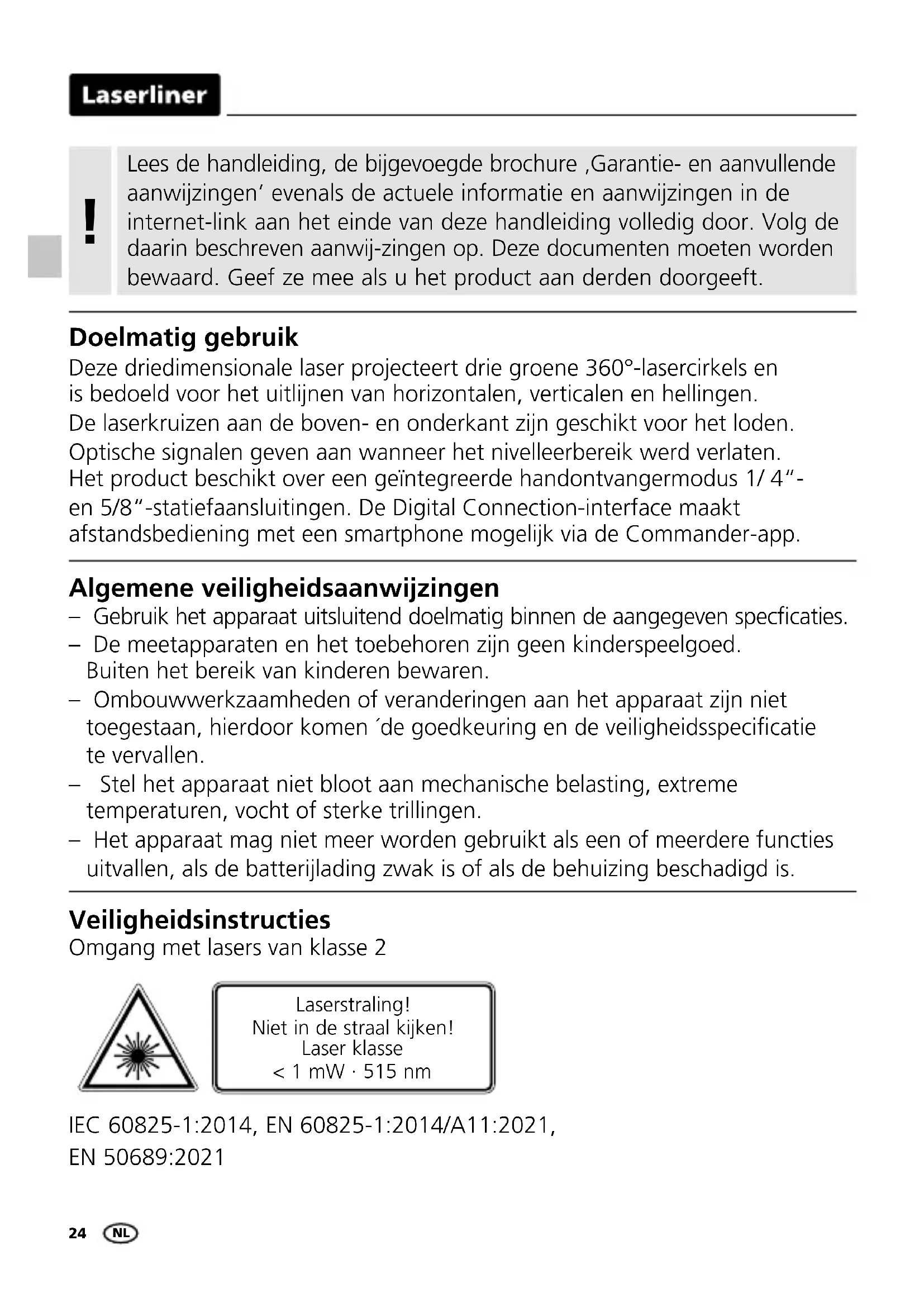 Doelmatig gebruik Deze driedimensionale laser projecteert drie groene 360°-lasercirkels en is bedoeld voor het uitlijnen van horizontalen, verticalen en hellingen. De laserkruizen aan de boven- en onderkant zijn geschikt voor het loden. Optische signalen geven aan wanneer het nivelleerbereik werd verlaten. Het product beschikt over een geïntegreerde handontvangermodus 1/ 4“- en 5/8“-statiefaansluitingen. De Digital Connection-interface maakt afstandsbediening met een smartphone mogelijk via de Commander-app. Algemene veiligheidsaanwijzingen – Gebruik het apparaat uitsluitend doelmatig binnen de aangegeven speccaties. – De meetapparaten en het toebehoren zijn geen kinderspeelgoed. Buiten het bereik van kinderen bewaren. – Ombouwwerkzaamheden of veranderingen aan het apparaat zijn niet toegestaan, hierdoor komen ´de goedkeuring en de veiligheidsspecicatie te vervallen. – Stel het apparaat niet bloot aan mechanische belasting, extreme temperaturen, vocht of sterke trillingen. – Het apparaat mag niet meer worden gebruikt als een of meerdere functies uitvallen, als de batterijlading zwak is of als de behuizing beschadigd is. Veiligheidsinstructies Omgang met lasers van klasse 2