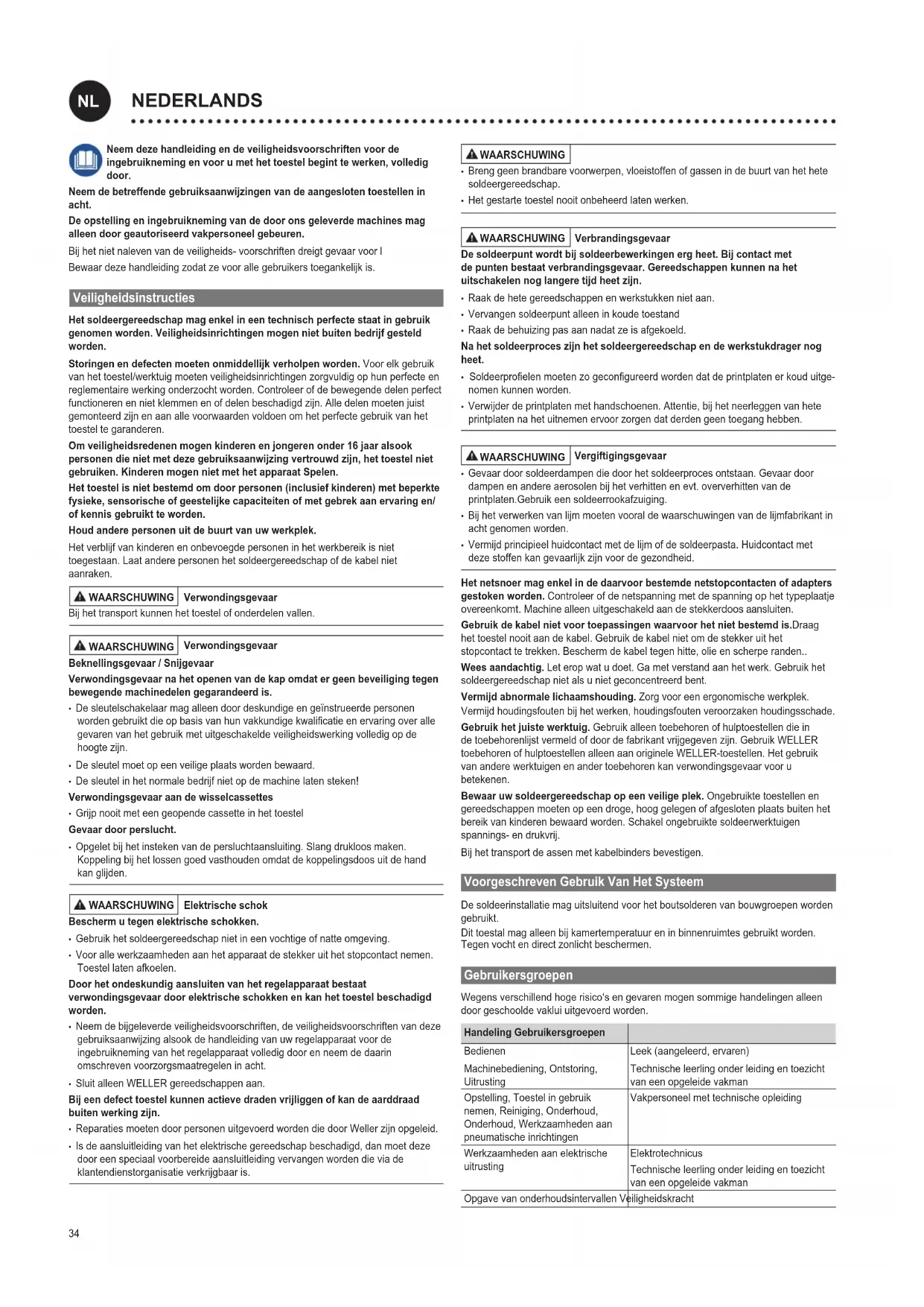- Vermijd principieel huidcontact met de lijm of de soldeerpasta. Huidcontact met deze stoffen kan gevaarlijk zijn voor de gezondheid. Het netsnoer mag enkel in de daarvoor bestemde netstopcontacten of adapters gestoken worden. Controleer of de netspanning met de spanning op het typeplaatje overeenkomt. Machine alleen uitgeschakeld aan de stekkerdoos aansluiten. Gebruik de kabel niet voor toepassingen waarvoor het niet bestemd is.Draag het toestel nooit aan de kabel. Gebruik de kabel niet om de stekker uit het stopcontact te trekken. Bescherm de kabel tegen hitte, olie en scherpe randen.. Wees aandachtig. Let erop wat u doet. Ga met verstand aan het werk. Gebruik het soldeergereedschap niet als u niet geconcentreerd bent. Vermijd abnormale lichaamshouding. Zorgvooreenergonomischewerkplek. Vermijd houdingsfouten bij het werken, houdingsfouten veroorzaken houdingsschade. Gebruik het juiste werktuig. Gebruik alleen toebehoren of hulptoestellen die in de toebehorenlijst vermeld of door de fabrikant vrijgegeven zijn. Gebruik WELLER toebehoren of hulptoestellen alleen aan originele WELLER-toestellen. Het gebruik van andere werktuigen en ander toebehoren kan verwondingsgevaar voor u betekenen. Bewaar uw soldeergereedschap op een veilige plek. Ongebruikte toestellen en gereedschappen moeten op een droge, hoog gelegen of afgesloten plaats buiten het bereik van kinderen bewaard worden. Schakel ongebruikte soldeerwerktuigen spannings- en drukvrij. Bij het transport de assen met kabelbinders bevestigen. Voorgeschreven Gebruik Van Het Systeem De soldeerinstallatie mag uitsluitend voor het boutsolderen van bouwgroepen worden gebruikt. Dit toestal mag alleen bij kamertemperatuur en in binnenruimtes gebruikt worden. Tegen vocht en direct zonlicht beschermen. Gebruikersgroepen Wegens verschillend hoge risico‘s en gevaren mogen sommige handelingen alleen door geschoolde vaklui uitgevoerd worden. Handeling Gebruikersgroepen Bedienen Machinebediening, Ontstoring, Uitrusting Leek (aangeleerd, ervaren) Technische leerling onder leiding en toezicht van een opgeleide vakman Opstelling, Toestel in gebruik nemen, Reiniging, Onderhoud, Onderhoud, Werkzaamheden aan pneumatische inrichtingen Vakpersoneel met technische opleiding Werkzaamheden aan elektrische uitrusting Elektrotechnicus Technische leerling onder leiding en toezicht van een opgeleide vakman Opgave van onderhoudsintervallen Veiligheidskracht