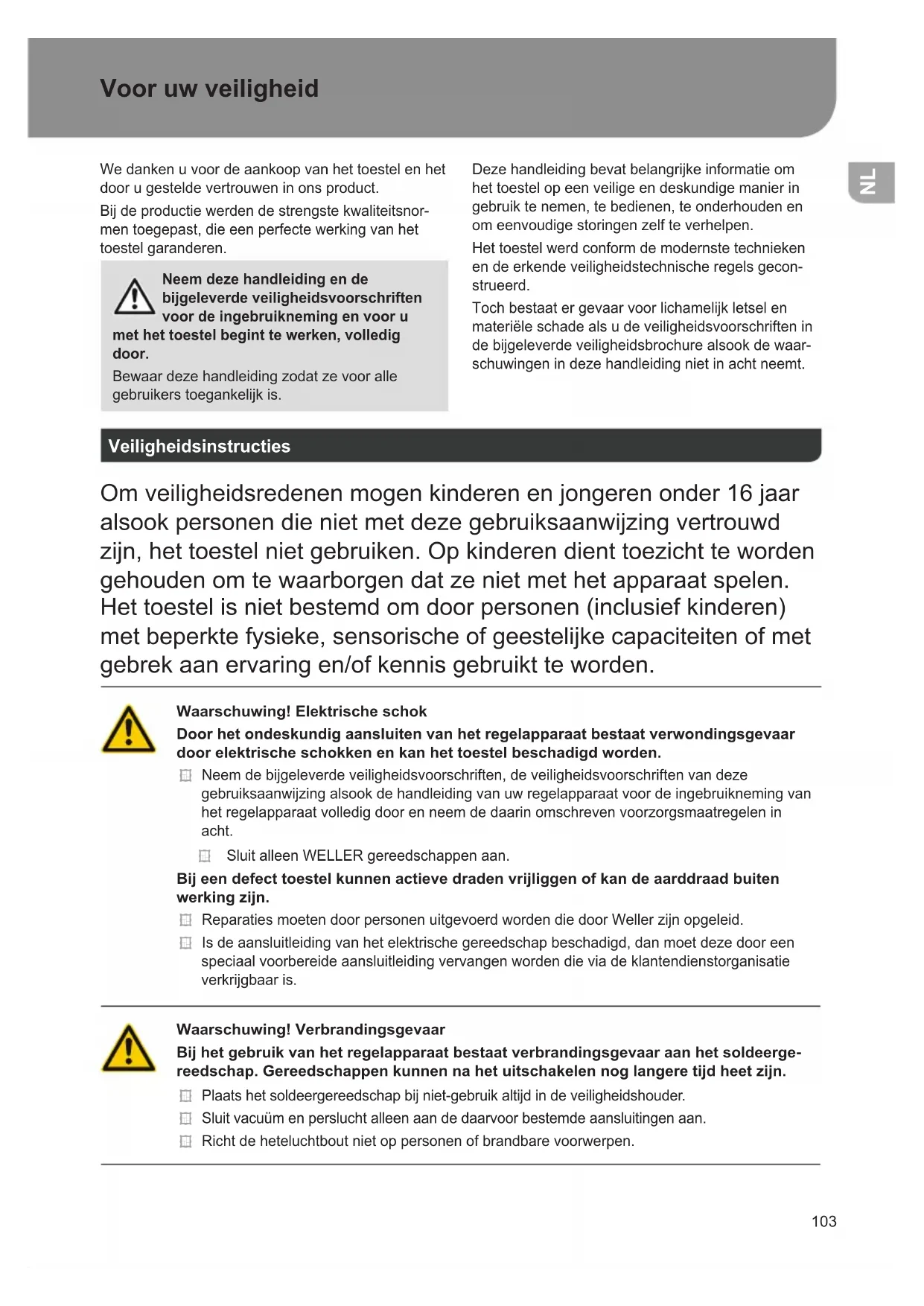 veldoaparelho Semvácuonaferramentade dessoldagem Vakuum nicht angeschlossen Bocal de dessoldagem entupido Bomba defeituosa Ligaramangueiradevácuona ligaçãodevácuo Efectuar a manutenção do bocal de dessoldagem com a ferramenta de limpeza Vácuoinsucientenaferramenta de dessoldagem Cartuchodeltroda ferramenta de dessoldagem estácheio Filtro principal cheio Substituirocartuchodeltro da ferramenta de dessoldagem Substituir o cartucho de ltragemprincipaldaestação de solda sem ar no ferro de ar quente Tubo de ar não conectado Filtro principal cheio Conectarouvericara mangueira de ar Substituir o cartucho de ltragemprincipaldaestação de solda Características Técnicas PT102 Símbolos Atenção! Leiaomanualdeinstruções! Antes de efectuar quaisquer tra- balhos no aparelho, retire sempre achadatomada. Design adequado EPA e local de trabalho adequado EPA Equilíbriodopotencial Marca CE Marca de Conformidade Britânica Fusível Transformador de segurança Soldar Dessoldar Ar quente Eliminação EEE devem ser recolhidos e de- scartados separadamente. Remova as luzes antes de descartar os equipamentos. Informe-se sobre os centros de reciclagem e os postos de coleta nas autoridades locais ou no seu vendedor autorizado. Depen- dendo dos regulamentos locais, os retalhistas podem ser obrigados a retomargratuitamenteosresíduosde equipamentos elétricos e eletrónicos. Contribua a reduzir as necessidades de matérias-primas, reutilizando ereciclandoosseusresíduosde equipamentos elétricos e eletrónicos. Resíduosdeequipamentoselétricose eletrónicos contém materiais valiosos ereutilizáveisquepodemterefeitos negativos para o meio ambiente e a sua saúde se não forem descartados ecologicamente. Apague eventuais dados pessoais existentes no seu resíduodeequipamentoantesde descartá-lo. Filtrosobstruídosdevemsertrata- dos como lixo especial. Elimine as peçasdoaparelhosubstituídas,oltro ou os aparelhos antigos segundo os re- gulamentosemvigornopaís. Garantia Os direitos do comprador de reivindicação por falhas vencem um ano após a entrega. Isto não se aplica aos direitos de recurso do comprador se- gundo os artigos 478, 479 do código civil alemão. Numa garantia por nós fornecida apenas assumi- mos a responsabilidade se a garantia de qualidade ou duração tiver sido fornecida por nós por escrito e com utilização do termo „Garantia“. A garantia expira em caso de utilização inade- quada e se tiverem sido feitas intervenções por pessoalnãoqualicado. Reservadoodireitoaalteraçõestécnicas! Informe-se em www.weller-tools.com. Características Técnicas PT103 Voor uw veiligheid We danken u voor de aankoop van het toestel en het door u gestelde vertrouwen in ons product. Bij de productie werden de strengste kwaliteitsnor- men toegepast, die een perfecte werking van het toestel garanderen. Neem deze handleiding en de bijgeleverde veiligheidsvoorschriften voor de ingebruikneming en voor u met het toestel begint te werken, volledig door. Bewaar deze handleiding zodat ze voor alle gebruikers toegankelijk is. Deze handleiding bevat belangrijke informatie om het toestel op een veilige en deskundige manier in gebruik te nemen, te bedienen, te onderhouden en om eenvoudige storingen zelf te verhelpen. Het toestel werd conform de modernste technieken en de erkende veiligheidstechnische regels gecon- strueerd. Toch bestaat er gevaar voor lichamelijk letsel en materiële schade als u de veiligheidsvoorschriften in de bijgeleverde veiligheidsbrochure alsook de waar- schuwingen in deze handleiding niet in acht neemt. Veiligheidsinstructies Om veiligheidsredenen mogen kinderen en jongeren onder 16 jaar alsook personen die niet met deze gebruiksaanwijzing vertrouwd zijn, het toestel niet gebruiken. Op kinderen dient toezicht te worden gehouden om te waarborgen dat ze niet met het apparaat spelen. Het toestel is niet bestemd om door personen (inclusief kinderen) metbeperktefysieke,sensorischeofgeestelijkecapaciteitenofmet gebrek aan ervaring en/of kennis gebruikt te worden. Waarschuwing! Elektrische schok Door het ondeskundig aansluiten van het regelapparaat bestaat verwondingsgevaar door elektrische schokken en kan het toestel beschadigd worden. Neem de bijgeleverde veiligheidsvoorschriften, de veiligheidsvoorschriften van deze gebruiksaanwijzing alsook de handleiding van uw regelapparaat voor de ingebruikneming van het regelapparaat volledig door en neem de daarin omschreven voorzorgsmaatregelen in acht. Sluit alleen WELLER gereedschappen aan. Bij een defect toestel kunnen actieve draden vrijliggen of kan de aarddraad buiten werking zijn. Reparaties moeten door personen uitgevoerd worden die door Weller zijn opgeleid. Is de aansluitleiding van het elektrische gereedschap beschadigd, dan moet deze door een speciaal voorbereide aansluitleiding vervangen worden die via de klantendienstorganisatie verkrijgbaar is. Waarschuwing! Verbrandingsgevaar Bij het gebruik van het regelapparaat bestaat verbrandingsgevaar aan het soldeerge- reedschap. Gereedschappen kunnen na het uitschakelen nog langere tijd heet zijn. Plaats het soldeergereedschap bij niet-gebruik altijd in de veiligheidshouder. Sluit vacuüm en perslucht alleen aan de daarvoor bestemde aansluitingen aan. Richt de heteluchtbout niet op personen of brandbare voorwerpen. NL104 Waarschuwing! Brand- en explosiegevaar! Brandgevaar door hete gereedschappen Plaats het soldeergereedschap bij niet-gebruik altijd in de veiligheidshouder. Richt de heteluchtbout niet op personen of brandbare voorwerpen. Houd explosieve en brandbare voorwerpen uit de buurt. Toestel niet afdekken. Waarschuwing! Verwondingsgevaar Bij het transport kunnen het toestel of onderdelen vallen. Voorgeschreven Gebruik Van Het Systeem Voedingseenheid voor WELLER soldeerge- reedschappen. Gebruik het reparatiestation uitsluitend conform de in de gebruiksaanwijzing beschreven bestemming voor het solderen en soldeerruimen onder de hier opgegeven omstandigheden. Brandbare gassen