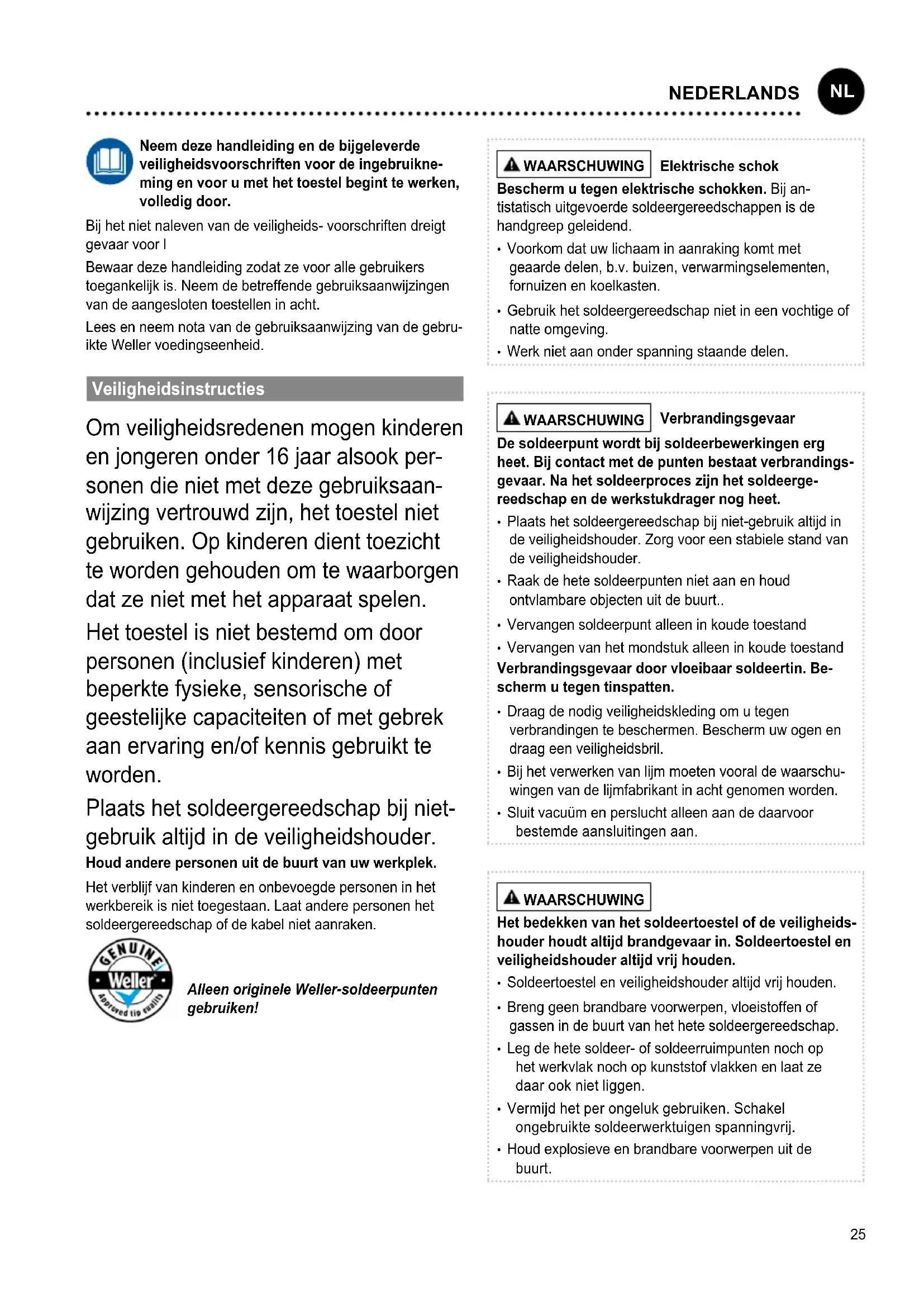 NEDERLANDS Bewaar uw soldeergereedschap op een veilige plek. Ongebruikte toestellen en gereedschappen moeten op een droge, hoog gelegen of afgesloten plaats buiten het bereik van kinderen bewaard worden. Schakel ongebruikte soldeerwerktuigen spannings- en drukvrij. Gebruik de kabel niet voor toepassingen waarvoor het niet bestemd is. Draag het toestel nooit aan de kabel. Gebruik de kabel niet om de stekker uit het stopcontact te trekken. Bescherm de kabel tegen hitte, olie en scherpe randen. Wees aandachtig. Let erop wat u doet. Ga met verstand aan het werk. Gebruik het soldeergereedschap niet als u niet geconcentreerd bent. Vermijd abnormale lichaamshouding. Zorg voor een ergonomische werkplek. Vermijd houdingsfouten bij het werken, houdingsfouten veroorzaken houdingsschade. Het soldeergereedschap mag enkel in een technisch perfecte staat in gebruik genomen worden. Veiligheidsin- richtingen mogen niet buiten bedrijf gesteld worden. Storingen en defecten moeten onmiddellijk verholpen worden. Voor elk gebruik van het toestel/werktuig moeten veiligheidsinrichtingen zorgvuldig op hun perfecte en reglementaire werking onderzocht worden. Controleer of de bewegende delen perfect functioneren en niet klemmen en of delen beschadigd zijn. Alle delen moeten juist gemonteerd zijn en aan alle voorwaarden voldoen om het perfecte gebru- ik van het toestel te garanderen. Gebruik het juiste werktuig. Gebruik alleen toebehoren of hulptoestellen die in de toebehorenlijst vermeld of door de fabrikant vrijgegeven zijn. Gebruik WELLER toebehoren of hulptoestellen alleen aan originele WELLER-toestellen. Het gebruik van andere werktuigen en ander toebehoren kan verwondingsgevaar voor u betekenen. Beveilig het werktuig. Gebruik spaninrichtingen om het werkstuk vast te houden. Gebruik een soldeerrookafzuiging. Als inrichtingen voor het aansluiten van soldeerrookafzuigingen voorhanden zijn, controleer dan of deze aangesloten en juist gebruikt worden. Voorgeschreven Gebruik Van Het Systeem Gebruik de soldeerbout uitsluitend conform de in de gebru- iksaanwijzing beschreven bestemming voor het solderen en soldeerruimen onder de hier opgegeven omstandigheden. De soldeerbout mag alleen met de Weller voedingseenhe- den gebruikt worden. Dit toestal mag alleen bij kamertemperatuur en in binnen- ruimtes gebruikt worden. Tegen vocht en direct zonlicht beschermen. Gebruikersgroepen Wegens verschillend hoge risico‘s en gevaren mogen som- mige handelingen alleen door geschoolde vaklui uitgevoerd worden. Handeling Gebruikersgroepen Opgave van de soldeerpa- rameters Vakpersoneel met technische opleiding Vervangen van elektrische reserveonderdelen Elektrotechnicus Opgave van onderhouds- intervallen Veiligheidskracht Bedienen Wissel van de lter Leek Bedienen Wissel van de lter Vervangen van elektrische reserveonderdelen Technische leerling onder leiding en toezicht van een opgeleide vakman onderhouden WAARSCHUWING Voor alle werkzaamheden aan het apparaat de stekker uit het stopcontact nemen. Toestel laten afkoelen. Controleer regelmatig alle aangesloten kabels en slangen. Beschadigde elektrische gereedschappen onmiddellijk buiten bedrijf stellen. Verstopte mondstukken mogen niet gebruikt worden. Reparaties moeten door personen uitgevoerd worden die door Weller zijn opgeleid. Gebruik alléén origineel toebehoren en originele onderdelen. WAARSCHUWING Verbrandingsgevaar