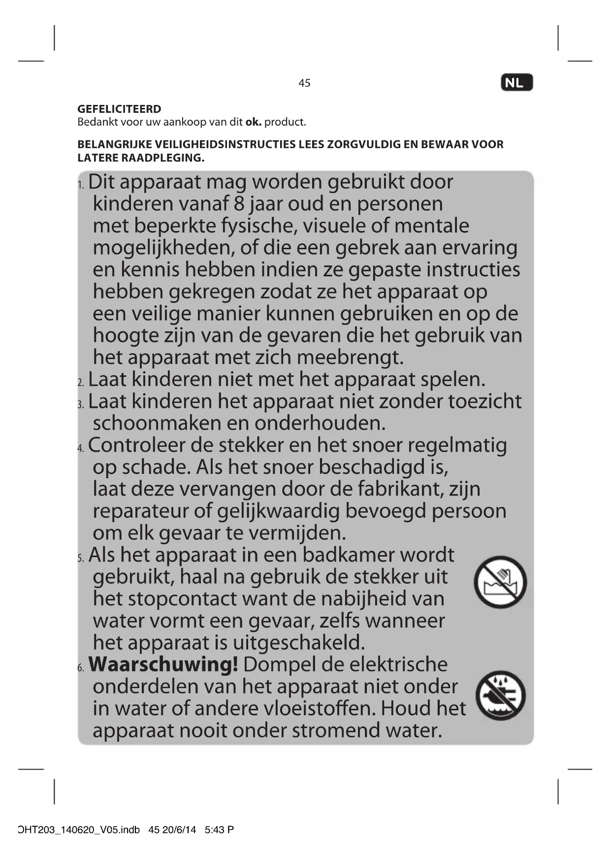 onderdelen van het apparaat niet onder in water of andere vloeistoen. Houd het apparaat nooit onder stromend water. IM_OHT203_140620_V05.indb 45 20/6/14 5:43 PMNL