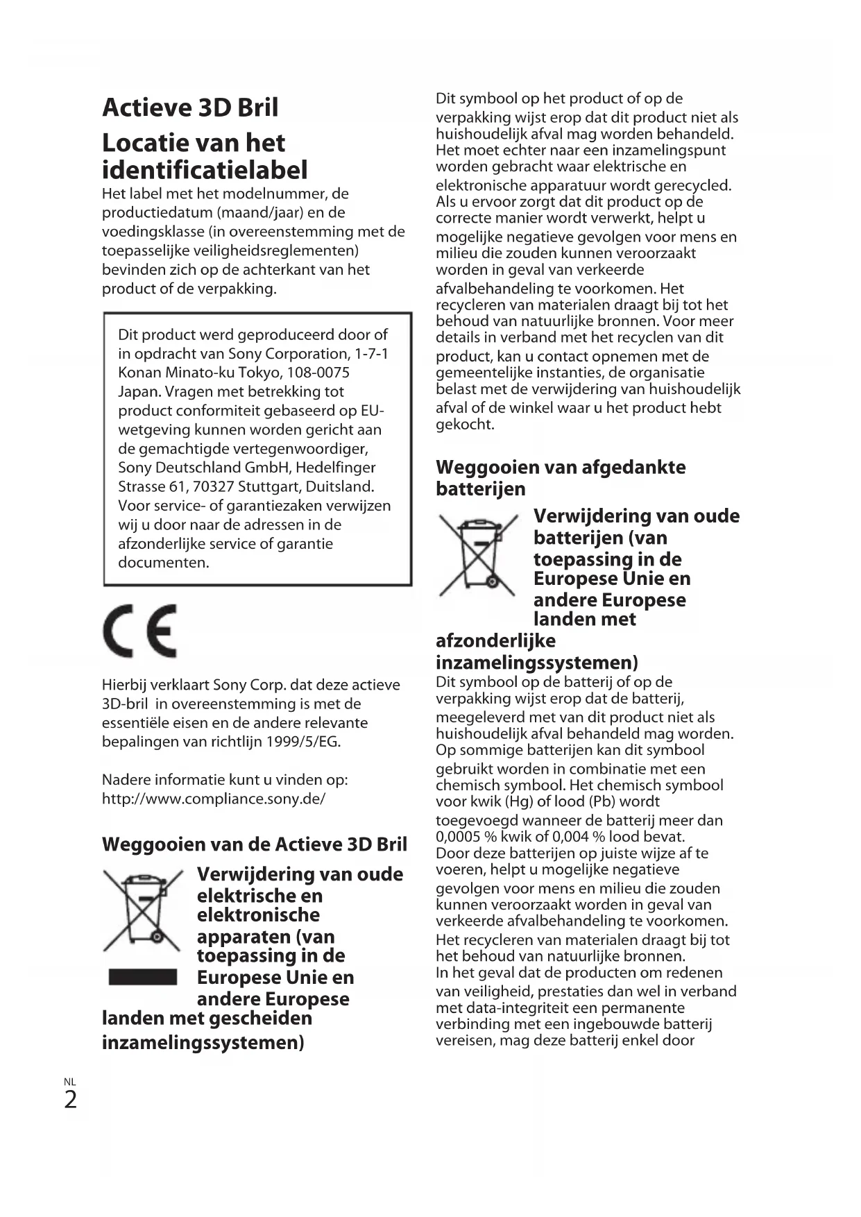 Actieve 3D Bril Locatie van het identificatielabel Het label met het modelnummer, de productiedatum (maand/jaar) en de voedingsklasse (in overeenstemming met de toepasselijke veiligheidsreglementen) bevinden zich op de achterkant van het product of de verpakking. Dit product werd geproduceerd door of in opdracht van Sony Corporation, 1-7-1 Konan Minato-ku Tokyo, 108-0075 Japan. Vragen met betrekking tot product conformiteit gebaseerd op EU- wetgeving kunnen worden gericht aan de gemachtigde vertegenwoordiger, Sony Deutschland GmbH, Hedelfinger Strasse 61, 70327 Stuttgart, Duitsland. Voor service- of garantiezaken verwijzen wij u door naar de adressen in de afzonderlijke service of garantie documenten. Hierbij verklaart Sony Corp. dat deze actieve 3D-bril in overeenstemming is met de essentiële eisen en de andere relevante bepalingen van richtlijn 1999/5/EG. Nadere informatie kunt u vinden op: http://www.compliance.sony.de/ Weggooien van de Actieve 3D Bril Verwijdering van oude elektrische en elektronische apparaten (van toepassing in de Europese Unie en andere Europese landen met gescheiden inzamelingssystemen) Dit symbool op het product of op de verpakking wijst erop dat dit product niet als huishoudelijk afval mag worden behandeld. Het moet echter naar een inzamelingspunt worden gebracht waar elektrische en elektronische apparatuur wordt gerecycled. Als u ervoor zorgt dat dit product op de correcte manier wordt verwerkt, helpt u mogelijke negatieve gevolgen voor mens en milieu die zouden kunnen veroorzaakt worden in geval van verkeerde afvalbehandeling te voorkomen. Het recycleren van materialen draagt bij tot het behoud van natuurlijke bronnen. Voor meer details in verband met het recyclen van dit product, kan u contact opnemen met de gemeentelijke instanties, de organisatie belast met de verwijdering van huishoudelijk afval of de winkel waar u het product hebt gekocht. Weggooien van afgedankte batterijen Verwijdering van oude batterijen (van toepassing in de Europese Unie en andere Europese landen met afzonderlijke inzamelingssystemen) Dit symbool op de batterij of op de verpakking wijst erop dat de batterij, meegeleverd met van dit product niet als huishoudelijk afval behandeld mag worden. Op sommige batterijen kan dit symbool gebruikt worden in combinatie met een chemisch symbool. Het chemisch symbool voor kwik (Hg) of lood (Pb) wordt toegevoegd wanneer de batterij meer dan 0,0005 % kwik of 0,004 % lood bevat. Door deze batterijen op juiste wijze af te voeren, helpt u mogelijke negatieve gevolgen voor mens en milieu die zouden kunnen veroorzaakt worden in geval van verkeerde afvalbehandeling te voorkomen. Het recycleren van materialen draagt bij tot het behoud van natuurlijke bronnen. In het geval dat de producten om redenen van veiligheid, prestaties dan wel in verband met data-integriteit een permanente verbinding met een ingebouwde batterij vereisen, mag deze batterij enkel door3