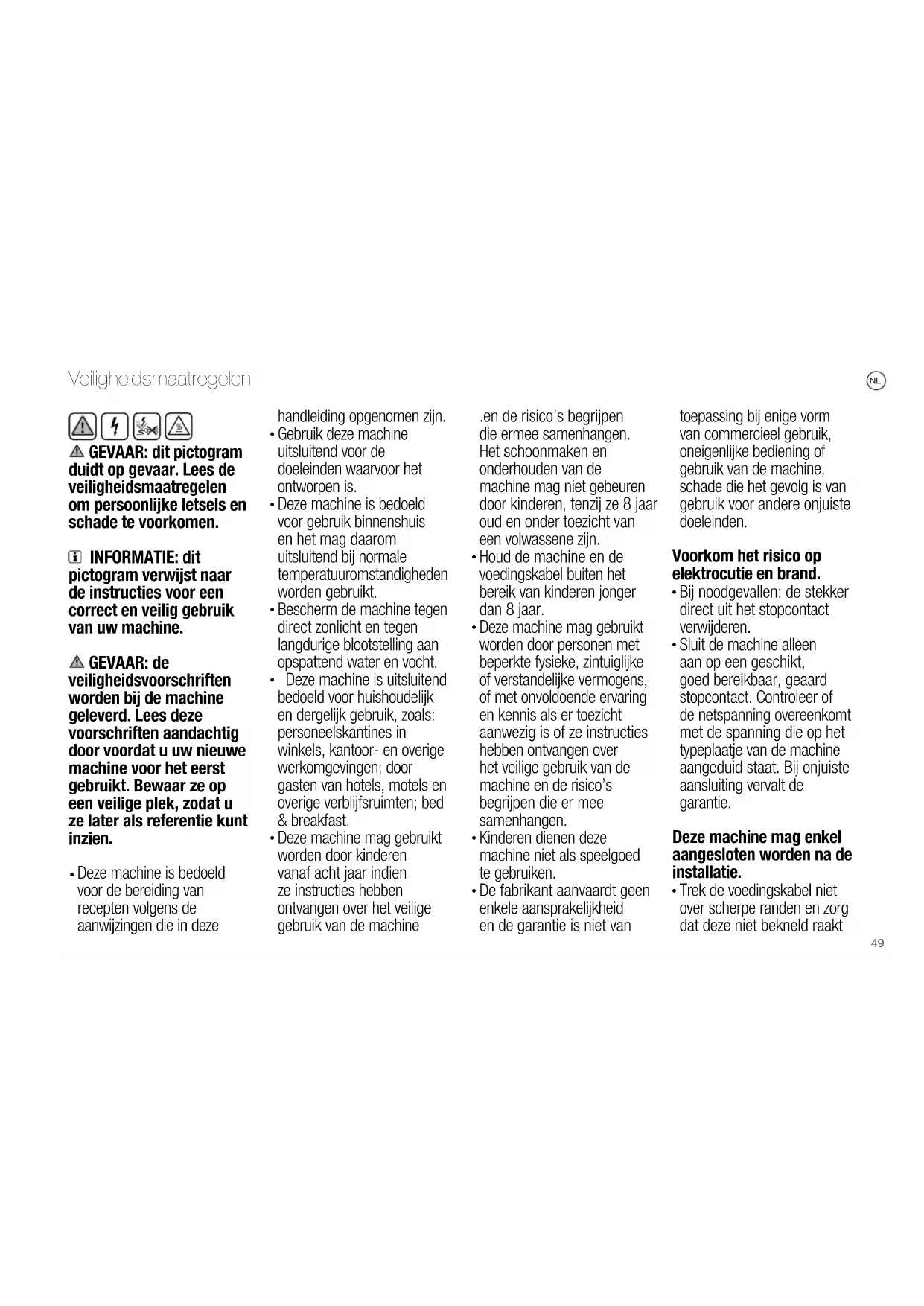 Veiligheidsmaatregelen GEVAAR: dit pictogram duidt op gevaar. Lees de veiligheidsmaatregelen om persoonlijke letsels en schade te voorkomen. INFORMATIE: dit pictogram verwijst naar de instructies voor een correct en veilig gebruik van uw machine. GEVAAR: de veiligheidsvoorschriften worden bij de machine geleverd. Lees deze voorschriften aandachtig door voordat u uw nieuwe machine voor het eerst gebruikt. Bewaar ze op een veilige plek, zodat u ze later als referentie kunt inzien.