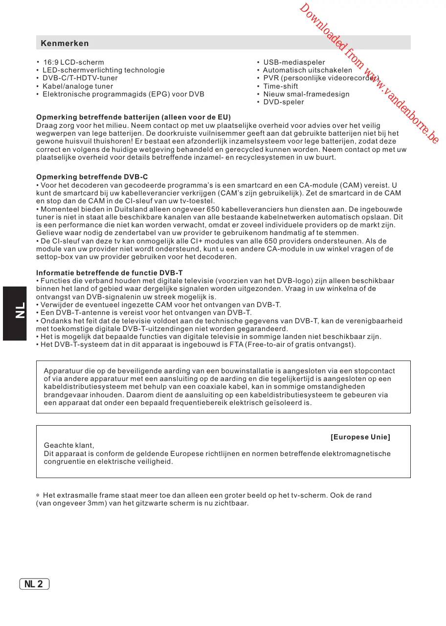 d de oa nl ow • Retirez le CAM pour la réception DVB-T. • Une antenne DVB-T doit être raccordée pour les caractéristiques DVB-T, les transmissions numériques futures DVB-T ou la compatibilité ne sont pas garanties. • Certaines fonctions de la télévision numérique peuvent ne pas être disponibles dans certains pays. • Le système DVB-T présent dans cet appareil est un service de diffusion télévision numérique sur ondes hertziennes en clair. L’appareil mis à la terre de l'installation électrique du bâtiment par le biais du raccordement au secteur ou autres appareils avec un branchement mis à la terre – et à un système de distribution par câble utilisant un câble coaxial, peut, dans certaines circonstances, provoquer un incendie. Le branchement à un système de câblodistribution doit par conséquent être fourni par un dispositif fournissant une isolation électrique en dessous d’une certaine plage de fréquences.