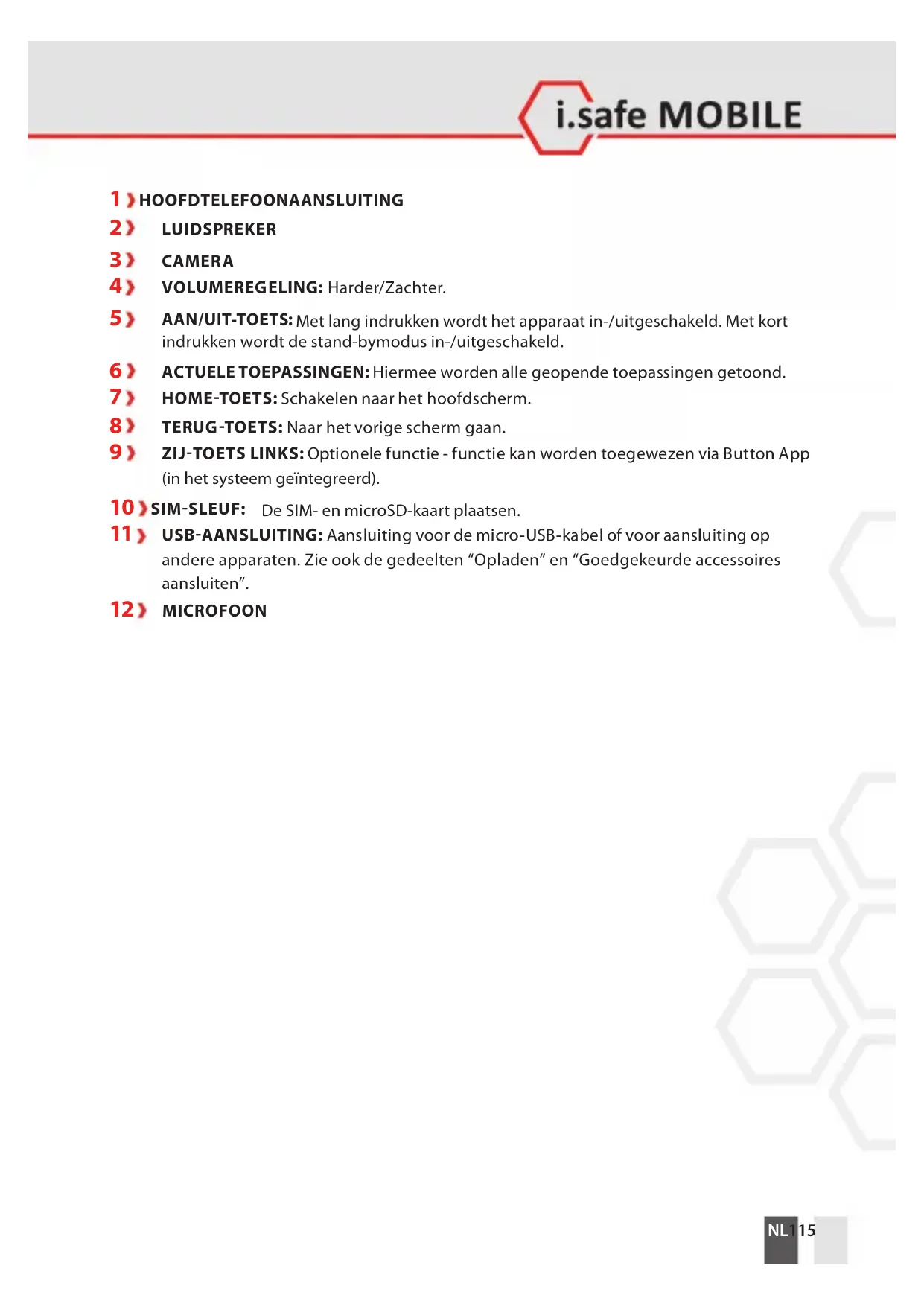 Volg de instructies op het scherm wanneer u het apparaat voor de eerste keer inschakelt. Meer informatie over bediening van het apparaat vindt u op www.isafe-mobile.com/en/support/service onder het menu-item “FAQ”. Gedetailleerde informatie over het gebruik van het Android-besturingssysteem vindt u op: https://support.google.com/android LET OP De microfoon bevindt zich aan de onderkant van het toestel. Voor een optimale communica- tie moet u ervoor zorgen dat de microfoon niet wordt afgedekt.NL 121