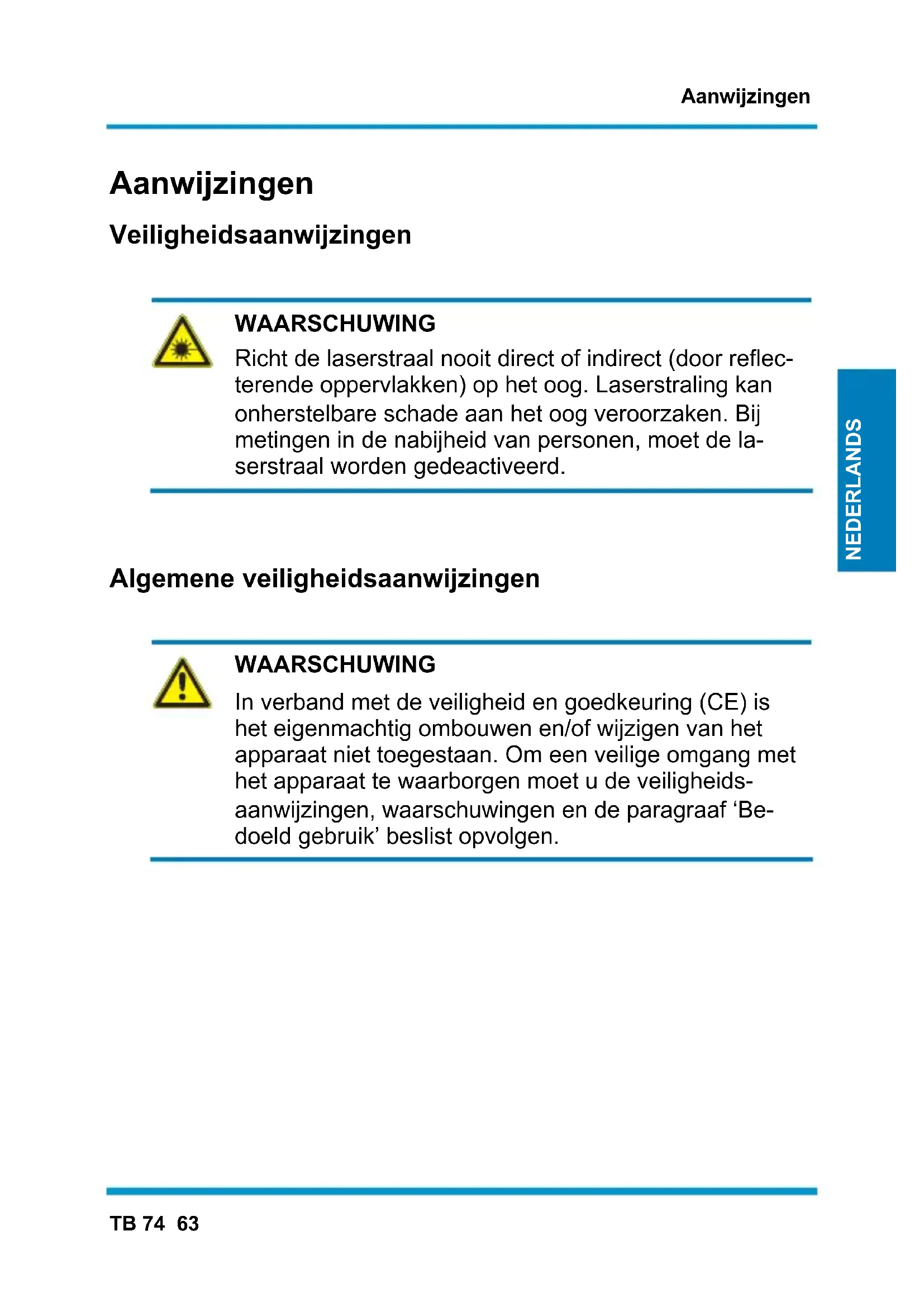 TB 74 WAARSCHUWING Lees vóór gebruik van het apparaat beslist de volgen- de aanwijzingen: | Voorkom gebruik van het apparaat in de nabijheid van elektrische lasapparatuur, inductieverwarmin- gen en andere elektromagnetische velden. | Stel het apparaat nooit langere tijd bloot aan hoge temperaturen. | Voorkom stoffige en vochtige omgevingsomstan- digheden. | Meetapparaten en toebehoren zijn geen speelgoed en behoren niet in kinderhanden! | In commerciële inrichtingen moeten de ongevallen- preventievoorschriften van de vereniging van be- drijfsmatige ongevallenverzekeringen voor elektri- sche installaties en bedrijfsmiddelen worden aan- gehouden.