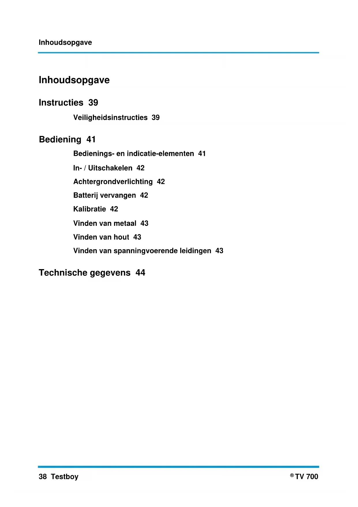 TV 700 Inhoudsopgave Instructies 39 Veiligheidsinstructies 39 Bediening 41 Bedienings- en indicatie-elementen 41 In- / Uitschakelen 42 Achtergrondverlichting 42 Batterij vervangen 42 Kalibratie 42 Vinden van metaal 43 Vinden van hout 43 Vinden van spanningvoerende leidingen 43 Technische gegevens 44Instructies Testboy