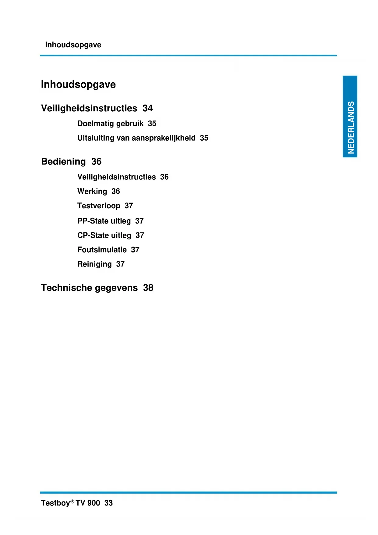 TV 900 33 ENGLISH NEDERLANDS Inhoudsopgave Veiligheidsinstructies 34 Doelmatig gebruik 35 Uitsluiting van aansprakelijkheid 35 Bediening 36 Veiligheidsinstructies 36 Werking 36 Testverloop 37 PP-State uitleg 37 CP-State uitleg 37 Foutsimulatie 37 Reiniging 37 Technische gegevens 38Veiligheidsinstructies 34 Testboy