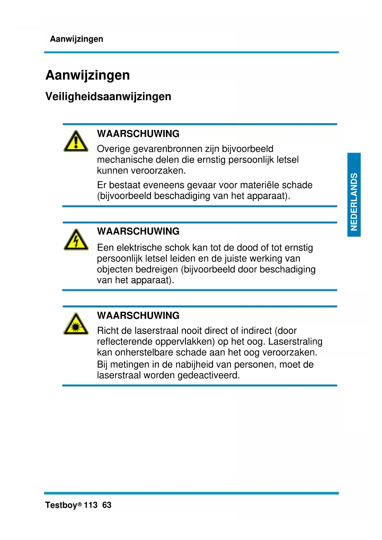 WAARSCHUWING Richt de laserstraal nooit direct of indirect (door reflecterende oppervlakken) op het oog. Laserstraling kan onherstelbare schade aan het oog veroorzaken. Bij metingen in de nabijheid van personen, moet de laserstraal worden gedeactiveerd.Aanwijzingen 64 Testboy