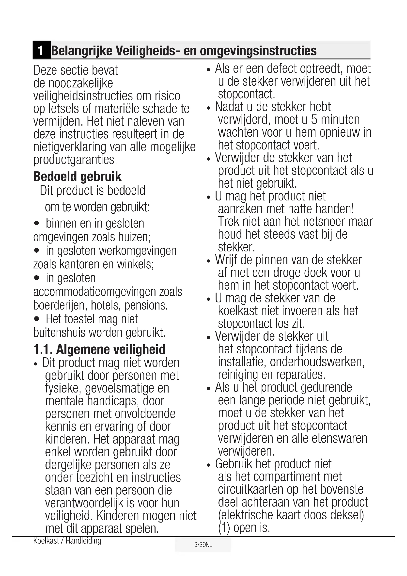- 6.5. Reinigingsproducten glazen deuren 6 Zorg en reiniging 27 7 Probleemoplossing 283/39NL Koelkast / Handleiding 1 Belangrijke Veiligheids- en omgevingsinstructies Deze sectie bevat de noodzakelijke veiligheidsinstructies om risico op letsels of materiële schade te vermijden. Het niet naleven van deze instructies resulteert in de nietigverklaring van alle mogelijke productgaranties. Bedoeld gebruik Dit product is bedoeld om te worden gebruikt: p. 27