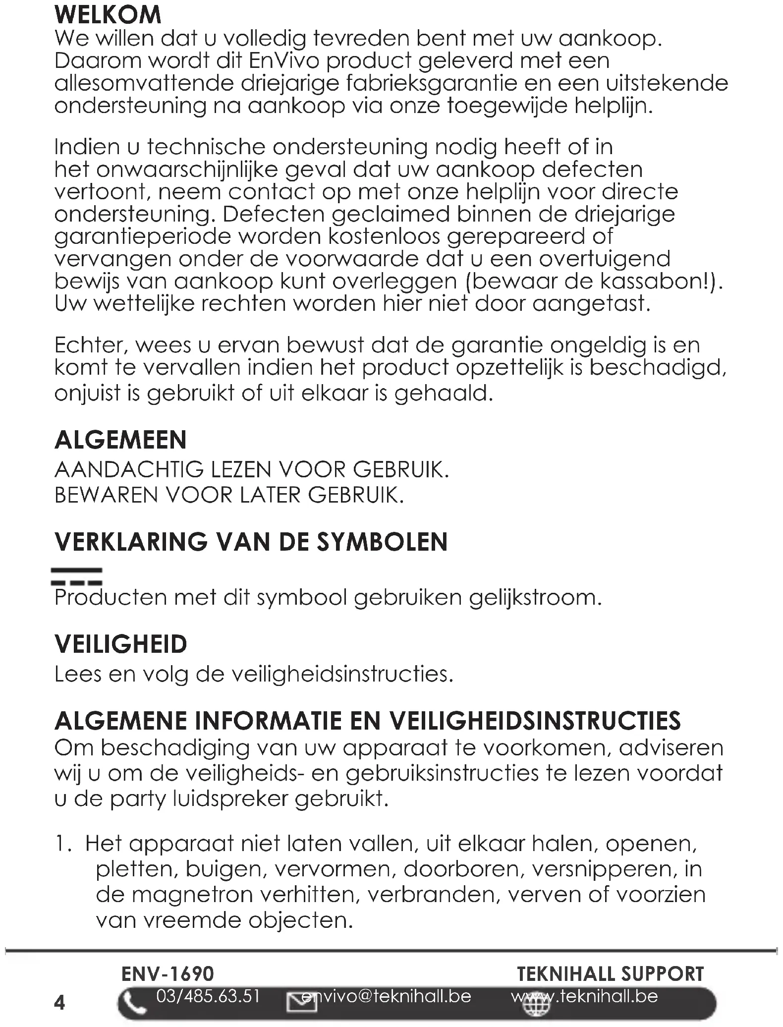 03/485.63.51 envivo@teknihall.be www.teknihall.be TEKNIHALL SUPPORT Fout Oorzaak Oplossing Party luidspreker vraagt om een wachtwoord bij het verbinden Op sommige oudere apparaten kan om een wachtwoord worden gevraagd Type in “0000”, en u zult in staat zijn om te verbinden met de party luidspreker. Verklaring van conformiteit: (Zie bijgevoegd document). Producten met dit symbool voldoen aan alle toepasselijke communautaire regelgeving van de Europese Economische Ruimte. VERWIJDERING Elektrische en elektronische apparaten (EEE) bevatten materialen, onderdelen en stoffen welke gevaarlijk kunnen zijn voor de omgeving en schadelijk kunnen zijn voor de gezondheid van mensen als afval van elektrische en elektronische apparaten (WEEE) niet correct wordt weggegooid. Elektrische en elektronische apparaten, welke zijn gemarkeerd met het WEEE logo (te zien aan de linkerzijde), dienen niet met het huishoudelijk afval te worden weggegooid. Neem contact op met uw lokale afvalverwerker van uw gemeente aangezien zij in staat zijn om u te informeren over de recycling opties in uw regio. Dit symbool op de batterij of op de verpakking geeft aan dat de batterij die bij dit product wordt geleverd, niet als huishoudelijk afval mag worden behandeld. Het recycleren van de materialen zal bijdragen tot het behoud van de natuurlijke hulpbronnen. Neem contact op met de afvalverwerkingsdienst van jouw gemeente, die je meer informatie kan geven over de recyclingmogelijkheden in jouw regio.ENV-1690