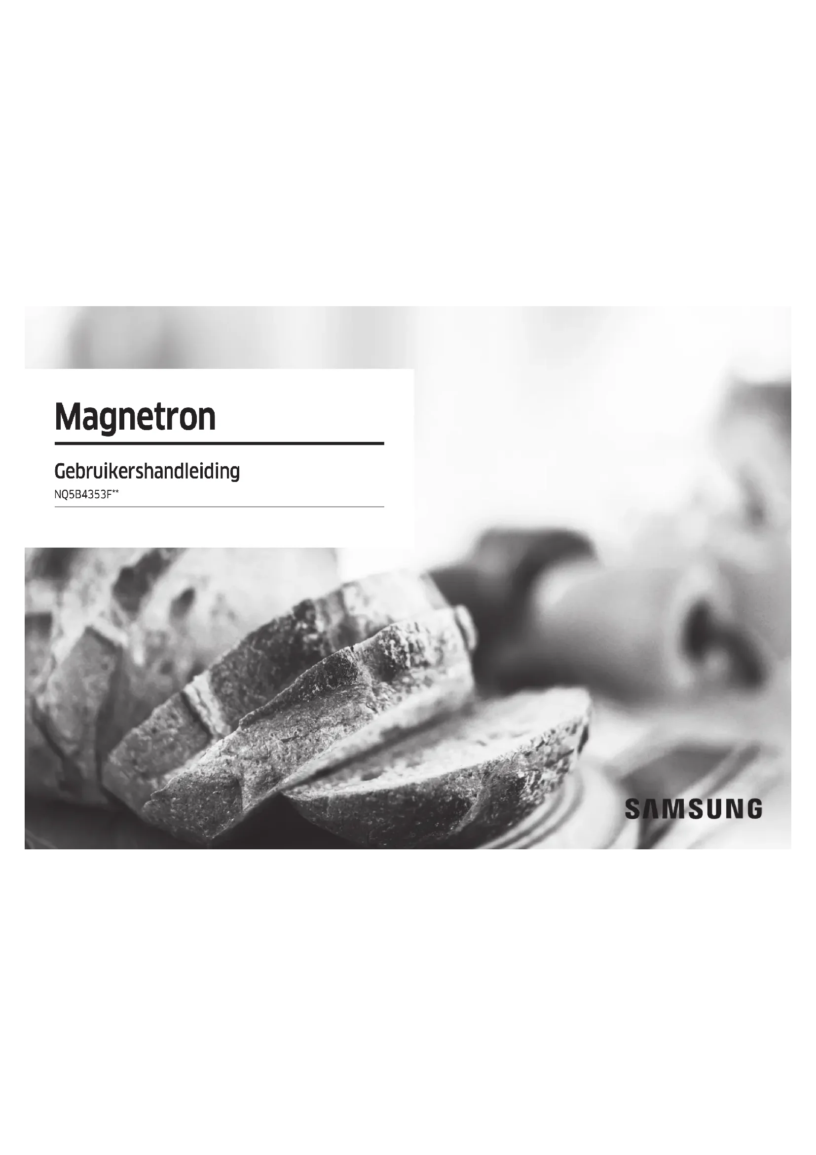 Chamada para a rede xa nacional Dias úteis das 9h às 20h www.samsung.com/pt/support SPAIN 91 175 00 15 www.samsung.com/es/support SWEDEN 0771-400 300 www.samsung.com/se/support SWITZERLAND 0800 726 786 www.samsung.com/ch/support (German) www.samsung.com/ch_fr/support (French) UK 0333 000 0333 www.samsung.com/uk/support IRELAND (EIRE) 0818 717100 www.samsung.com/ie/support DG68-01425A-02Magnetron Gebruikershandleiding NQ5B4353F**2 Nederlands Inhoud Inhoud Veiligheidsinstructies 3 Belangrijke veiligheidsvoorschriften 3 Algemene veiligheid 7 Voorzorgsmaatregelen voor werking van de magnetron 8 Beperkte garantie 9 Denitie van de productgroep 9 Correcte verwijdering van dit product (Elektrische & elektronische afvalapparatuur) 9 Installatie 10 Geleverde onderdelen 10 Installatie-instructies 11 Onderhoud 14 Reinigen 14 Onderdelen vervangen (reparatie) 14 Voorzorgsmaatregelen bij een langere periode zonder gebruik 14 Voor u begint 15 Bedieningspaneel 15 Klok 15 Zijrekken 16 Over microgolfenergie 16 Kookgerei voor de magnetron 17 Gebruik 18 Functieoverzicht 18 Handmatige bediening 19 Automatische stand 23 Automatisch bereiden 24 Speciale functies 27 Meer functies 28 Smart Control 29 Slim koken 29 Handmatige bereiding 29 Snel en eenvoudig 36 Probleemoplossing 37 Controlepunten 37 Informatiecodes 41 Technische specicaties 42 Bijlage 42 Aankondiging met betrekking tot open source 43Nederlands 3 Veiligheidsinstructies Veiligheidsinstructies BELANGRIJKE VEILIGHEIDSVOORSCHRIFTEN LEES DE AANWIJZINGEN ZORGVULDIG DOOR EN BEWAAR DEZE ZODAT U ZE IN DE TOEKOMST KUNT RAADPLEGEN. WAARSCHUWING: Als de deur of de afsluitstrippen zijn beschadigd, mag u de oven niet gebruiken voordat deze is gerepareerd door een gekwaliceerde monteur. WAARSCHUWING: Onderhoud en reparaties waarbij de behuizing, die bescherming biedt tegen blootstelling aan microgolven, wordt verwijderd, mogen alleen worden uitgevoerd door een gekwaliceerde monteur. Voor anderen is dit levensgevaarlijk. WAARSCHUWING: Vloeistoffen en andere gerechten mogen niet worden verwarmd in een afgesloten verpakking, aangezien deze kan exploderen. WAARSCHUWING: Laat de oven alleen zonder toezicht door kinderen gebruiken nadat u duidelijke instructies hebt gegeven en u ervan overtuigd bent dat het kind in staat is de oven op een veilige manier te bedienen en begrijpt wat de gevaren zijn van onjuist gebruik. Dit apparaat is uitsluitend bedoeld voor huishoudelijk gebruik en niet voor: