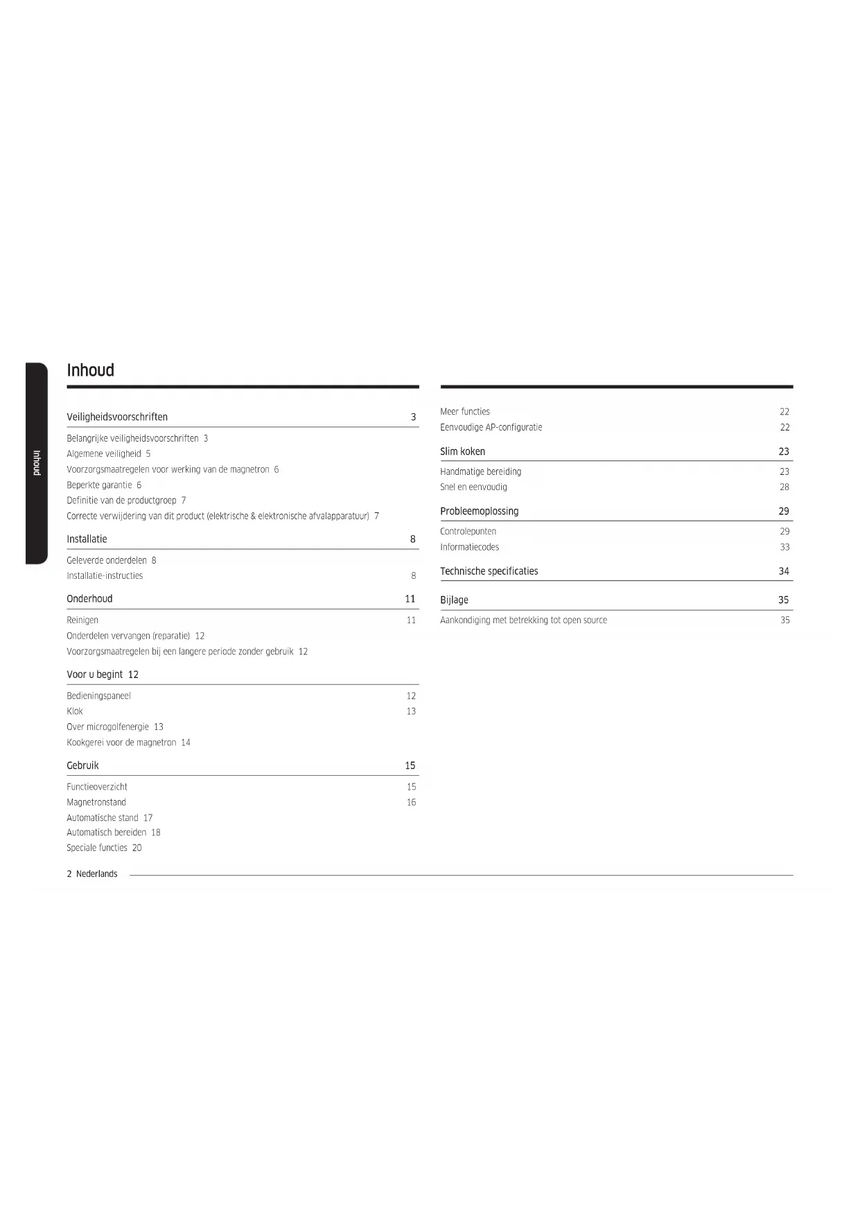 Chamada para a rede fixa nacional Dias úteis das 9h às 20h www.samsung.com/pt/support SPAIN 91 175 00 15 www.samsung.com/es/support SWEDEN 0771-400 300 www.samsung.com/se/support SWITZERLAND 0800 726 786 www.samsung.com/ch/support (German) www.samsung.com/ch_fr/support (French) UK 0333 000 0333 www.samsung.com/uk/support IRELAND (EIRE) 0818 717100 www.samsung.com/ie/support DG68-01405B-01Magnetron Gebruikershandleiding NQ5B4313G**2 Nederlands Inhoud Inhoud Veiligheidsvoorschriften 3 Belangrijke veiligheidsvoorschriften 3 Algemene veiligheid 5 Voorzorgsmaatregelen voor werking van de magnetron 6 Beperkte garantie 6 Definitie van de productgroep 7 Correcte verwijdering van dit product (elektrische & elektronische afvalapparatuur) 7 Installatie 8 Geleverde onderdelen 8 Installatie-instructies 8 Onderhoud 11 Reinigen 11 Onderdelen vervangen (reparatie) 12 Voorzorgsmaatregelen bij een langere periode zonder gebruik 12 Voor u begint 12 Bedieningspaneel 12 Klok 13 Over microgolfenergie 13 Kookgerei voor de magnetron 14 Gebruik 15 Functieoverzicht 15 Magnetronstand 16 Automatische stand 17 Automatisch bereiden 18 Speciale functies 20 Meer functies 22 Eenvoudige AP-configuratie 22 Slim koken 23 Handmatige bereiding 23 Snel en eenvoudig 28 Probleemoplossing 29 Controlepunten 29 Informatiecodes 33 Technische specificaties 34 Bijlage 35 Aankondiging met betrekking tot open source 35Nederlands 3 Veiligheidsvoorschriften Veiligheidsvoorschriften BELANGRIJKE VEILIGHEIDSVOORSCHRIFTEN LEES DIT ZORGVULDIG DOOR EN BEWAAR VOOR LATER GEBRUIK. WAARSCHUWING: Als de deur of de afsluitstrippen zijn beschadigd, mag u de oven niet gebruiken voordat deze is gerepareerd door een gekwalificeerde monteur. WAARSCHUWING: Onderhoud en reparaties waarbij de behuizing, die bescherming biedt tegen blootstelling aan microgolven, wordt verwijderd, mogen alleen worden uitgevoerd door een gekwalificeerde monteur. Voor anderen is dit levensgevaarlijk. WAARSCHUWING: Vloeistoffen en andere gerechten mogen niet worden verwarmd in een afgesloten verpakking, aangezien deze kan exploderen. WAARSCHUWING: Laat de oven alleen zonder toezicht door kinderen gebruiken nadat u duidelijke instructies hebt gegeven en u ervan overtuigd bent dat het kind in staat is de oven op een veilige manier te bedienen en begrijpt wat de gevaren zijn van onjuist gebruik. Dit apparaat is uitsluitend bedoeld voor huishoudelijk gebruik en niet voor: