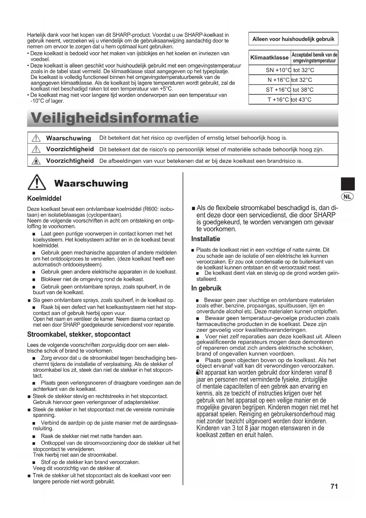 ・71 Veiligheidsinformatie Waarschuwing Hartelijk dank voor het kopen van dit SHARP-product. Voordat u uw SHARP-koelkast in gebruik neemt, verzoeken wij u vriendelijk om de gebruiksaanwijzing aandachtig door te nemen om ervoor te zorgen dat u hem optimaal kunt gebruiken.