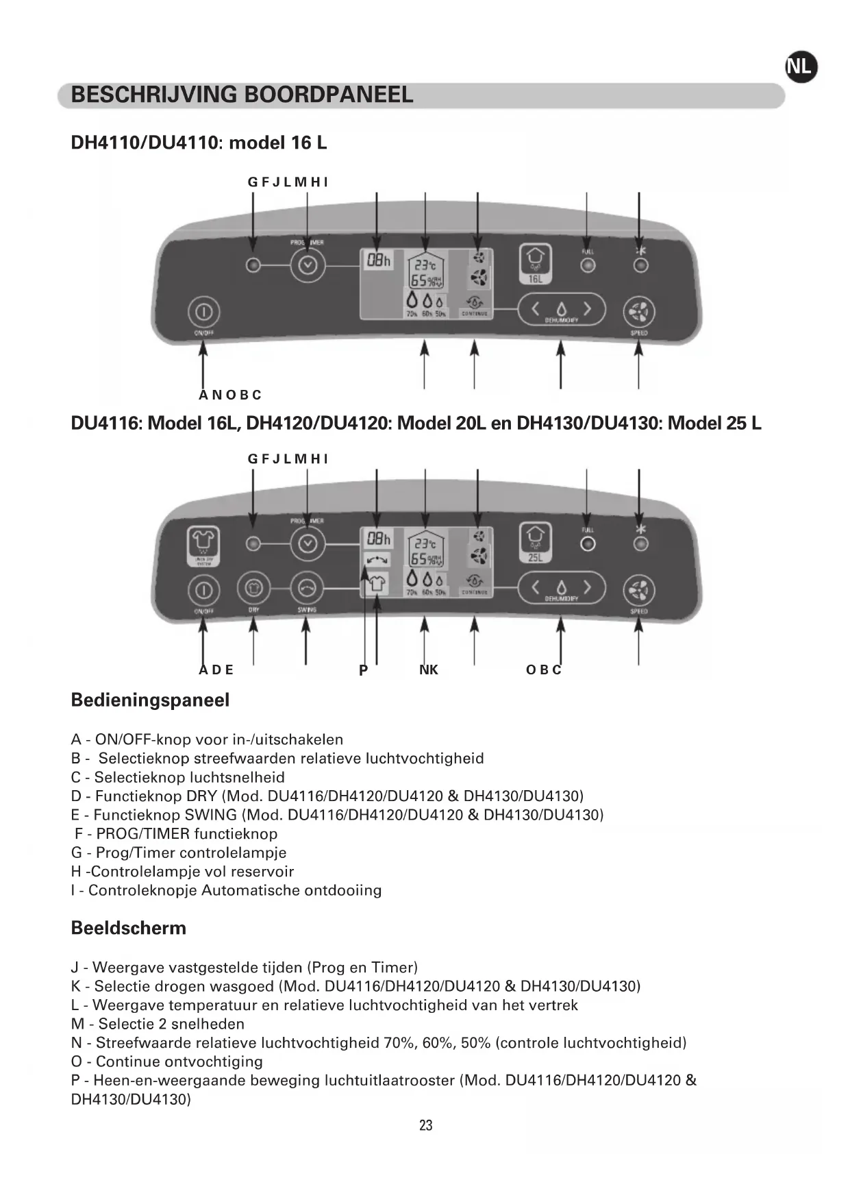 Bedieningspaneel A - ON/OFF-knop voor in-/uitschakelen B - Selectieknop streefwaarden relatieve luchtvochtigheid C - Selectieknop luchtsnelheid D - Functieknop DRY (Mod. DU4116/DH4120/DU4120 & DH4130/DU4130) E - Functieknop SWING (Mod. DU4116/DH4120/DU4120 & DH4130/DU4130) F - PROG/TIMER functieknop G - Prog/Timer controlelampje H -Controlelampje vol reservoir I - Controleknopje Automatische ontdooiing Beeldscherm J - Weergave vastgestelde tijden (Prog en Timer) K - Selectie drogen wasgoed (Mod. DU4116/DH4120/DU4120 & DH4130/DU4130) L - Weergave temperatuur en relatieve luchtvochtigheid van het vertrek M - Selectie 2 snelheden N - Streefwaarde relatieve luchtvochtigheid 70%, 60%, 50% (controle luchtvochtigheid) O - Continue ontvochtiging P - Heen-en-weergaande beweging luchtuitlaatrooster (Mod. DU4116/DH4120/DU4120 & DH4130/DU4130) BESCHRIJVING BOORDPANEEL DH4110/DU4110: model 16 L DU4116: Model 16L, DH4120/DU4120: Model 20L en DH4130/DU4130: Model 25 L G F J L M H I A N O B C G F J L M H I A D E