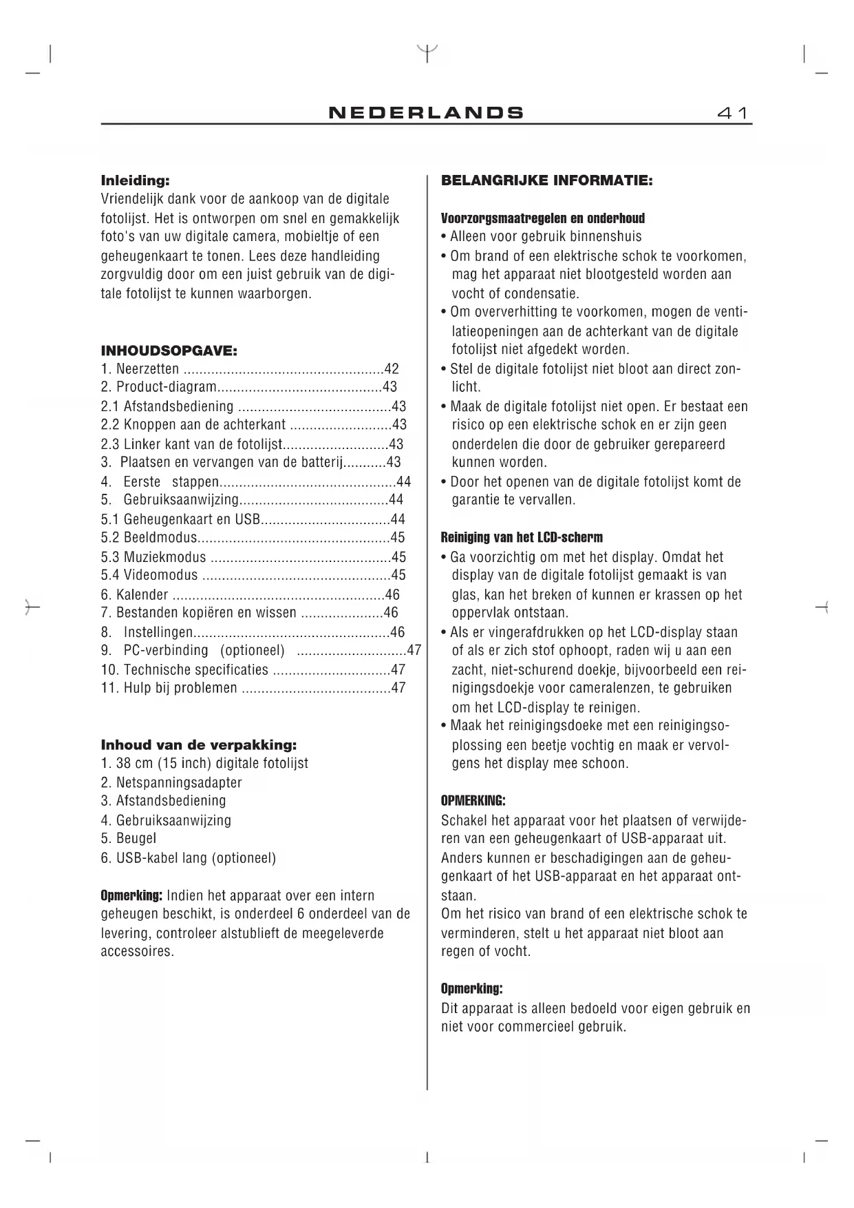 Inleiding: Vriendelijk dank voor de aankoop van de digitale fotolijst. Het is ontworpen om snel en gemakkelijk foto's van uw digitale camera, mobieltje of een geheugenkaart te tonen. Lees deze handleiding zorgvuldig door om een juist gebruik van de digi- tale fotolijst te kunnen waarborgen. INHOUDSOPGAVE: