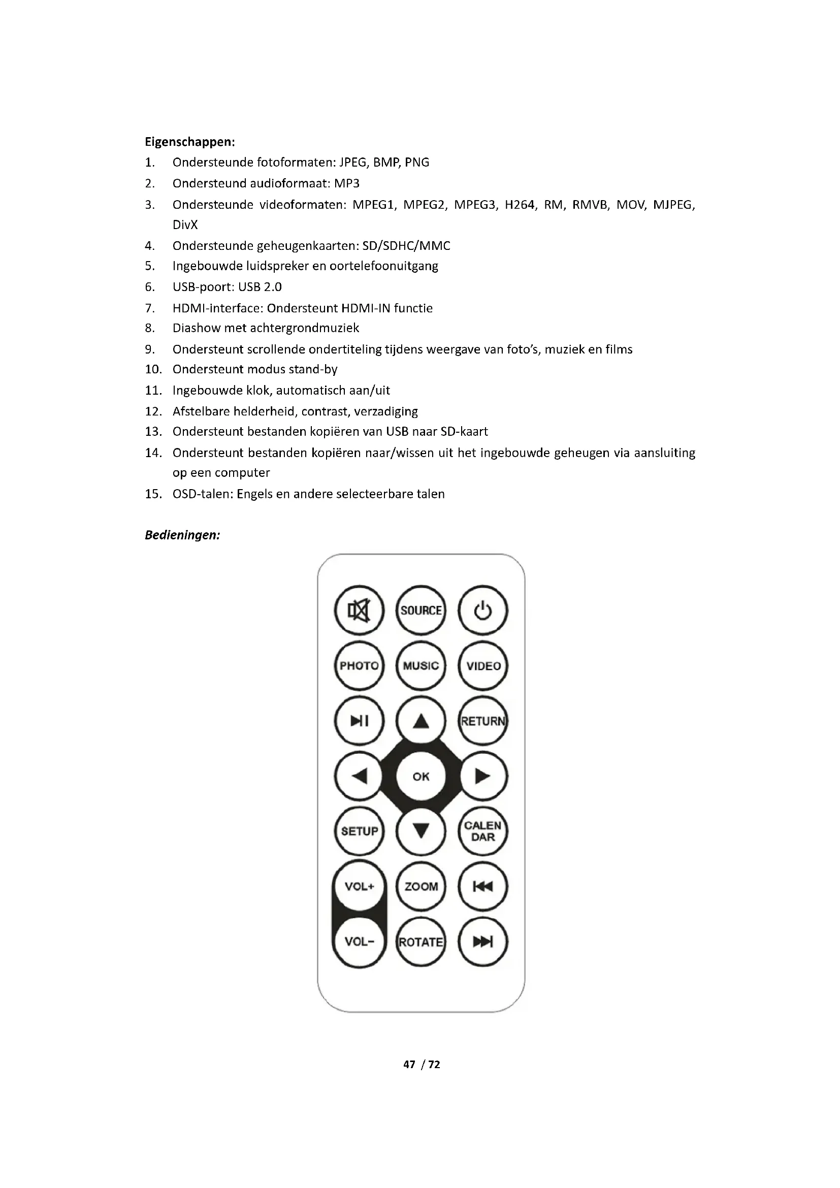 Druk tijdens de fotoweergave op OK om de schermbedieningen weer te geven en selecteer de gewenste functie met : Play, Previous, Next, Stop, Playlist, Zoom in, Zoom out, Move, druk vervolgens ter bevestiging op OK.50 / 72 Muziekmodus Markeer Music in het hoofdmenu, druk op OK om de weer te geven USB 2.0 of geheugenkaart te selecteren en druk op RETURN om terug te keren naar de duimnagelmodus. Druk op om de af te spelen muziek te selecteren en druk ter bevestiging op OK. Muziek Afspelen: Druk tijdens het afspelen van muziek op OK om de schermbedieningen te openen en selecteer de gewenste functie met : Play, Fast Rewind, Fast Forward, Previous, Next, Stop, Mute, Playlist, druk vervolgens ter bevestiging op OK.51 / 72 Videomodus Markeer Video in het hoofdmenu, druk op OK om de weer te geven USB 2.0 of geheugenkaart te selecteren en druk op RETURN om terug te keren naar de duimnagelmodus. Druk op om de af te spelen video te selecteren en druk ter bevestiging op OK. Videoweergave: Druk tijdens de videoweergave op OK om de schermbedieningen weer te geven en selecteer de gewenste functie met : Play, Fast Rewind, Fast Forward, Previous, Next, Stop, Playlist, Aspect en druk vervolgens ter bevestiging op OK.52 / 72 Kopieerfunctie voor foto-, muziek- en videobestanden: Het kopiëren van alle bestanden van een USB-apparaat naar een SD-kaart is ondersteund. Markeer Setting en druk op OK om het Instellingsmenu te openen. Druk op om de optie Setting te selecteren, druk op om Auto Copy te selecteren en in de lijst te zetten en stel de waarde in op On. De voortgang wordt weergegeven. Nadat alle bestanden succesvol zijn gekopieerd, zal de diashow automatisch starten. Opmerking: Zorg ervoor dat de foto-/muziek-/videobestanden zijn opgeslagen in de hoofdfolder van het USB-apparaat en niet in andere folders op de USB. Het kopiëren zal anders mislukken. Aansluiting op pc: U kunt het apparaat aansluiten op externe apparatuur via de USB-kabel om bestanden te kopiëren, wissen of bewerken.