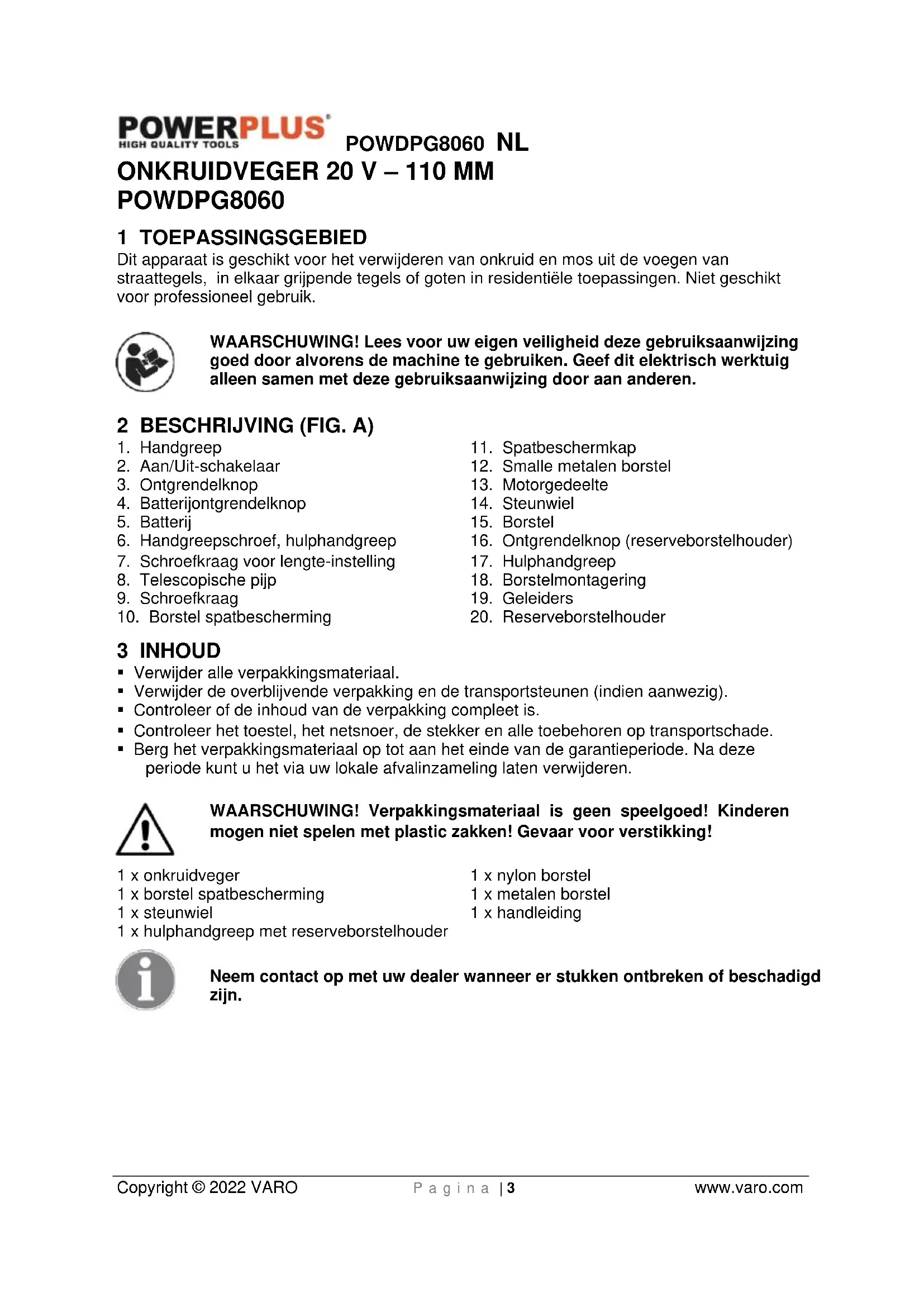 - Berg het verpakkingsmateriaal op tot aan het einde van de garantieperiode. Na deze periode kunt u het via uw lokale afvalinzameling laten verwijderen. WAARSCHUWING! Verpakkingsmateriaal is geen speelgoed! Kinderen mogen niet spelen met plastic zakken! Gevaar voor verstikking! 1 x onkruidveger 1 x borstel spatbescherming 1 x steunwiel 1 x hulphandgreep met reserveborstelhouder 1 x nylon borstel 1 x metalen borstel 1 x handleiding Neem contact op met uw dealer wanneer er stukken ontbreken of beschadigd zijn.POWDPG8060 NL Copyright © 2022 VARO P a g i n a | 4 www.varo.com