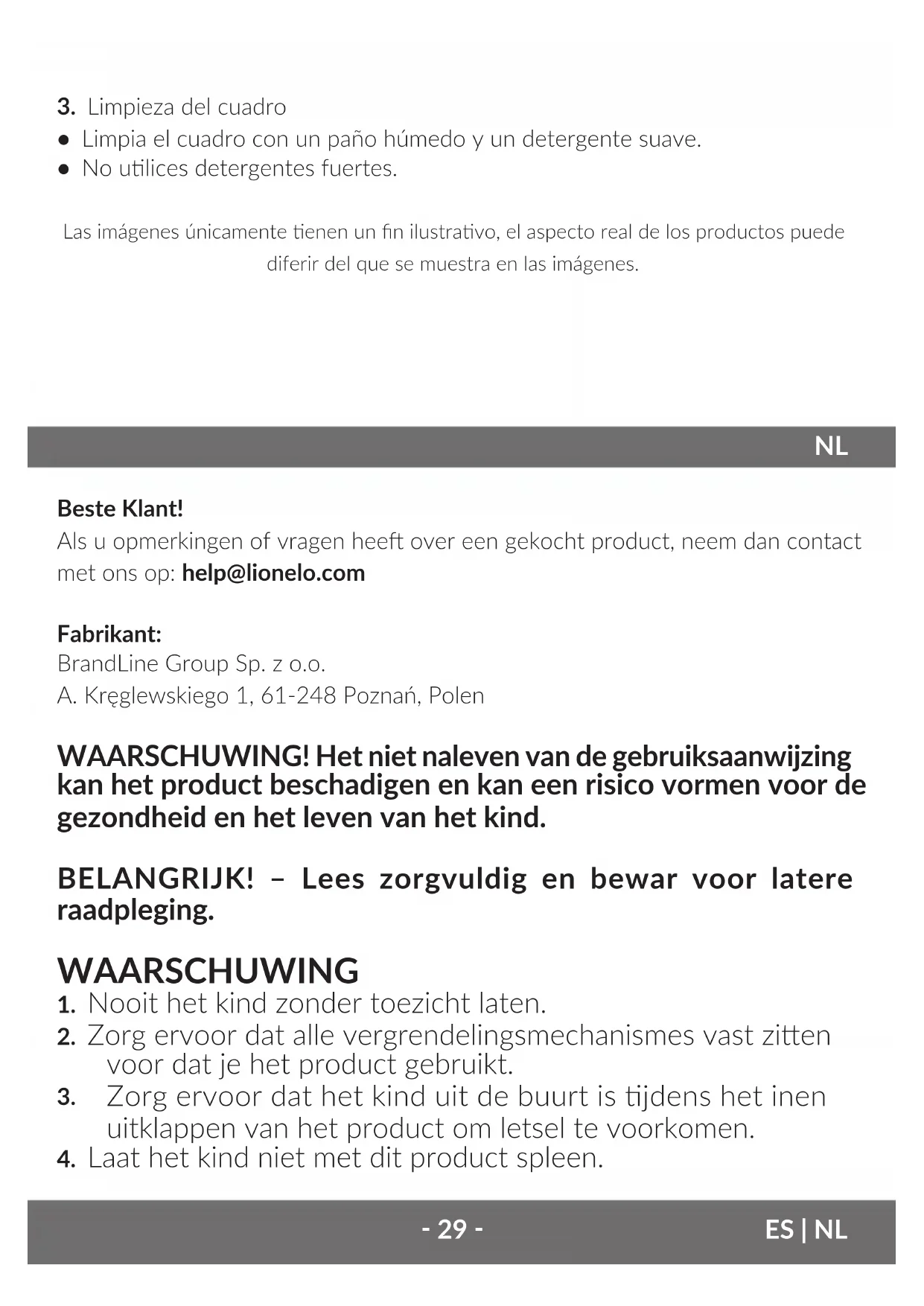 - El material debe estar seco antes de volver a usarlo.‑ 29 ‑ Beste Klant! Als u opmerkingen of vragen hee over een gekocht product, neem dan contact met ons op: help@lionelo.com Fabrikant: BrandLine Group Sp. z o.o. A. Kręglewskiego 1, 61-248 Poznań, Polen WAARSCHUWING! Het niet naleven van de gebruiksaanwijzing kan het product beschadigen en kan een risico vormen voor de gezondheid en het leven van het kind. BELANGRIJK! – Lees zorgvuldig en bewar voor latere raadpleging. WAARSCHUWING
