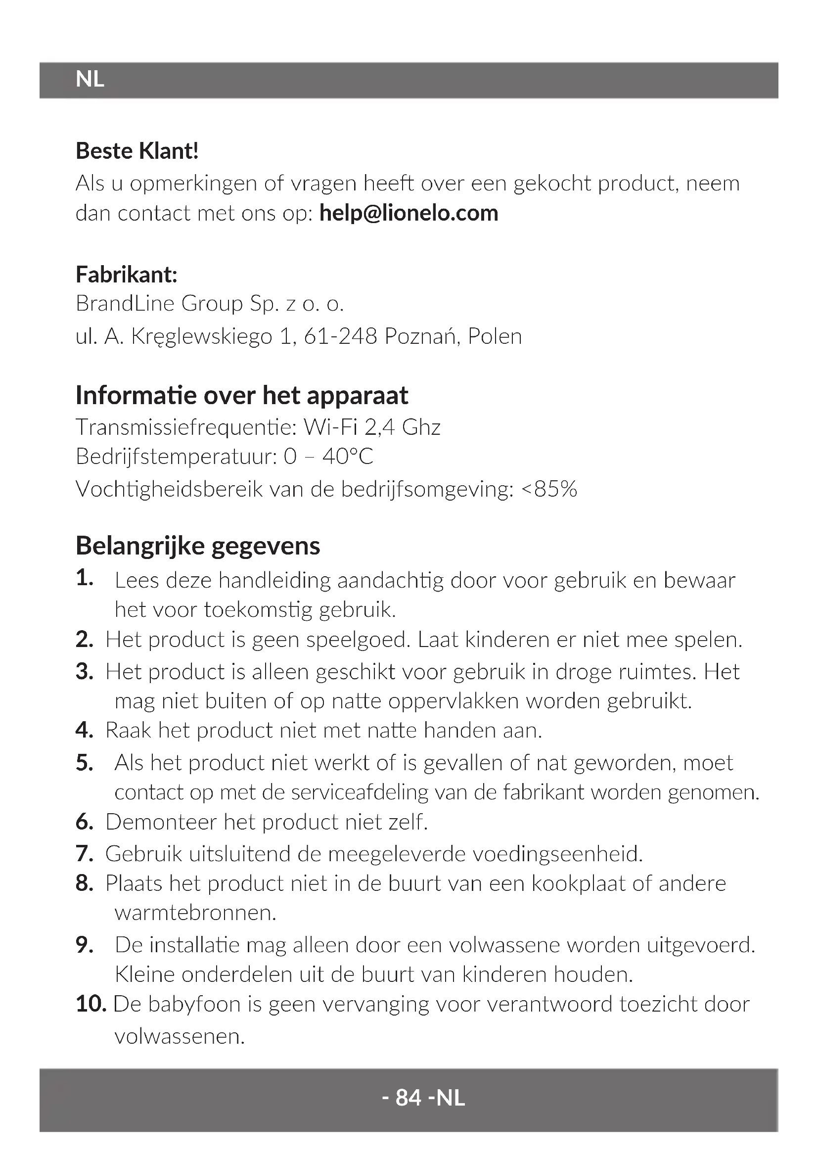 Beste Klant! Als u opmerkingen of vragen hee over een gekocht product, neem dan contact met ons op: help@lionelo.com Fabrikant: BrandLine Group Sp. z o. o. ul. A. Kręglewskiego 1, 61-248 Poznań, Polen Informae over het apparaat Transmissiefrequene: Wi-Fi 2,4 Ghz Bedrijfstemperatuur: 0 – 40°C Vochgheidsbereik van de bedrijfsomgeving: <85% Belangrijke gegevens