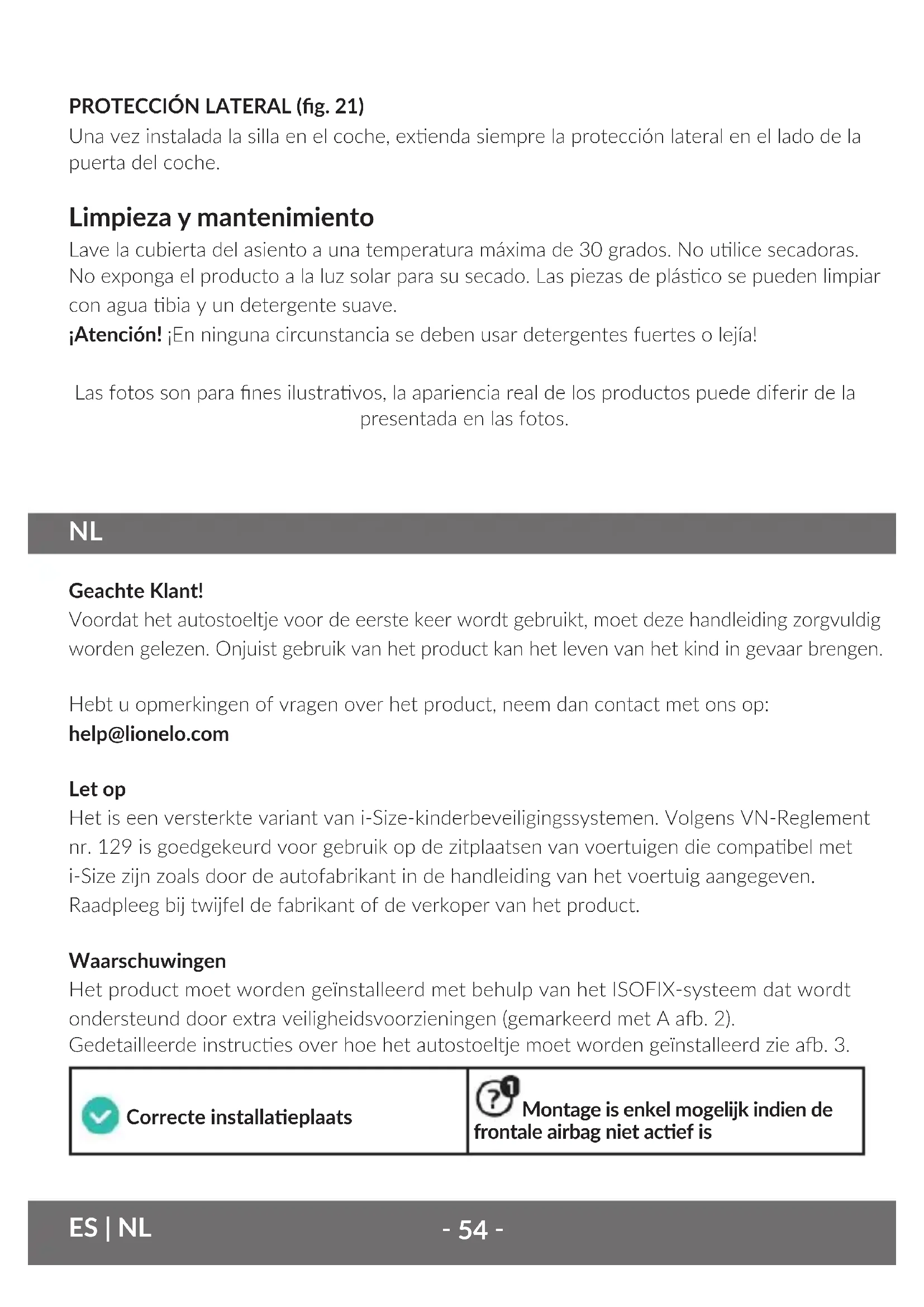 PROTECCIÓN LATERAL (g. 21) Una vez instalada la silla en el coche, exenda siempre la protección lateral en el lado de la puerta del coche. Limpieza y mantenimiento Lave la cubierta del asiento a una temperatura máxima de 30 grados. No ulice secadoras. No exponga el producto a la luz solar para su secado. Las piezas de plásco se pueden limpiar con agua bia y un detergente suave. ¡Atención! ¡En ninguna circunstancia se deben usar detergentes fuertes o lejía! Las fotos son para nes ilustravos, la apariencia real de los productos puede diferir de la presentada en las fotos. Geachte Klant! Voordat het autostoeltje voor de eerste keer wordt gebruikt, moet deze handleiding zorgvuldig worden gelezen. Onjuist gebruik van het product kan het leven van het kind in gevaar brengen. Hebt u opmerkingen of vragen over het product, neem dan contact met ons op: help@lionelo.com Let op Het is een versterkte variant van i-Size-kinderbeveiligingssystemen. Volgens VN-Reglement nr. 129 is goedgekeurd voor gebruik op de zitplaatsen van voertuigen die compabel met i-Size zijn zoals door de autofabrikant in de handleiding van het voertuig aangegeven. Raadpleeg bij twijfel de fabrikant of de verkoper van het product. Waarschuwingen Het product moet worden geïnstalleerd met behulp van het ISOFIX-systeem dat wordt ondersteund door extra veiligheidsvoorzieningen (gemarkeerd met A a. 2). Gedetailleerde instruces over hoe het autostoeltje moet worden geïnstalleerd zie a. 3. Correcte installaeplaats Montage is enkel mogelijk indien de frontale airbag niet acef is