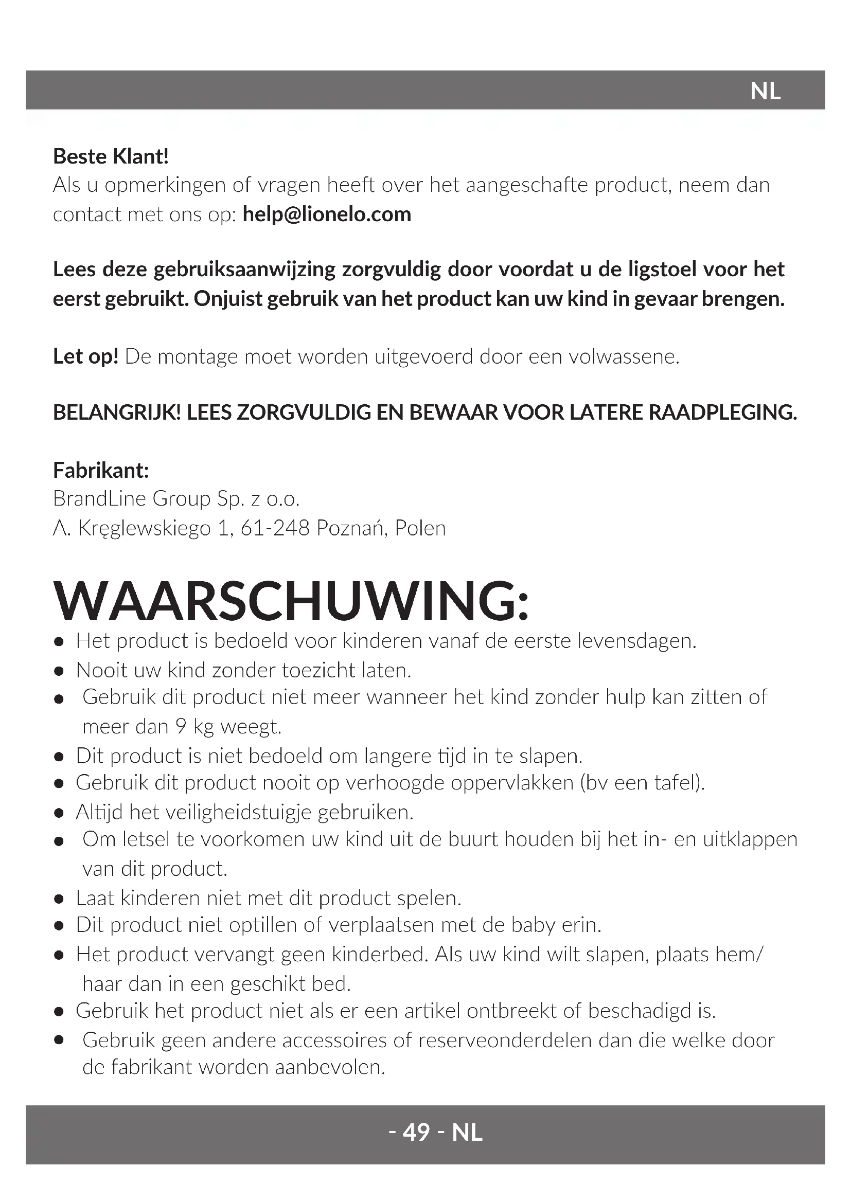 nodig om zich uit te schonmmelen. Bij lage spanning en hoge belasng kan het tot 50 seconden duren voordat de schommel goed zwaait. Vervormde muziek. Baerijen zijn leeg. Vervang de baerijen. De muziek stopt plotseling met spelen. De ingestelde jd is verstreken. Druk nogmaals op de muziekknop. De schommeljd en de muziekafspeeljd instellingen zijn niet met elkaar gecorreleerd. U kunt de instellingen zo aanpassen dat de muziek stopt met spelen wanneer het product blij schommelen of an- dersom. Dit is opzeelijk en is bedoeld om u meer vrijheid te geven om uw instellingen te wijzigen. Reiniging en onderhoud Het kussen, bekleding van het zitje – handwas op maximale temperatuur 40°C. Beugel en frame van het product – veeg af met een vochge, zachte doek en milde zeep. Veeg vervolgens droog. De foto’s dienen alleen ter illustrae, het werkelijke uiterlijk van de producten kan afwijken van de foto’s.‑ 55 ‑ LT Gerbiamas Kliente! Jei turite pastabų ar klausimų apie įsigytą produktą, nedvejodami susisiekite su mumis: help@lionelo.com Prieš pirmą kartą naudodami gultuką, adžiai perskaitykite šias naudojimo instrukcijas. Nenkamas produkto naudojimas gali kel pavojų vaikui. Dėmesio! Montavimą turi atlik suaugęs asmuo. SVARBU! ATIDŽIAI PERSKAITYKITE IR SAUGOKITE, KAD VĖLIAU GALĖTUMĖTE PASISKAITYTI. Gamintojas: BrandLine Group Sp. z o. o. A. Kręglewskiego 1, 61-248 Poznanė, Lenkija ĮSPĖJIMAS: