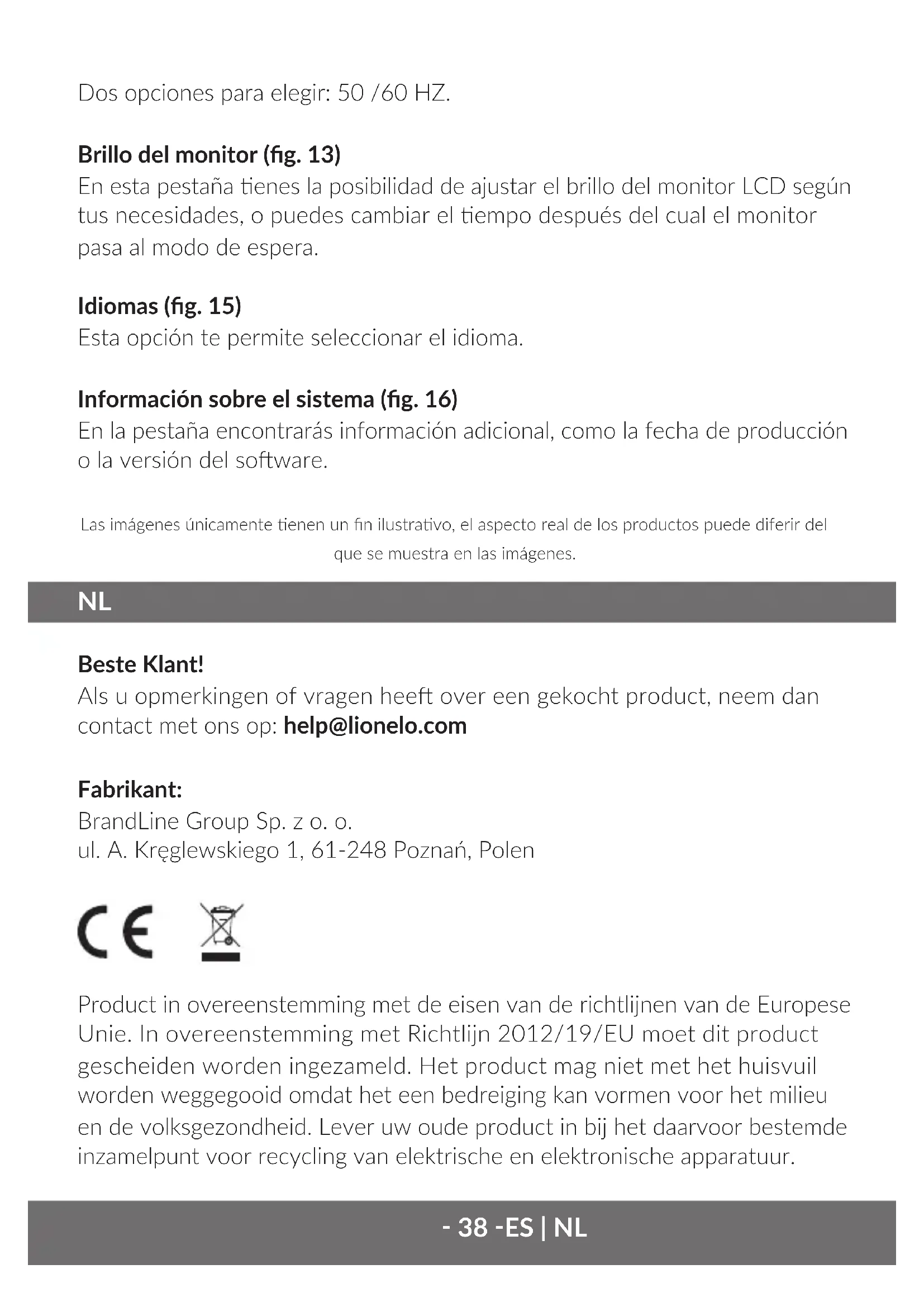 Beste Klant! Als u opmerkingen of vragen hee over een gekocht product, neem dan contact met ons op: help@lionelo.com Fabrikant: BrandLine Group Sp. z o. o. ul. A. Kręglewskiego 1, 61-248 Poznań, Polen Product in overeenstemming met de eisen van de richtlijnen van de Europese Unie. In overeenstemming met Richtlijn 2012/19/EU moet dit product gescheiden worden ingezameld. Het product mag niet met het huisvuil worden weggegooid omdat het een bedreiging kan vormen voor het milieu en de volksgezondheid. Lever uw oude product in bij het daarvoor bestemde inzamelpunt voor recycling van elektrische en elektronische apparatuur. Dos opciones para elegir: 50 /60 HZ. Brillo del monitor (g. 13) En esta pestaña enes la posibilidad de ajustar el brillo del monitor LCD según tus necesidades, o puedes cambiar el empo después del cual el monitor pasa al modo de espera. Idiomas (g. 15) Esta opción te permite seleccionar el idioma. Información sobre el sistema (g. 16) En la pestaña encontrarás información adicional, como la fecha de producción o la versión del soware. Las imágenes únicamente enen un n ilustravo, el aspecto real de los productos puede diferir del que se muestra en las imágenes.‑ 39 ‑ NL‑ 39 ‑‑ 39 ‑ NL Beschrijving van het product De set bevat: