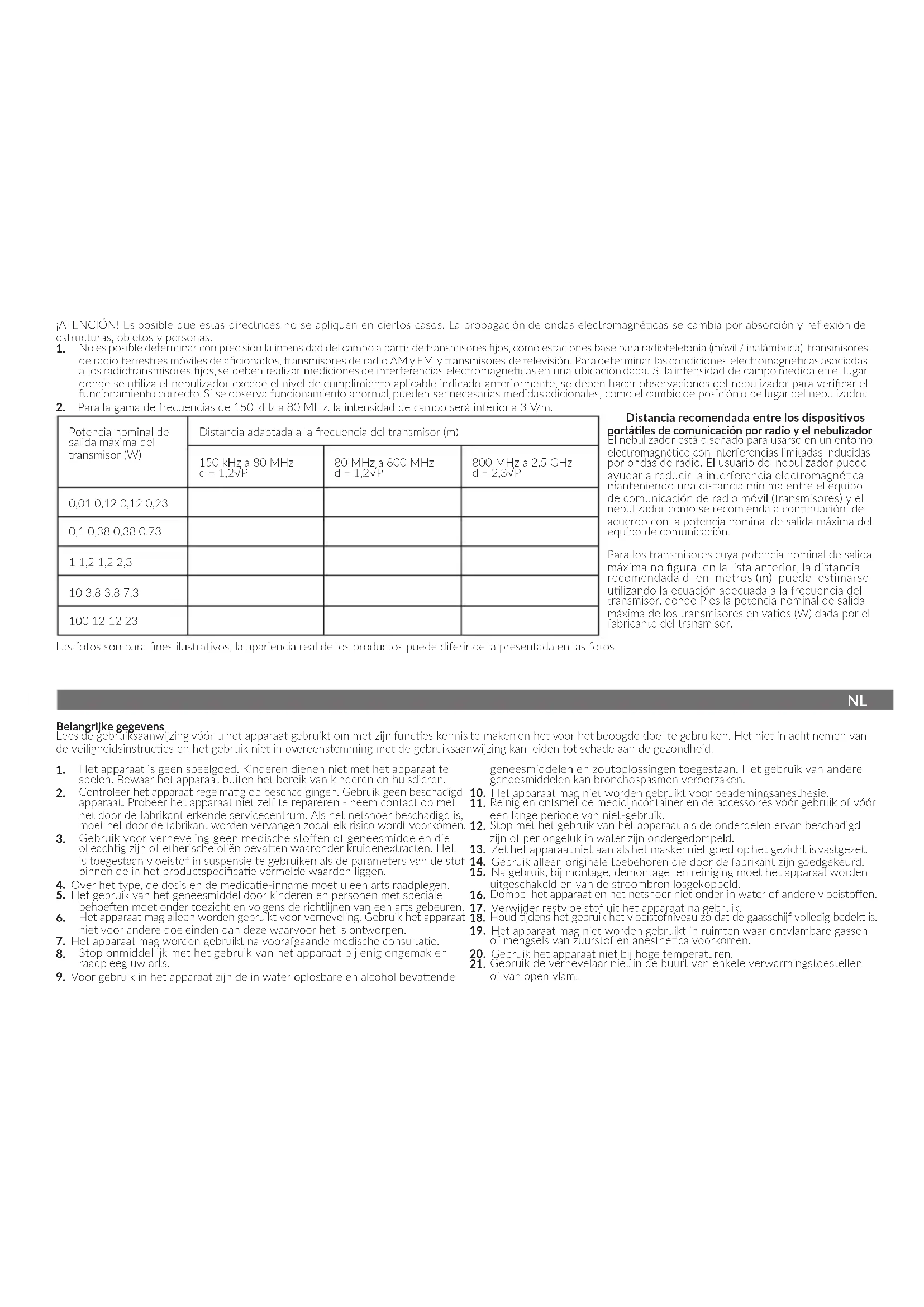 De aanbevolen afstand tussen draagbare en mobiele RF-communicaeapparatuuren en de vernevelaar De vernevelaar is bedoeld voor gebruik in een elektromagnesche omgeving. De klant of gebruiker van de vernevelaar kan elektromagnesche interferene helpen voorkomen door een minimumafstand tussen draagbare en mobiele RF-communicaeapparatuur (zenders) en de vernevelaar aan te houden. Hieronder wordt uiteengezet hoede aanbevolen afstand wordt vastgesteld op basis van het maximumvermogen van de communicaeapparatuur. Voor zenders met een nominaal maximumvermogen dat niet in de tabel is opgenomen, kan de aanbevolen tussenafstand d in meters (m) worden geschat met behulp van de vergelijking die van toepassing is op de zenderfrequentie, waarbij P staat voor het nominale maximumvermogen van de zender in wa (W) volgens opgave van de zenderfabrikant De aeeldingen dienen alleen ter illustrae, het werkelijke uiterlijk van de producten kan van het uiterlijk op de aeeldingen verschillen.Svarbi informacija Prieš pradėdami naudo gaminį, perskaitykite šią instrukciją, kad susipažintų su jo funkcijomis ir naudotųsi pagal paskir. Jei nesilaikysite saugos nurodymų ir instrukcijų, galite pakenk sveikatai.