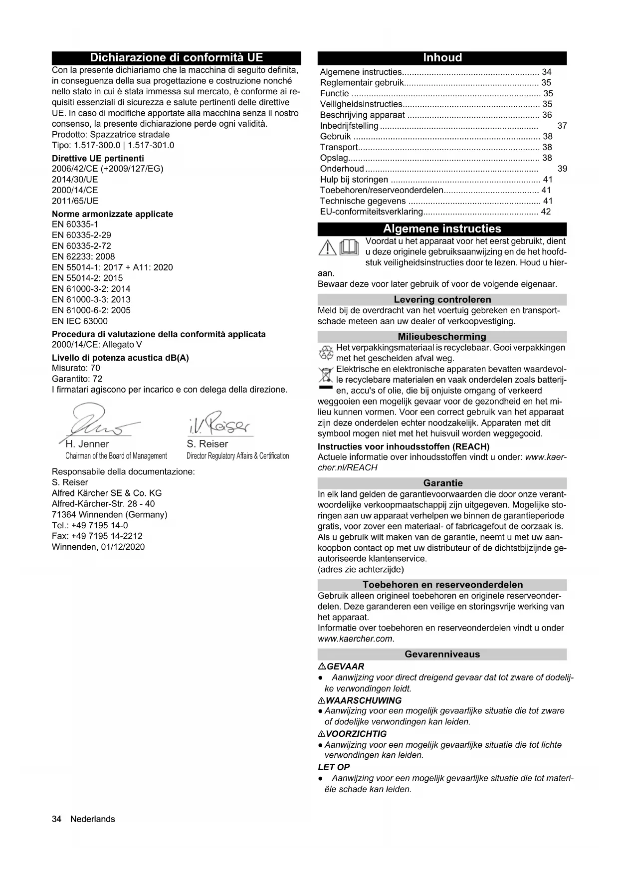- dB(A) 234 Nederlands Dichiarazione di conformità UE Con la presente dichiariamo che la macchina di seguito definita, in conseguenza della sua progettazione e costruzione nonché nello stato in cui è stata immessa sul mercato, è conforme ai re- quisiti essenziali di sicurezza e salute pertinenti delle direttive UE. In caso di modifiche apportate alla macchina senza il nostro consenso, la presente dichiarazione perde ogni validità. Prodotto: Spazzatrice stradale Tipo: 1.517-300.0 | 1.517-301.0 Direttive UE pertinenti 2006/42/CE (+2009/127/EG) 2014/30/UE 2000/14/CE 2011/65/UE Norme armonizzate applicate EN 60335-1 EN 60335-2-29 EN 60335-2-72 EN 62233: 2008 EN 55014-1: 2017 + A11: 2020 EN 55014-2: 2015 EN 61000-3-2: 2014 EN 61000-3-3: 2013 EN 61000-6-2: 2005 EN IEC 63000 Procedura di valutazione della conformità applicata 2000/14/CE: Allegato V Livello di potenza acustica dB(A) Misurato: 70 Garantito: 72 I firmatari agiscono per incarico e con delega della direzione. Responsabile della documentazione: S. Reiser Alfred Kärcher SE & Co. KG Alfred-Kärcher-Str. 28 - 40 71364 Winnenden (Germany) Tel.: +49 7195 14-0 Fax: +49 7195 14-2212 Winnenden, 01/12/2020 Inhoud Algemene instructies Voordat u het apparaat voor het eerst gebruikt, dient u deze originele gebruiksaanwijzing en de het hoofd- stuk veiligheidsinstructies door te lezen. Houd u hier- aan. Bewaar deze voor later gebruik of voor de volgende eigenaar. Levering controleren Meld bij de overdracht van het voertuig gebreken en transport- schade meteen aan uw dealer of verkoopvestiging. Milieubescherming Het verpakkingsmateriaal is recyclebaar. Gooi verpakkingen met het gescheiden afval weg. Elektrische en elektronische apparaten bevatten waardevol- le recyclebare materialen en vaak onderdelen zoals batterij- en, accu's of olie, die bij onjuiste omgang of verkeerd weggooien een mogelijk gevaar voor de gezondheid en het mi- lieu kunnen vormen. Voor een correct gebruik van het apparaat zijn deze onderdelen echter noodzakelijk. Apparaten met dit symbool mogen niet met het huisvuil worden weggegooid. Instructies voor inhoudsstoffen (REACH) Actuele informatie over inhoudsstoffen vindt u onder: www.kaer- cher.nl/REACH Garantie In elk land gelden de garantievoorwaarden die door onze verant- woordelijke verkoopmaatschappij zijn uitgegeven. Mogelijke sto- ringen aan uw apparaat verhelpen we binnen de garantieperiode gratis, voor zover een materiaal- of fabricagefout de oorzaak is. Als u gebruik wilt maken van de garantie, neemt u met uw aan- koopbon contact op met uw distributeur of de dichtstbijzijnde ge- autoriseerde klantenservice. (adres zie achterzijde) Toebehoren en reserveonderdelen Gebruik alleen origineel toebehoren en originele reserveonder- delen. Deze garanderen een veilige en storingsvrije werking van het apparaat. Informatie over toebehoren en reserveonderdelen vindt u onder www.kaercher.com. Gevarenniveaus GEVAAR ● Aanwijzing voor direct dreigend gevaar dat tot zware of dodelij- ke verwondingen leidt. 몇 WAARSCHUWING ● Aanwijzing voor een mogelijk gevaarlijke situatie die tot zware of dodelijke verwondingen kan leiden. 몇 VOORZICHTIG ● Aanwijzing voor een mogelijk gevaarlijke situatie die tot lichte verwondingen kan leiden. LET OP ● Aanwijzing voor een mogelijk gevaarlijke situatie die tot materi- ële schade kan leiden. Chairman of the Board of Management Director Regulatory Affairs & Certification H. Jenner S. Reiser Algemene instructies p. 34